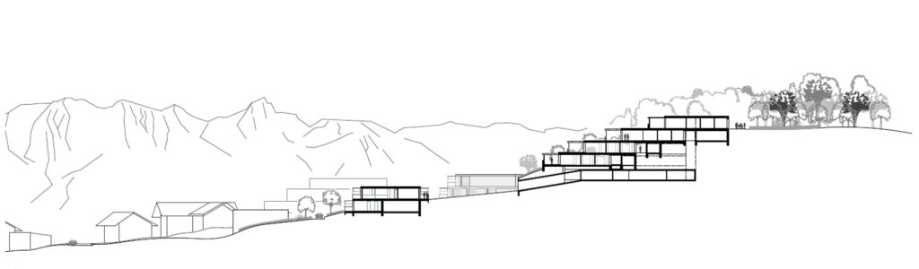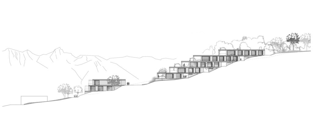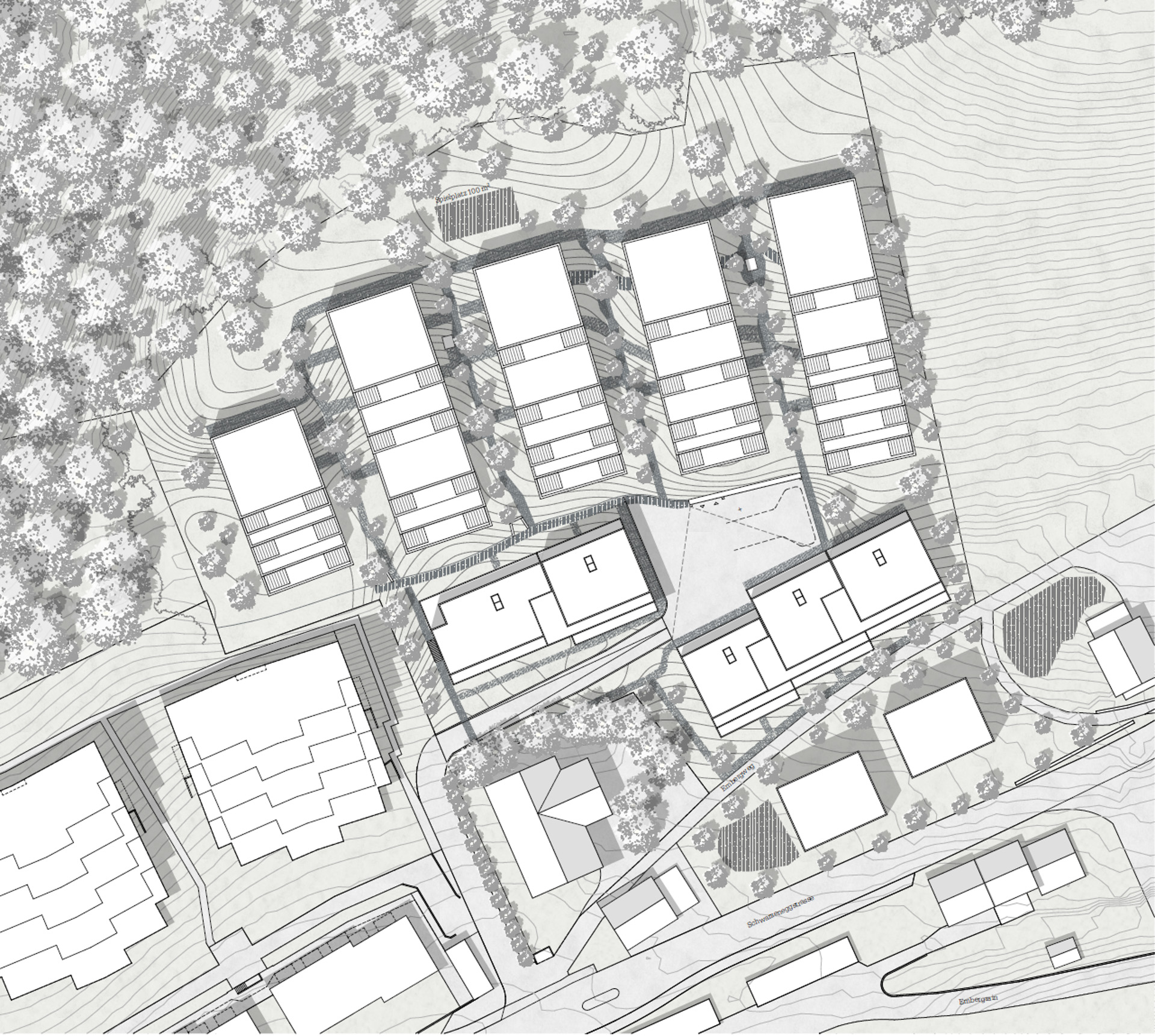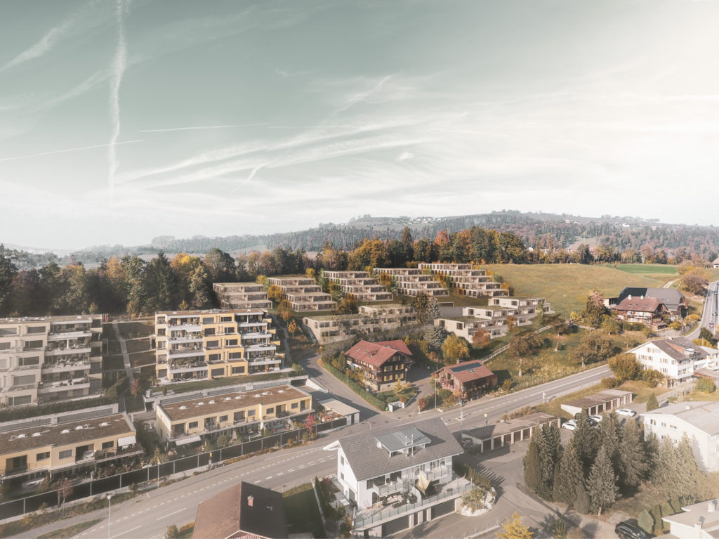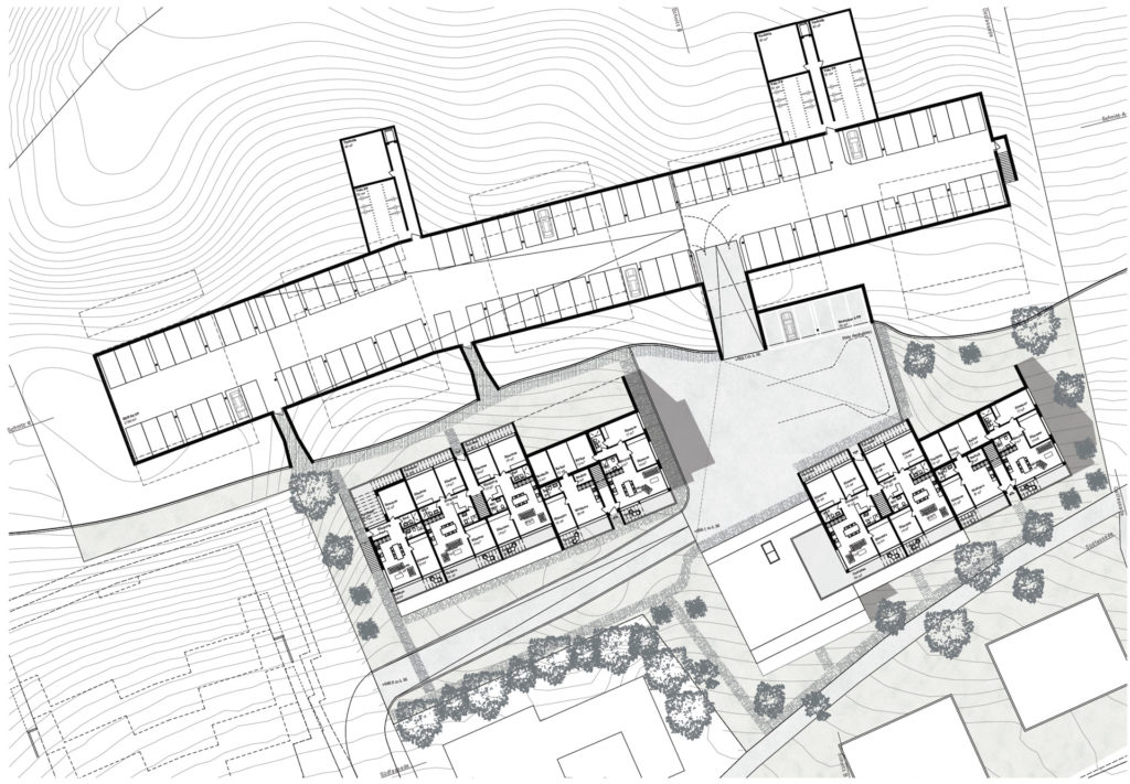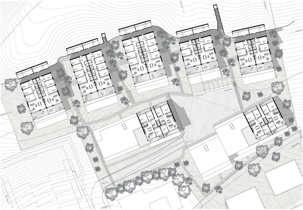 Die Südhanglage stellt das Projekt vor Herausforderungen. Das Grundstück steigt sowohl in Richtung Hang, als auch mit dem Strassenverlauf in mehreren Richtungen an. Ortsbaulich wird der Entwurf durch die vorgegebene Erschliessungsanbindung in verschiedene Bereiche unterteilt. Vom Eichelackerweg – welcher zusammen mit der Überbauung ‘Eichelacker West’ erstellt wurde –, führt eine neue zentrale Strasse zum Siedlungsplatz und teilt das Grundstück in zwei Teile. Die Eigentumswohnungen – gebildet durch fünf Terrassenhäuser- gliedern sich im oberen Bereich des Eichelackers ein, während sich die Mietwohnungen – gebildet durch zwei Terrassenhäuser- im unteren Bereich der Parzelle vorfinden. Somit bildet man gegenüber dem Embergweg einen gelungenen Abschluss, integriert diesen in das Projekt und erzeugt eine neue Adresse zum Strassenraum.