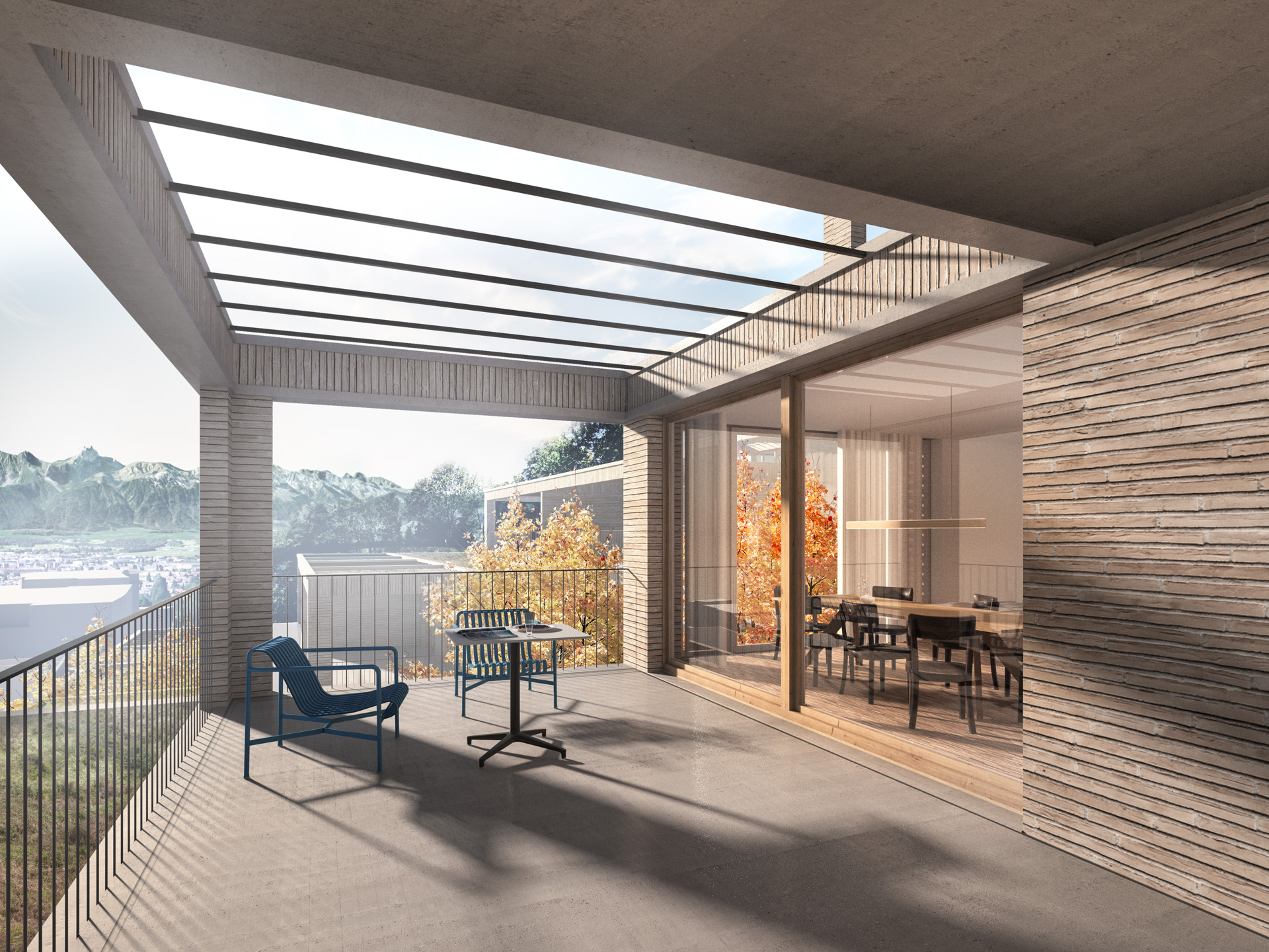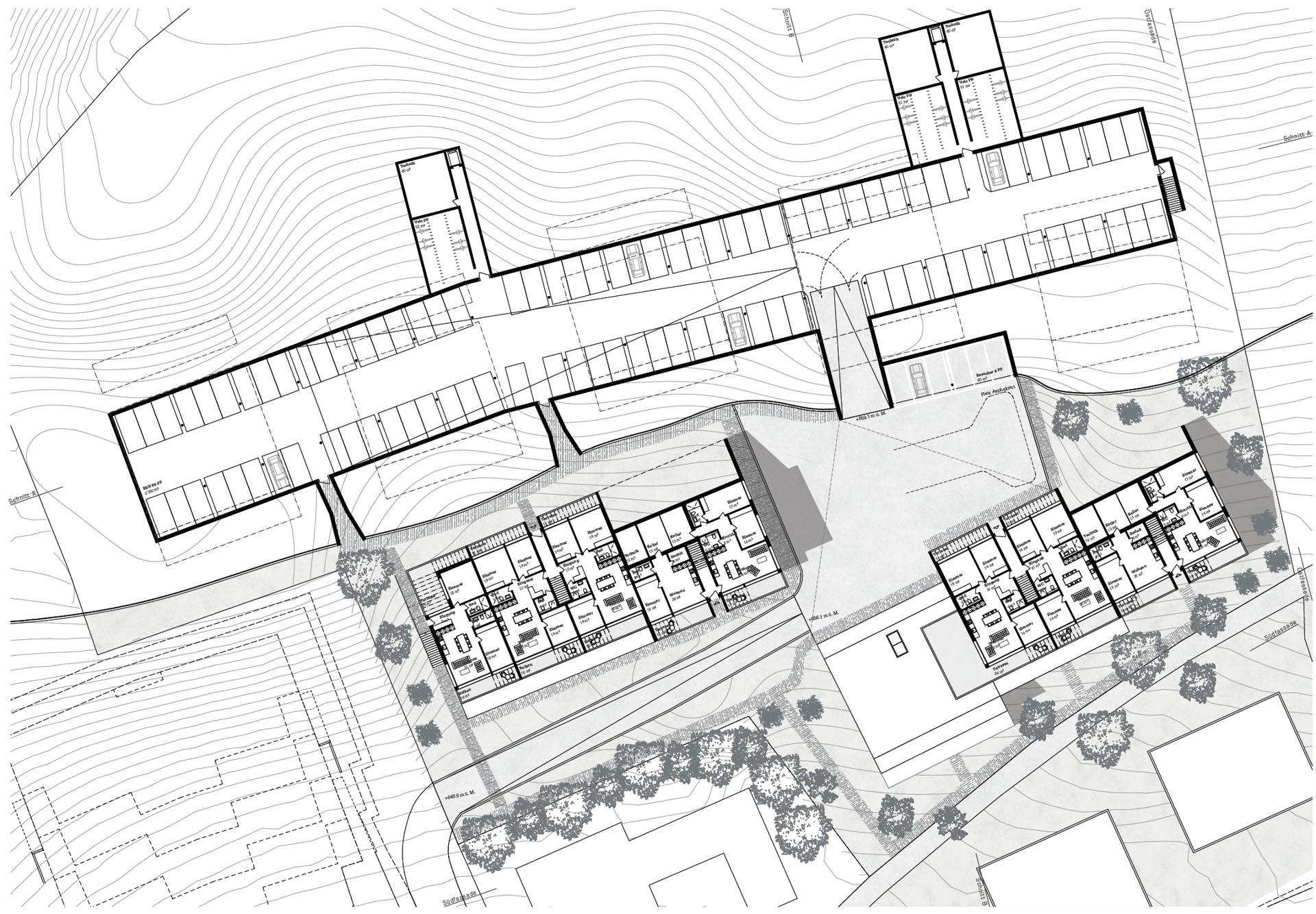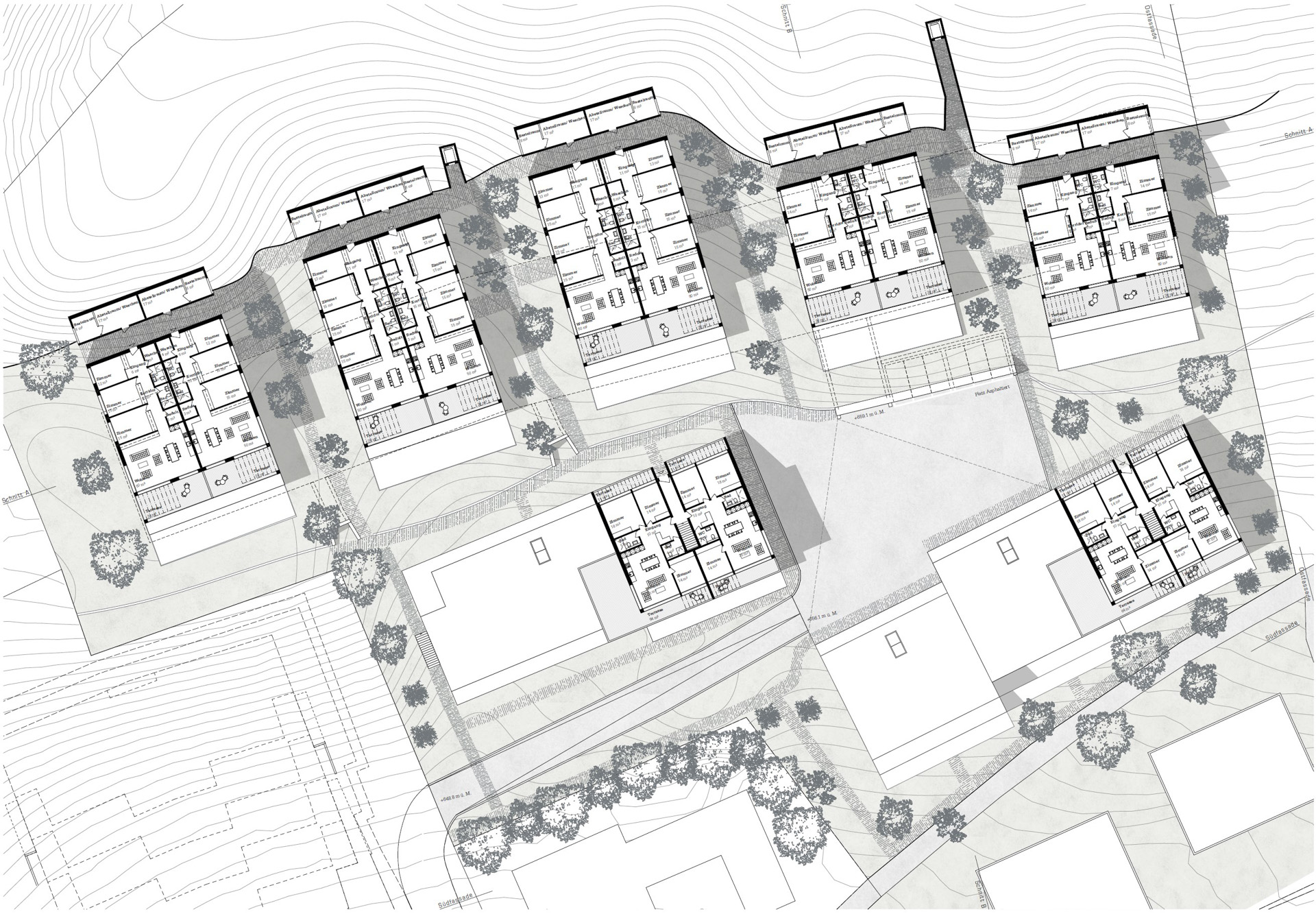 Der Siedlungsplatz bildet das Herzstück der Siedlung. Dieser sorgt nicht nur für eine Ankunftssituation für Bewohner und Besucher, sondern dient ebenfalls als Treffpunkt und sorgt für die Verteilung und Orientierung in der Siedlung. Vom Platzniveau aus gelangt man sowohl in die Einstellhalle wie in die entsprechenden Wohnungen. Die beiden Lifte dienen als Verbindung der Eigentumswohnungen zwischen den unterschiedlichen Niveaus. Vom jeweiligen Niveau aus gelangt man über die aussenliegenden Siedlungswege zu den entsprechenden Wohnungen und verbindet diese auf eine wirtschaftliche Art und Weise.