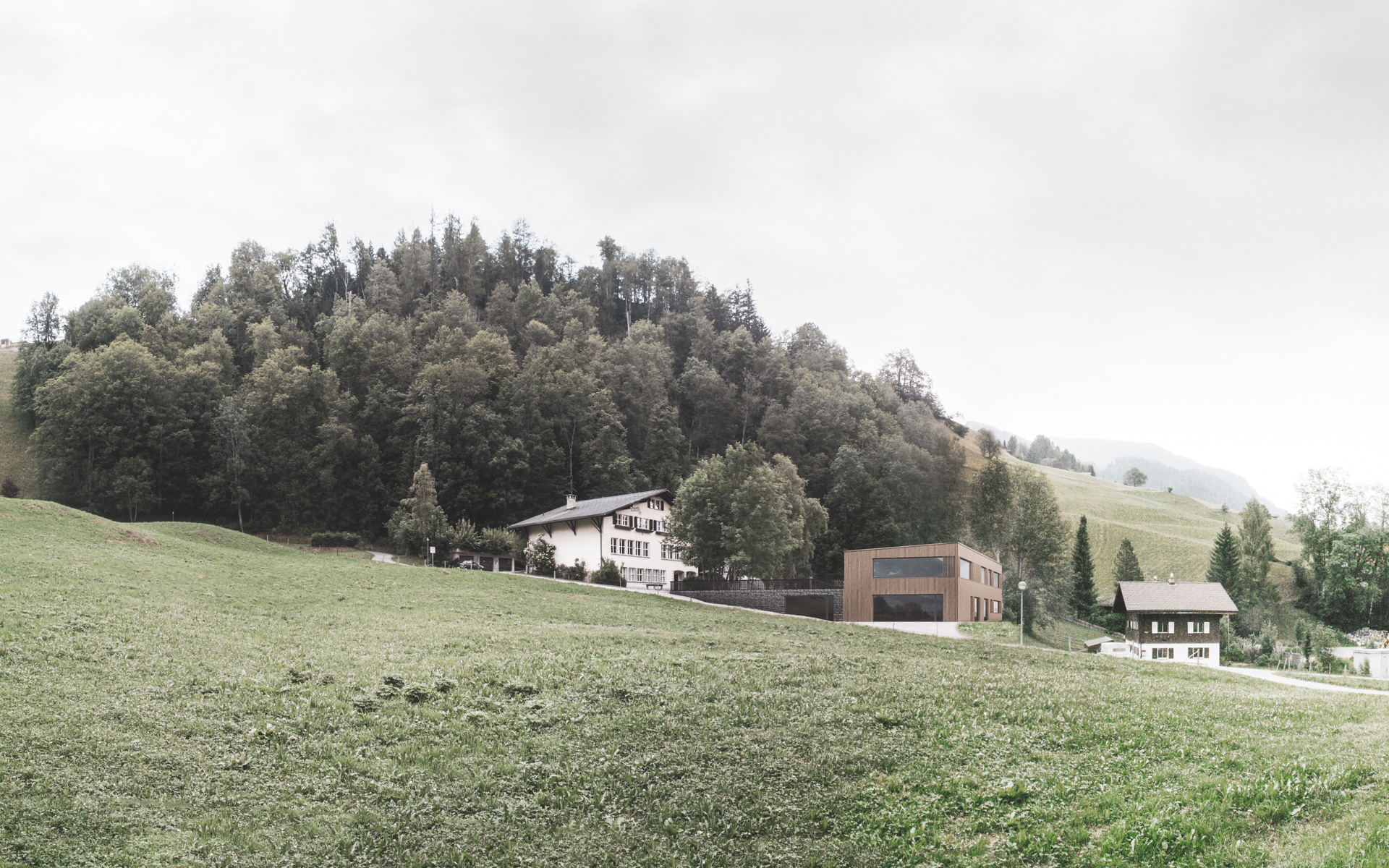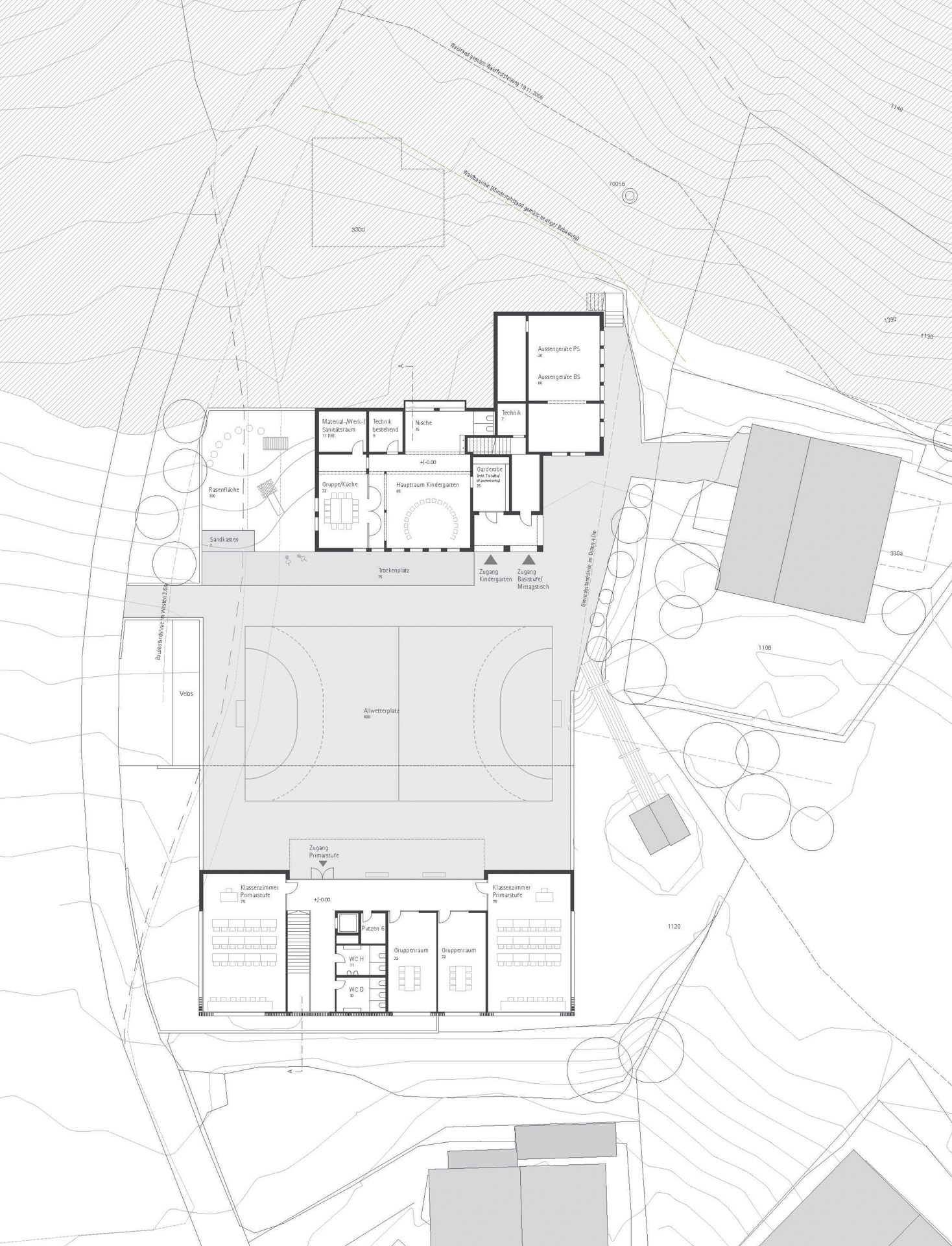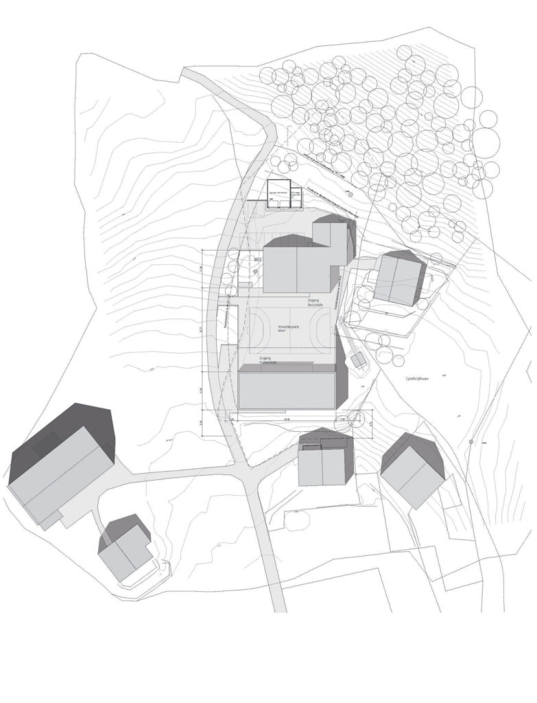 Die Umgebung ist stark geprägt durch das Spannungsfeld zwischen dem fliessenden Hang, dem Wald, der lockeren Bebauung und den angrenzenden Bergwiesen. Die Positionierung des Baukörpers am Standort vom Altbau schafft grosse Freiräume mit einem engen Bezug zur Umgebung, sowie zur übergeordneten Landschaft (Ausblicke). Der ruhige, gefasste Innenhof zwischen den Bauten dient als Hartplatz, und Pausenplatz. Es entsteht ein unverwechselbarer Ort mit hohem Stimmungsgehalt, welcher zum Verweilen einlädt.
