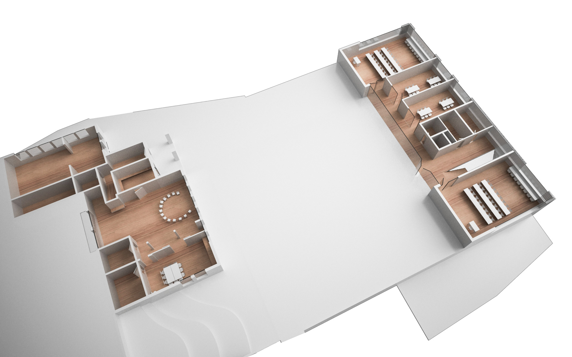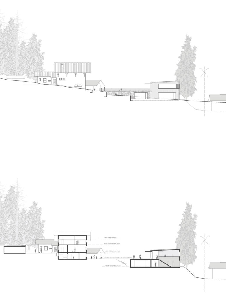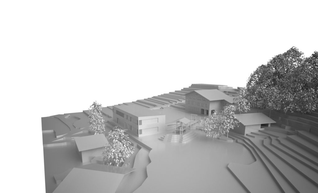 Die Umbauvariante sieht einen freistehenden Erweiterungsbau vor, welcher in Form eines Riegels die südliche Abgrenzung des Schulareals vornimmt. Die genaue Platzierung lässt dem bestehenden Schulgebäude genügend Freiraum und fasst den Schulhof. Der zweigeschossige Annexbau fügt sich sanft in die abgestufte Topographie.