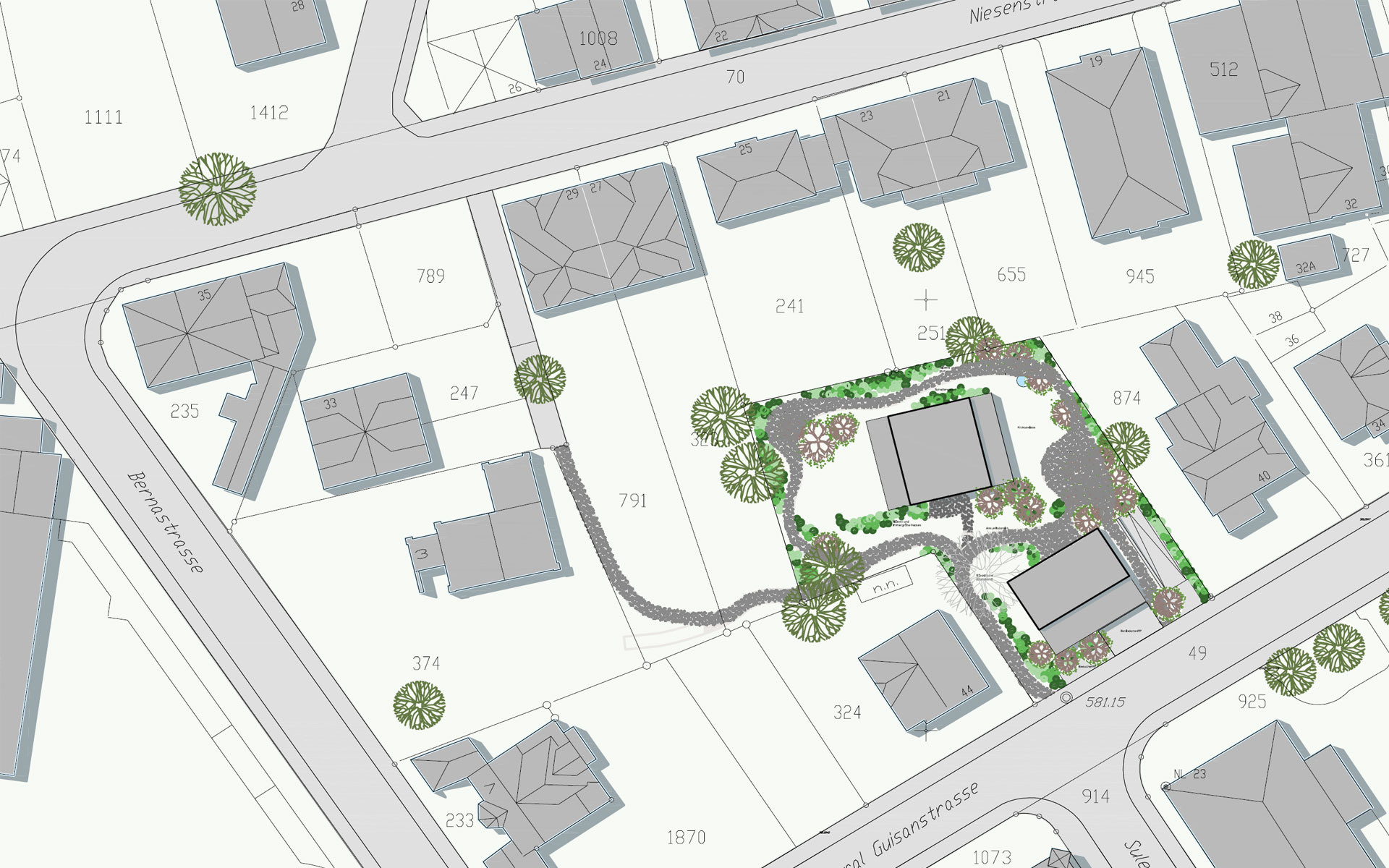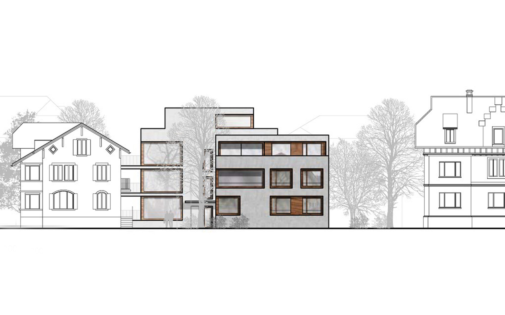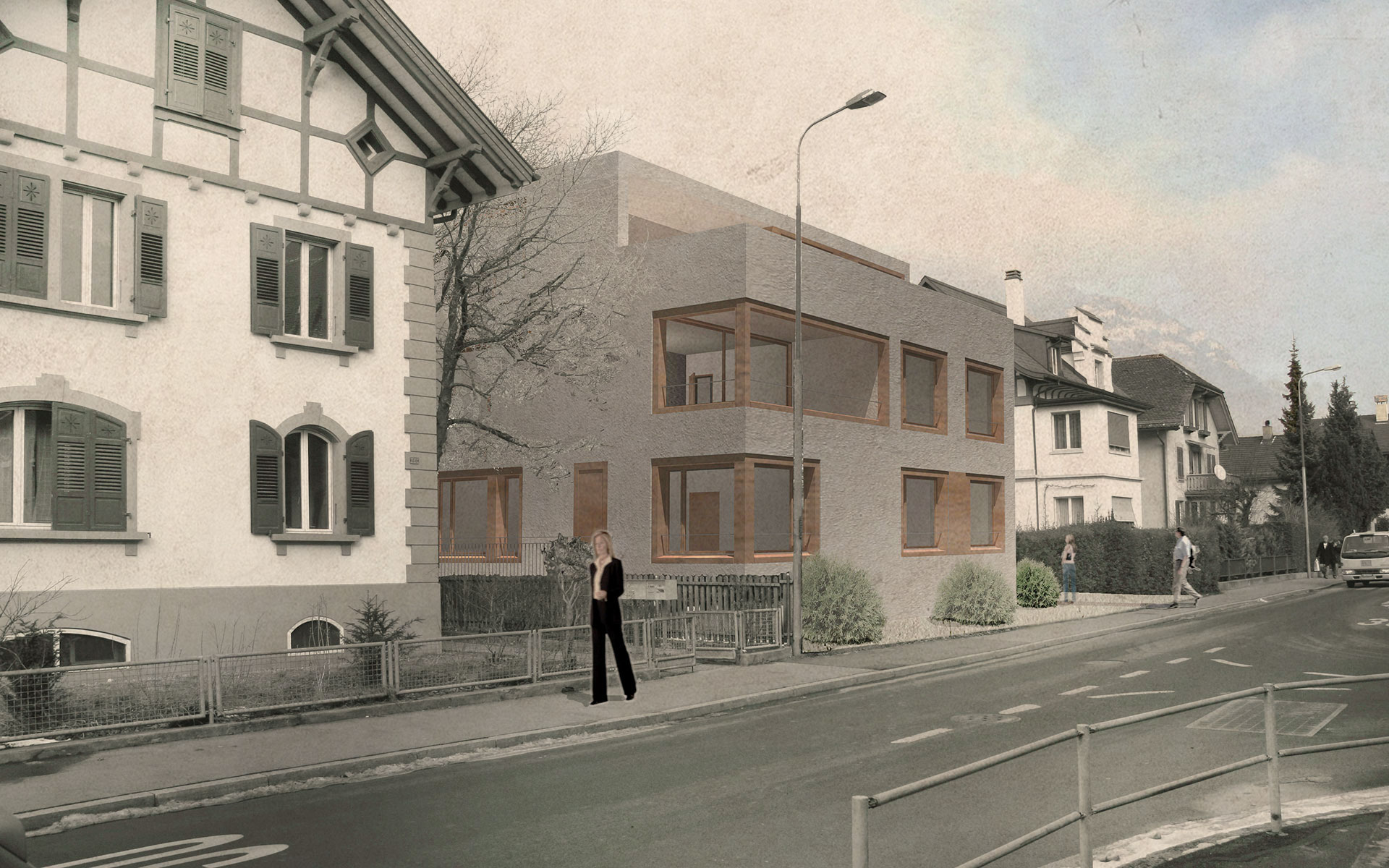 Auf dem Grundstück der Kirchgemeinde Gsteig-Interlaken wird an der General-Guisanstrasse ein neues Pfarrhaus erstellt. Der rückwärtige Teil des Grundstücks wird für eine Wohnnutzung frei und wurde im Rahmen eines Architekturwettbewerbs gemeinsam mit dem Pfarrhaus beplant. Das Resultat ist eine Stadtvilla mit drei unterschiedlichen Eigentumswohnungen. Die General-Guisanstrasse ist eine Quartierstrasse der Gründerzeit. Mit Hecken, Sträucher und Gräser begrünte Grundstücke mit altem Baumbestand bilden den Boden für solitäre zwei bis drei geschossige Wohnhäuser. Üppig mit Aufbauten bestückte Dächer und viele additive Elemente wie Erker und Türmchen in den Fassaden erzeugen eine malerische Atmosphäre. Die Vorgartenzone bildet jeweils den Übergang zwischen Strasse und Fassade. Der Perimeter schliesst stirnseitig an die Strasse an und greift privilegiert bis in den Grünraum hintern den bestehenden Häusern.