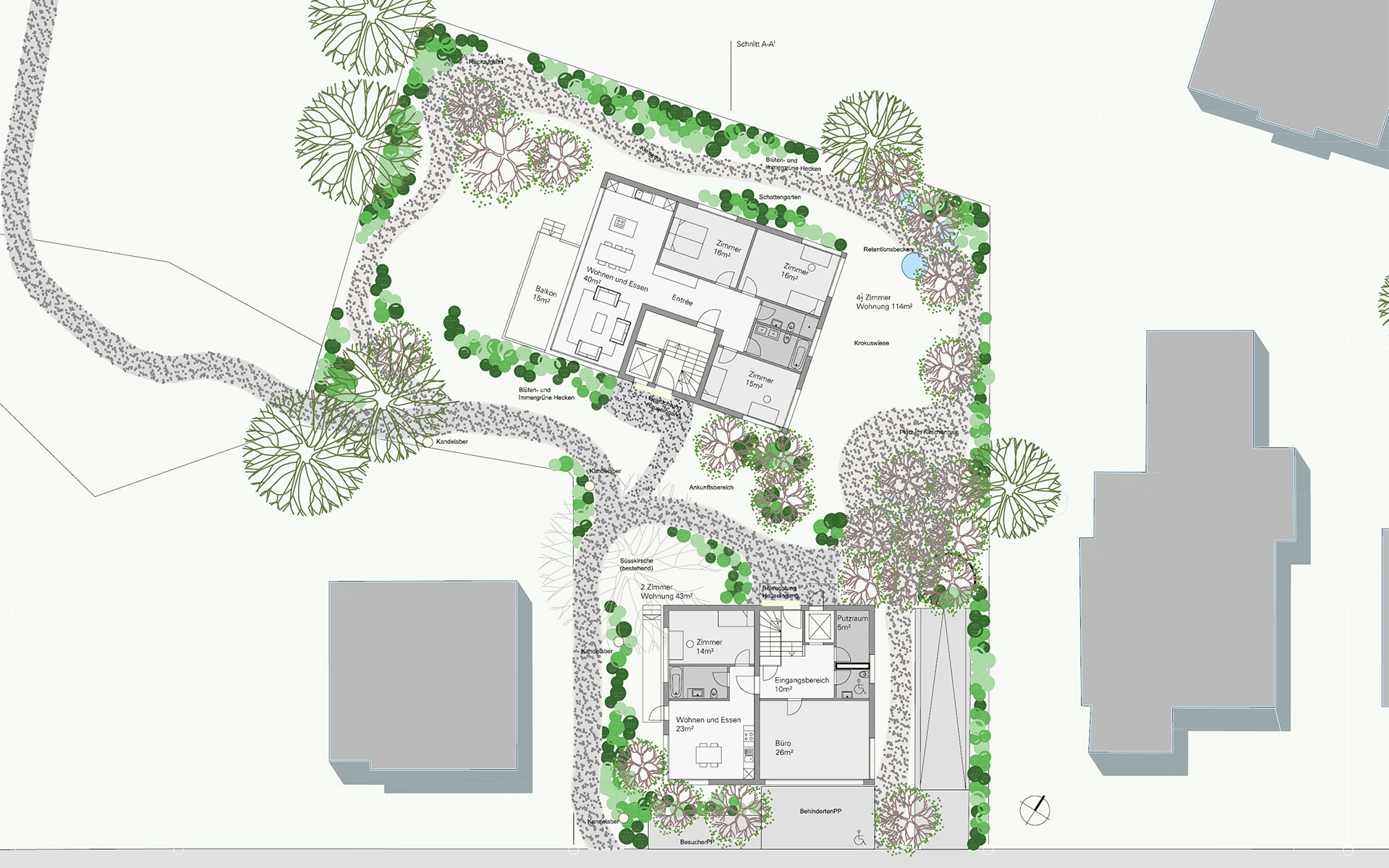 Leitmotiv des Gartens ist der prächtige Kirschbaum: Ihm werden weitere Kirschen-Arten und -sorten zugesellt, die durch ihren unterschiedlichen Wuchs, ihre verschiedenen Blütenzeitpunkte, -farben immer andere Akzente setzen. Die Anordnung der Hecken und Gehölzgruppen erzeugt eine räumliche Staffelung, die den Garten an Tiefe gewinnen lässt. Ein Weg eröffnet wechselnde Ausblicke und erschliesst die entstehenden Gartenräume, mit ihrer jeweils ganz eigenen Atmosphäre. Intimere Räume um die privaten Gartenterrassen werden von gemeinschaftlich nutzbaren Gartenbereichen ergänzt. An der nördlichen Grundstücksgrenze erstreckt sich ein kontemplativer Gartenteil mit bepflanzten Retentionsbecken und Schattenstauden.
