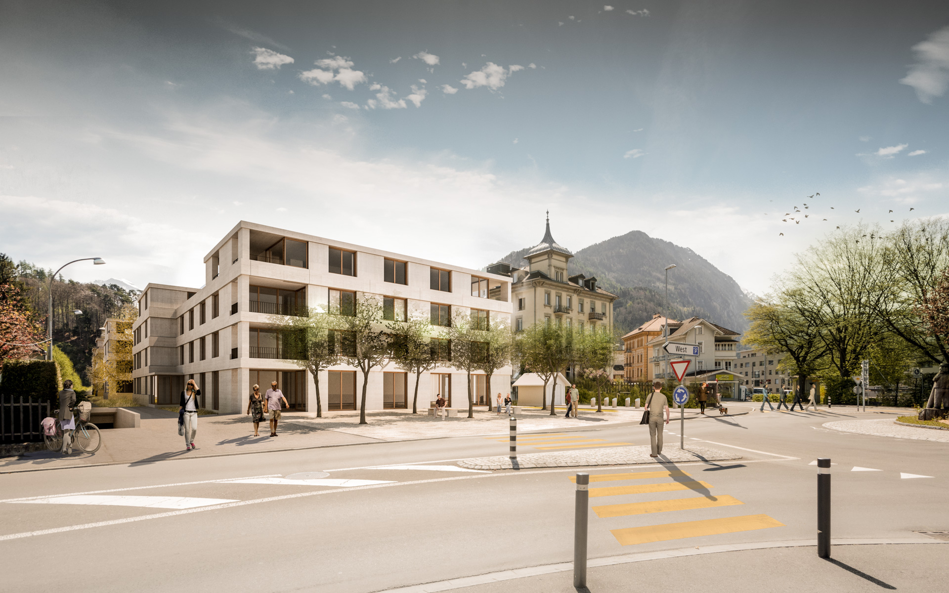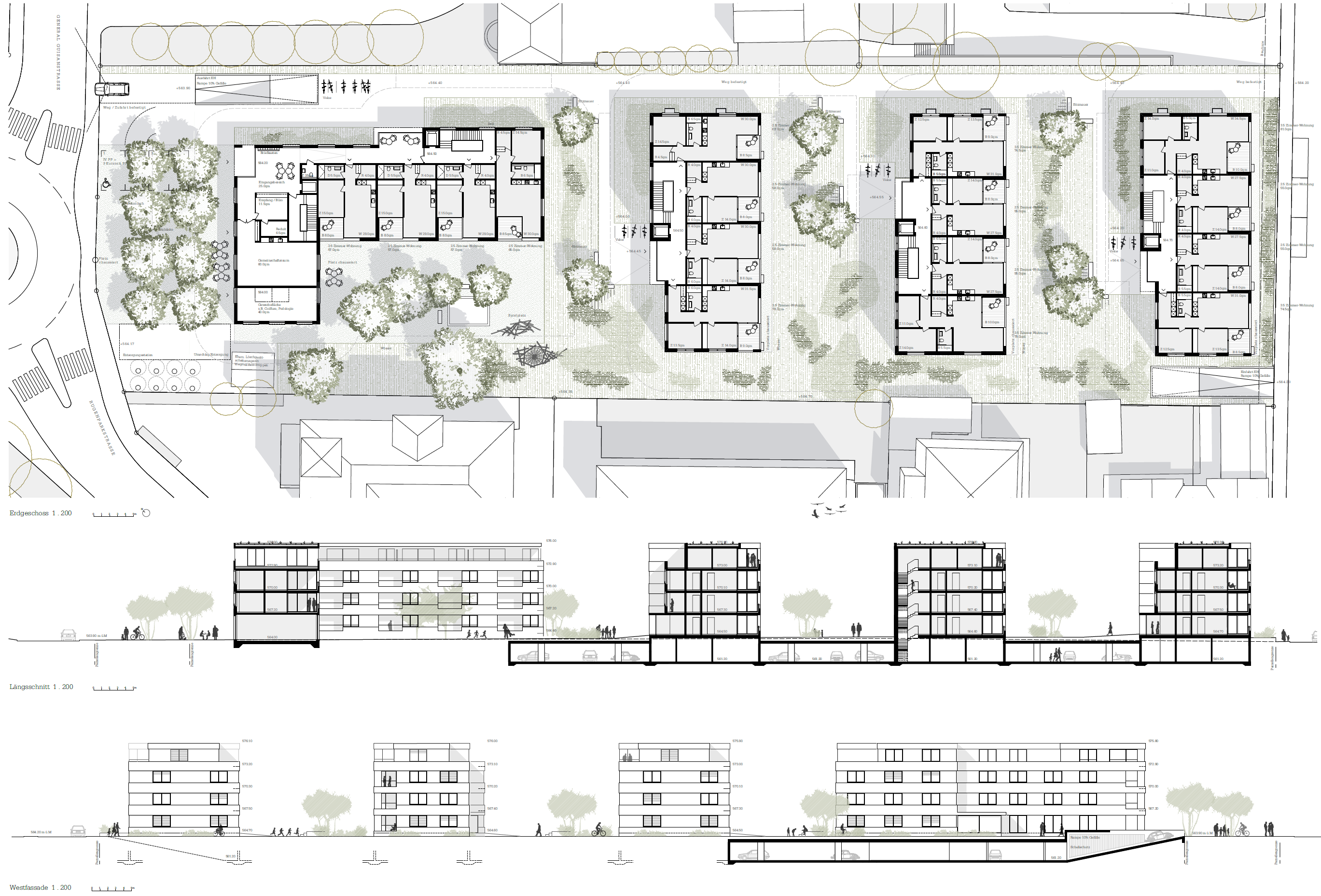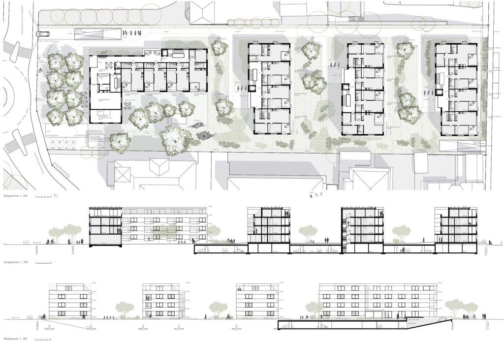 Auf städtebaulicher Ebene fügt sich das Projekt einerseits harmonisch in die bestehende Quartierstruktur ein und gibt andererseits eine klare Antwort in Bezug auf deren Weiterentwicklung. Die Vier Baukörper gehen in ihrer Anordnung, Dimensionierung und Körnung einen Dialog mit der benachbarten Bausubstanz ein und wirken somit innerhalb des Quartiers sehr selbstverständlich. Das Projekt entspricht, abgesehen von kleinen Anpassungen, dem gültigen Baugesetz und zeigt das richtige Mass an möglicher Verdichtung an diesem Standort. Drei längliche, Nord-Süd orientierte Wohnbauten werden im Nordwesten durch einen Kopfbau gegen den Kreisel General-Guisanstrasse/Rugenparkstrasse ergänzt. Dieser ist gegenüber dem Strassenverlauf zurückgesetzt und bildet somit einerseits einen öffentlichen Platz und reagiert andererseits adäquat auf das benachbarte, ehemalige Hotel Simplon. Insgesamt Sind die Baukörper allesamt präzise und überlegt gesetzt und weisen eine städtebaulich überzeugende Gesamtkonzeption auf.