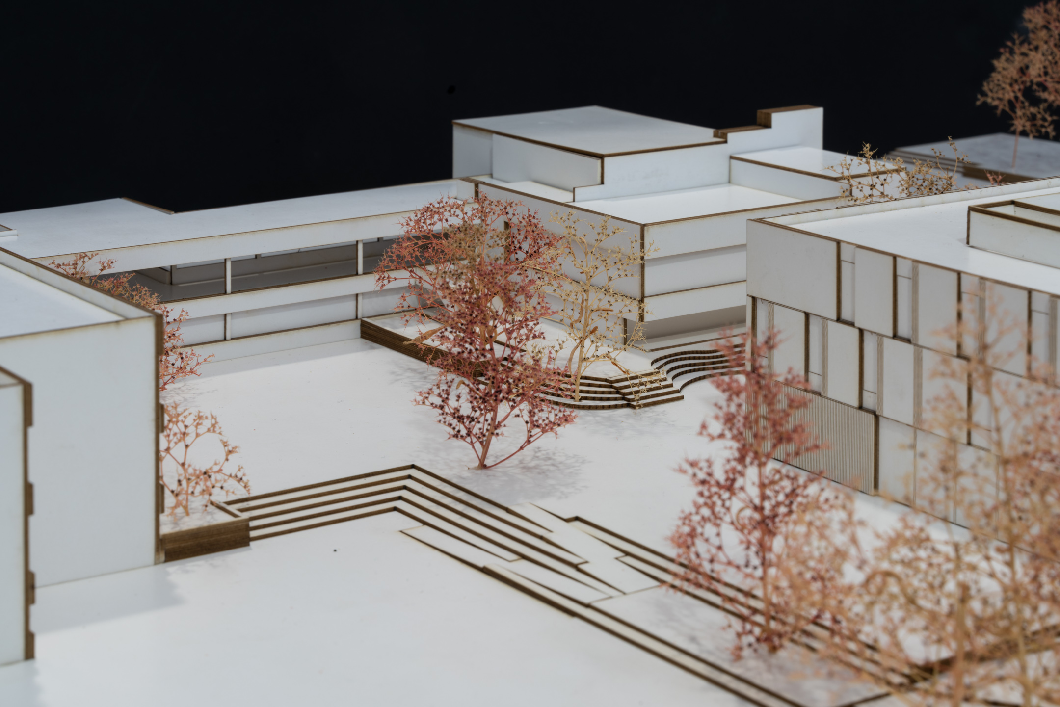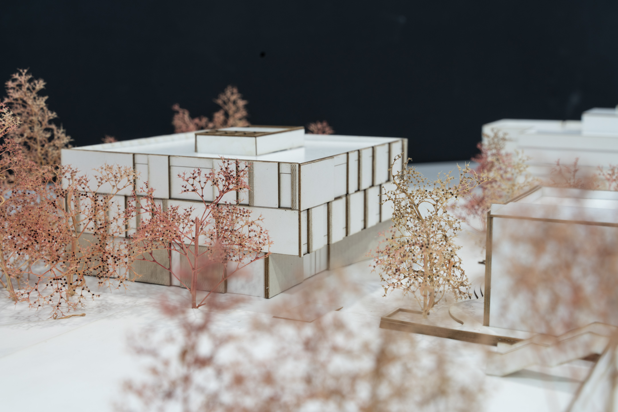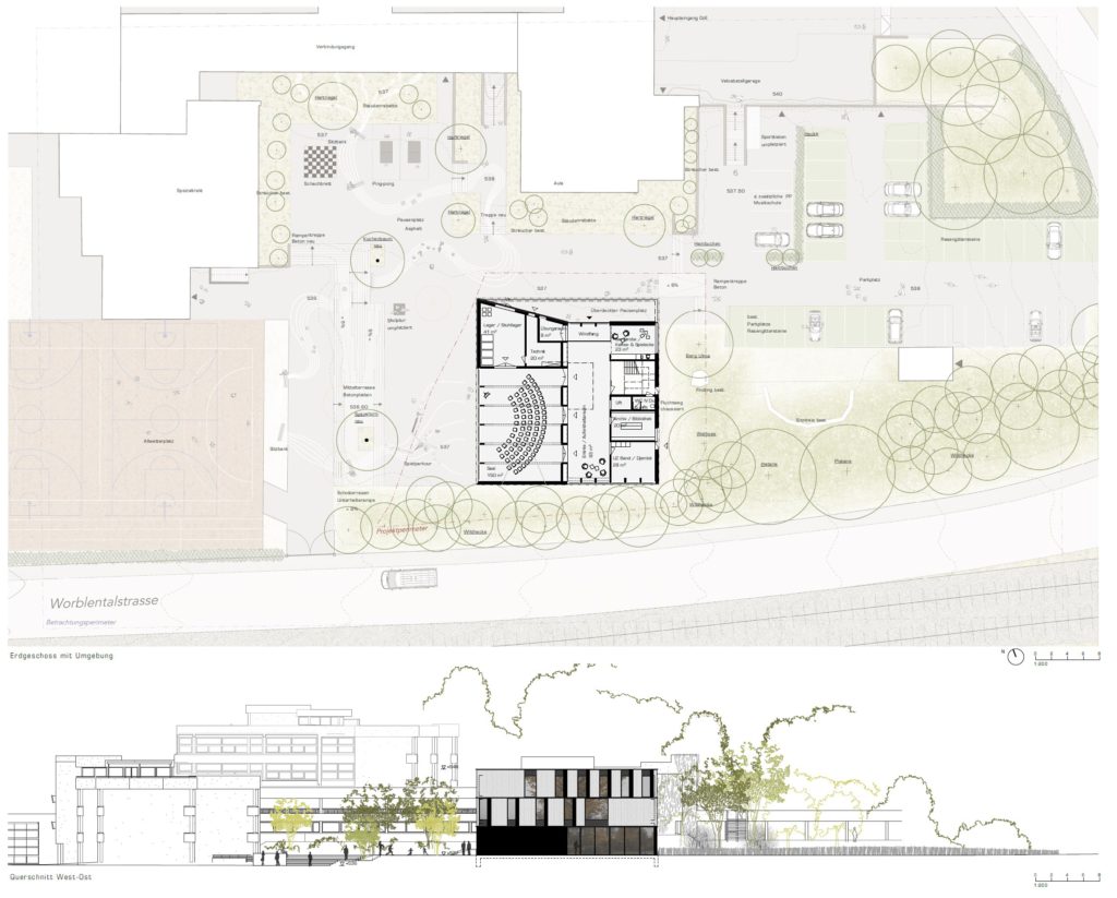 Ein einfaches, kompaktes Bauvolumen ergänzt die bestehende Schulanlage mit grosser Selbstverständlichkeit. Die vorgeschlagene Setzung ermöglicht auf der unteren Erschliessungsebene der Anlage einen neuen Auftakt mit einer adäquaten Adressierung der Musikschule, gleichzeitig aber auch einen überzeugenden räumlichen Abschluss der westlichen Aussenanlagen. Form, Grösse, Körnung und Gebäudehöhe unterstützen die postulierte Integration des Neubauvolumens. Zudem gelingt es den Projektverfassern mit der vorgeschlagenen Situierung den bestehenden Baumbestand entlang der Worblentalstrasse weitgehend zu erhalten. […]