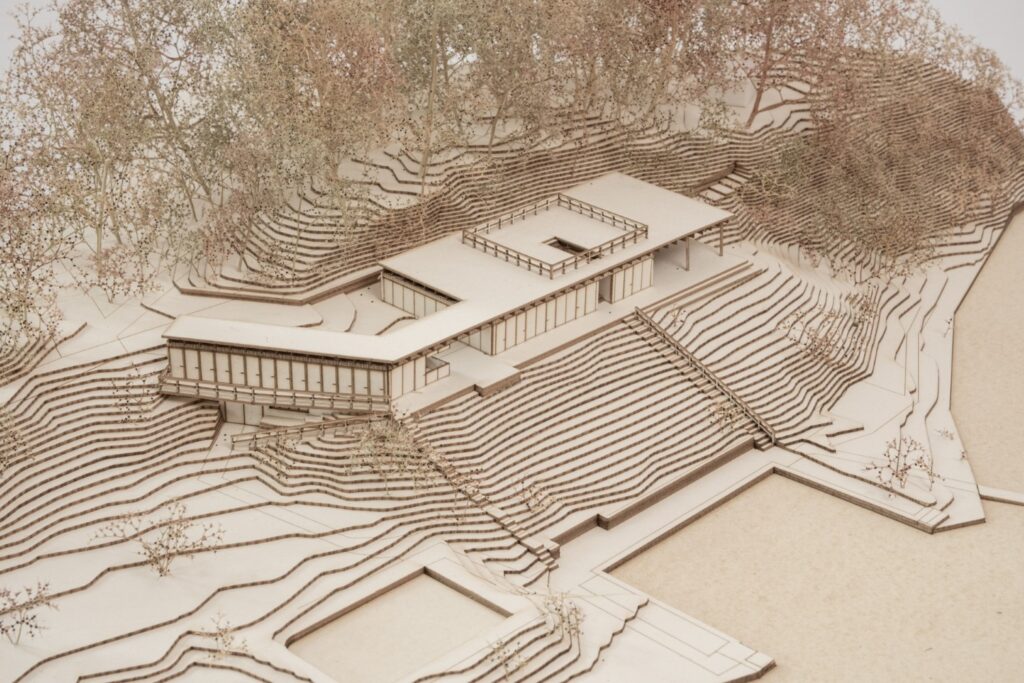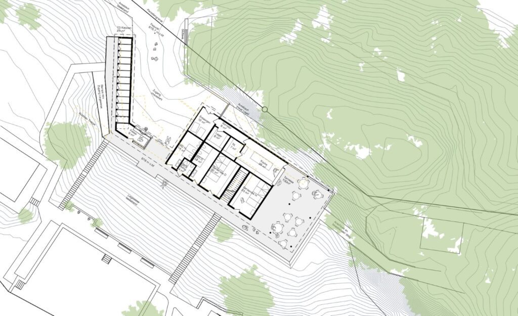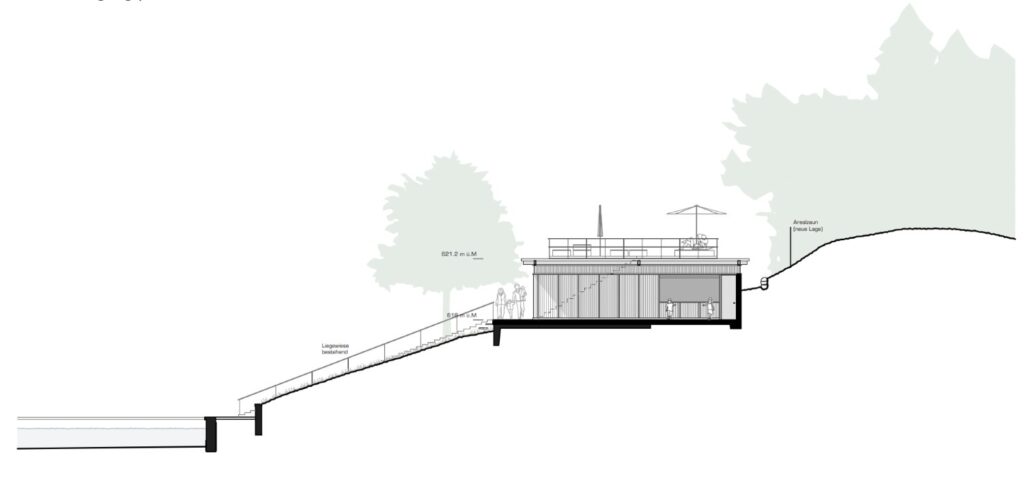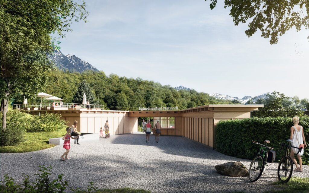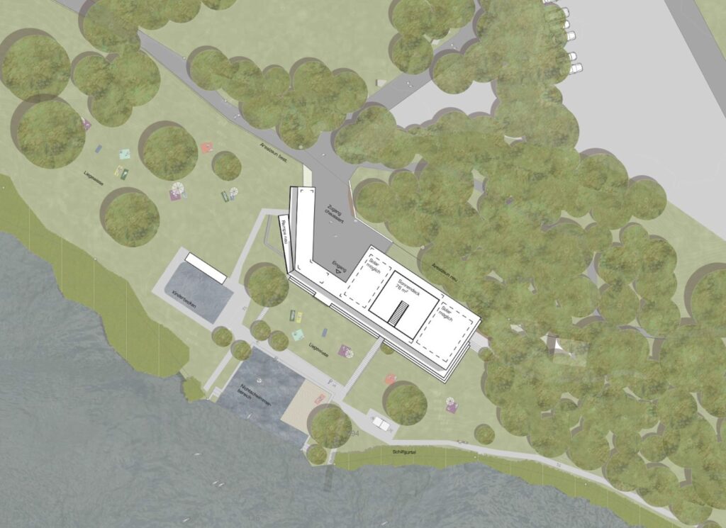 Der Ort ist geprägt durch die Lage des Burgseelis in der Talmulde, welche von umlaufenden Matten und Waldkörper eingefasst ist. Das Badehaus wird exakt am Standort der heutigen Gebäude erstellt. Mit der pavillonartigen, eingeschossigen Bauweise wird die atmosphärische Verknüpfung mit der grünen Kulisse gesucht. Das Gebäude ist nach aussen so adressiert, dass ein spannender Übergang zwischen Vorplatz und Bad entsteht. Es entsteht für den Badegast ein szenischer Auftakt mit Sichtbezug vom Zugang hinaus zum See und dem Waldsaum auf der Südseite des Areals.