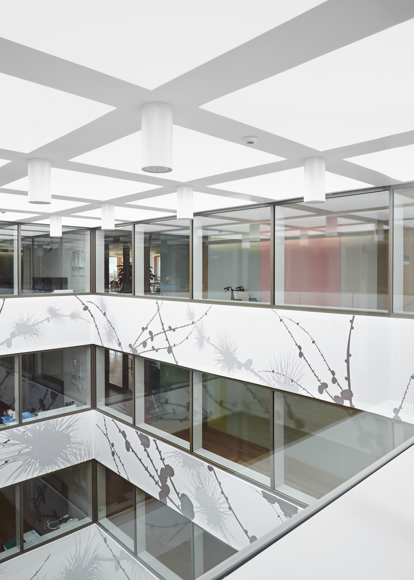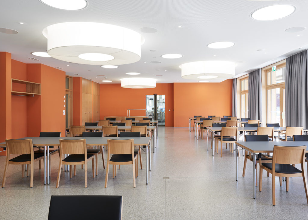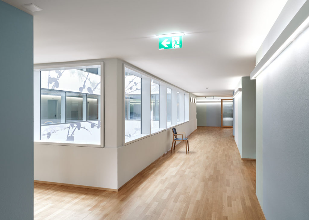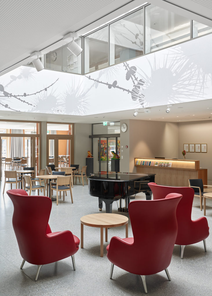 Einerseits gibt es einen Baukörper, der die Nebenräume wie Toiletten, Ausguss, Lagerraum und Lifte beherbergt, andererseits einen Raumkörper, einen ‚Lichtraum‘, der sich vom Erdgeschossfoyer bis unters Dach erstreckt und dem ganzen Heim Identität, Orientierung und helle Korridore verschafft.