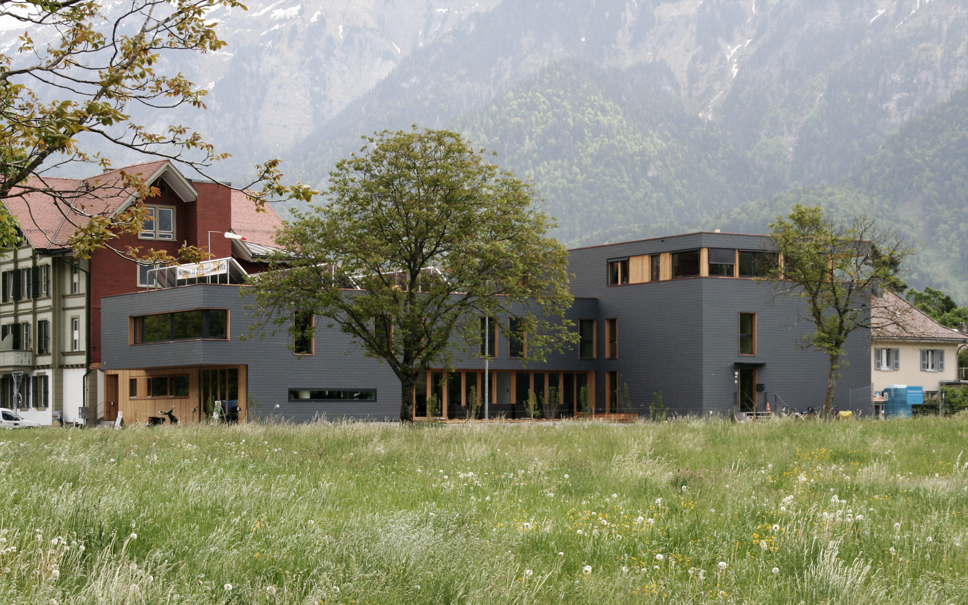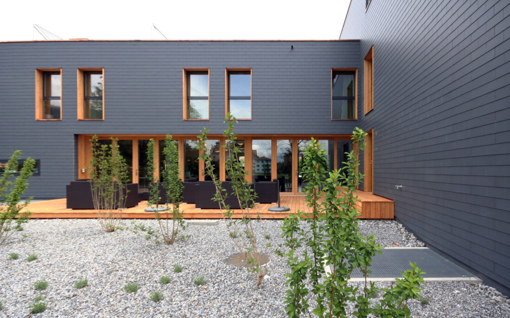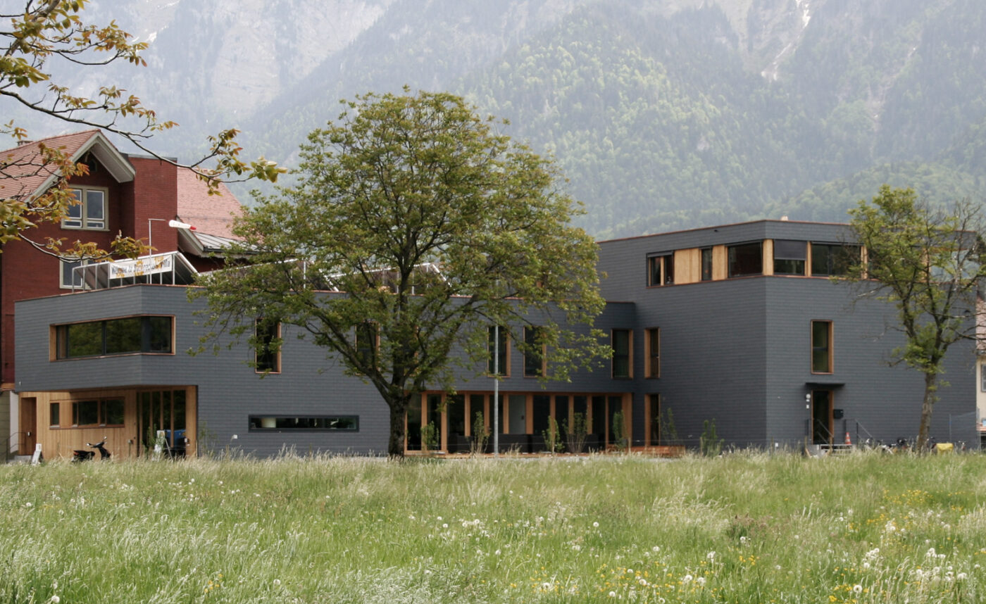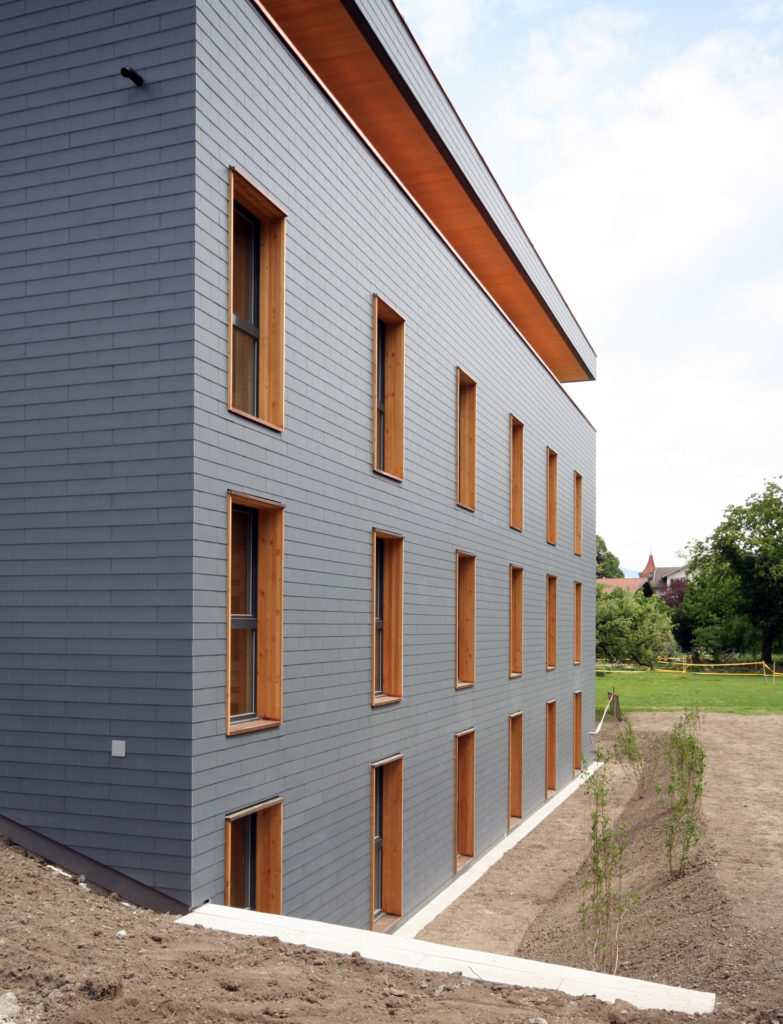 Vorherrschende Fassadenmaterialien sind die dunkle geschuppte Eternithaut und das naturbelassene Holz von Fensterleibungen und verschalten Wandteilen. Der Neubau grenzt sich so klar vom Altbau ab, ohne diesen farblich zu konkurrenzieren.