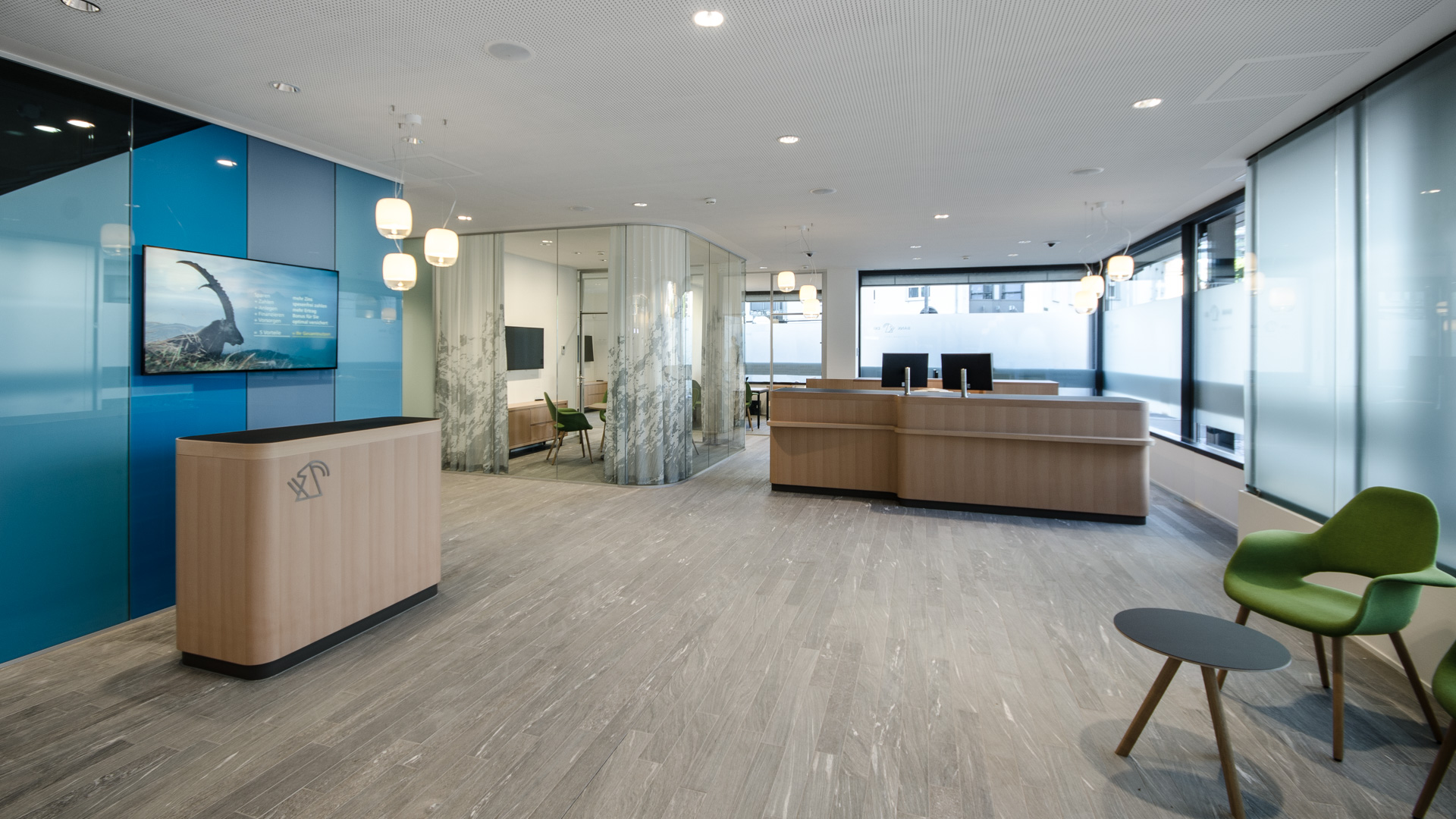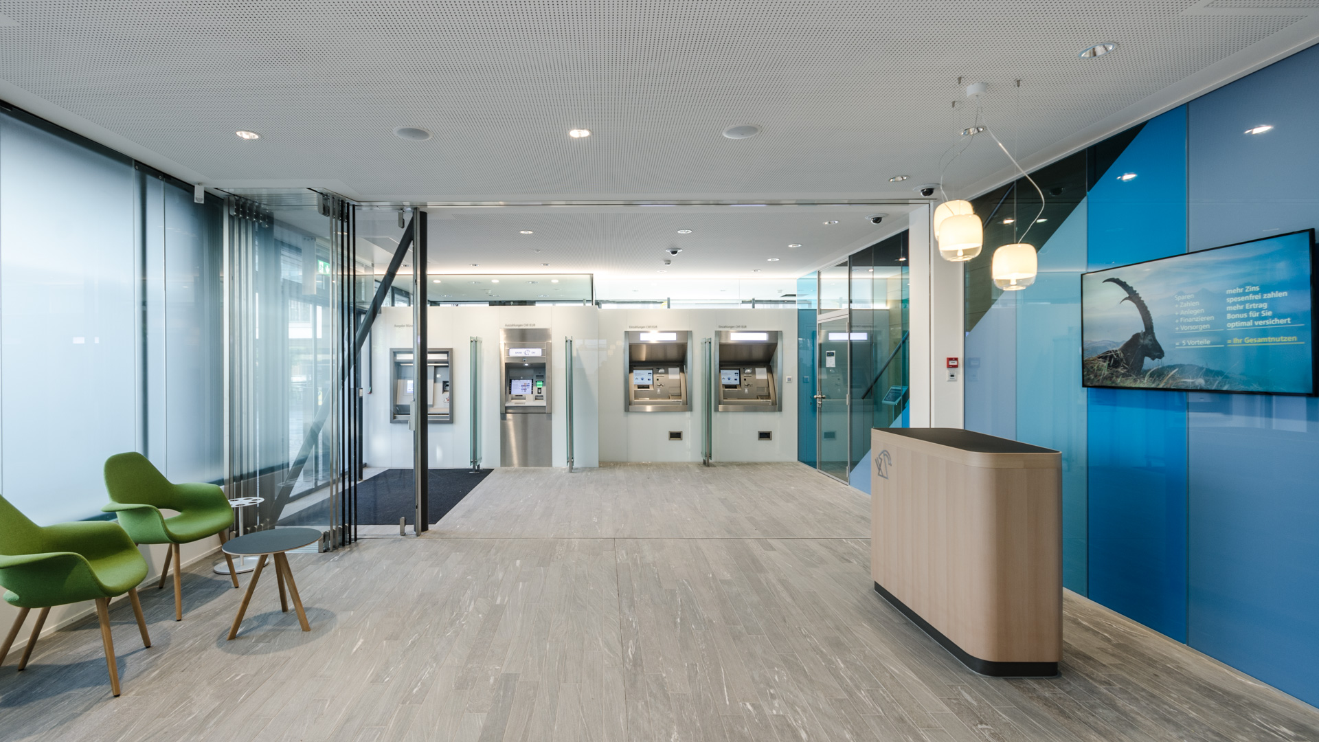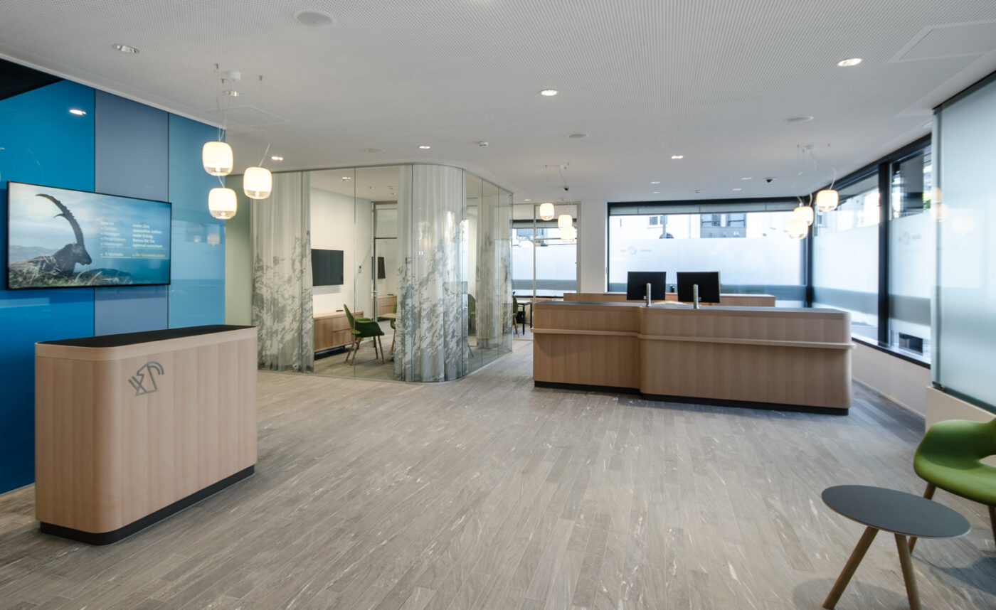Um den neuen Ansprüchen der Zeit und der Kunden gerecht zu werden, wird die Schalterhalle umgestaltet. Mehr Raum und mehr Licht sollen den Besucher in die Bank führen. Durch die erweitere 24H-Zone sind Bezüge, Einzahlungen und Wechsel jederzeit an den Automaten möglich. Zu den Öffnungszeiten lässt sich die Schalterhalle mittels der Glastrennwand öffnen und es entsteht ein erweiterter Raum. Die gläsernen Besprechungszimmer lassen angenehmes Tageslicht rein und sind dennoch diskret genug für Kundengespräche. Die eigens entworfenen Schreinermöbel sowie die farbige Rückwand geben der Bank ihren neuen Charakter. Um die Raumansprüche zu erfüllen erhält die Bank eine schallabsorbierende Kühldecke.: