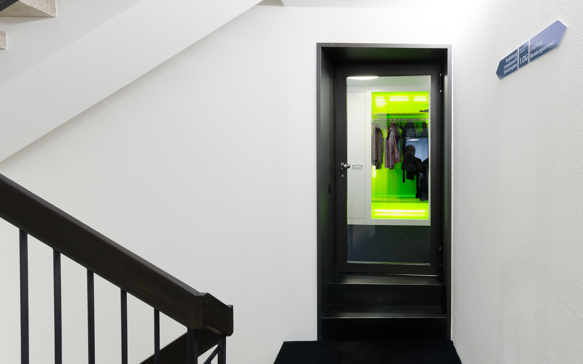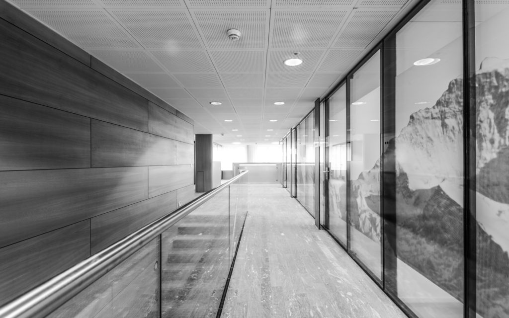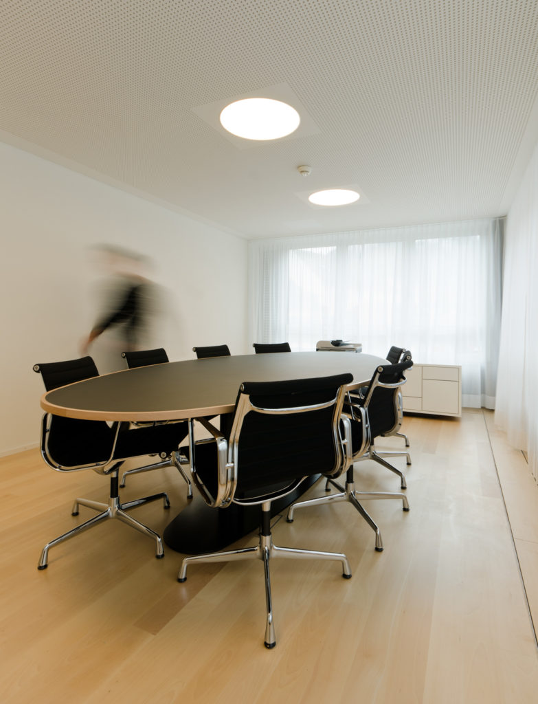Im ersten Stock wurde eine neue Besprechungszone mit 4 Sitzungszimmer und einem „Lounge“ Besprechungszimmer geschaffen. Den Kunden präsentiertsich beim Gang in den ersten Stock ein Ausblick auf Silhouetten heimischer Berge. Die Bank ist stolz auf ihre regionale Verankerung und zeigt dies markant in der Gestaltung der Front ihrer neuen Besprechungszimmer. Was von aussen traditionell erscheint, besticht im Innern durch moderne Technik und zeitgemässes Design.