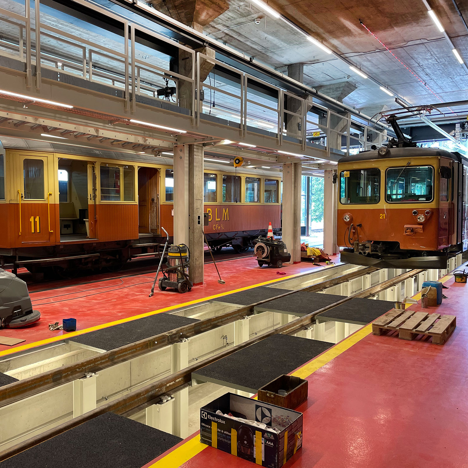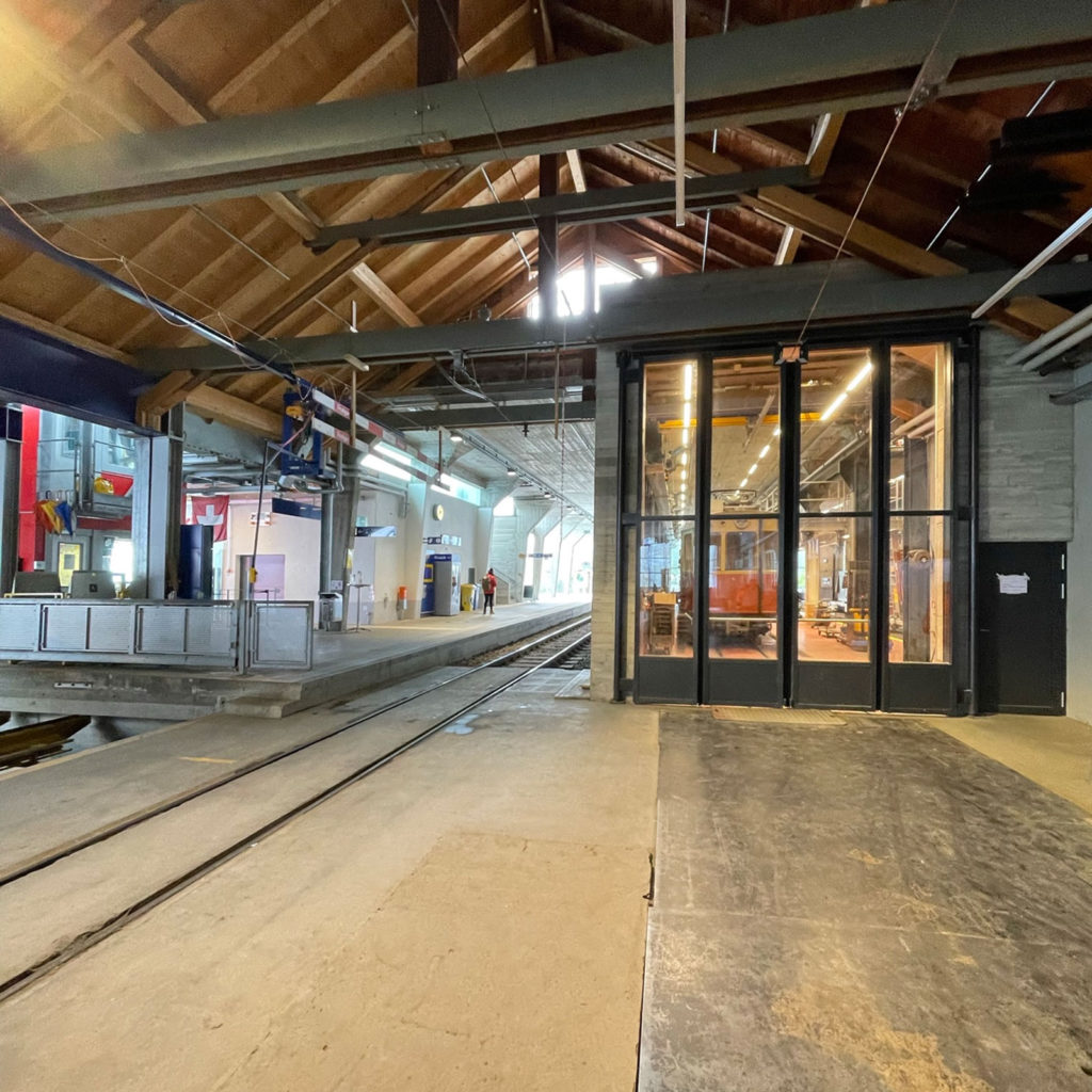 In der BLM Station Grütschalp steigen die Gäste von der Kabinen- / Gondelbahn von oder nach Lauterbrunnen zur Adhäsionsbahn (Schmalspur) Grütschalp – Mürren um. Die bestehende Perronhöhe resp. die Gleislage im Schotterbett wurde auf P35, BehiG konform, angepasst und das Hausperron wie auch die Überdachung dem neuen Rollmaterial wurden entsprechend verlängert. Die Überdachung der Bahnstation dient einerseits dem trockenen und BehiG konformen Umsteigen der Bahngäste, aber auch als Schutz vor Naturgefahren / Lawinen. Die bestehenden, nicht behindertengerechten Toilettenanlagen bei den Betriebsbüros wurden durch einen behindertengerechten Neubau ersetzt. Unter dem Toilettenneubau wiurde der bestehende Sockel / Technikraum südseitig erweitert und damit Platz für die Stellwerk- und Sicherungsanlagentechnik zu schaffen. Das in die Jahre gekommene Bürogebäude wurde im Erdgeschoss innen und aussen erneuert. Das neue Rollmaterial erfordert eine den Dimensionen und den Bedürfnissen der BLM angepasste Werkstätte. Im aktuellen, wie auch im zukünftigen Betriebskonzept werden sämtliche Revisions- und Unterhaltsarbeiten in der Werkstätte Grütschalp erledigt. Infolge der sehr engen Platzverhältnisse können heute die Wagenkästen nur ausserhalb der beheizten Werkstätte von den Drehgestellen abgehoben werden, was insbesondere im Winterhalbjahr immer wieder zu sehr unangenehmen Situationen führt. Neu werden zwei Gleise in die beheizte Werkstätte mit entsprechender Infrastruktur wie: schwenkbaren Fahrleitungen, Revisionsgruben, Krananlagen