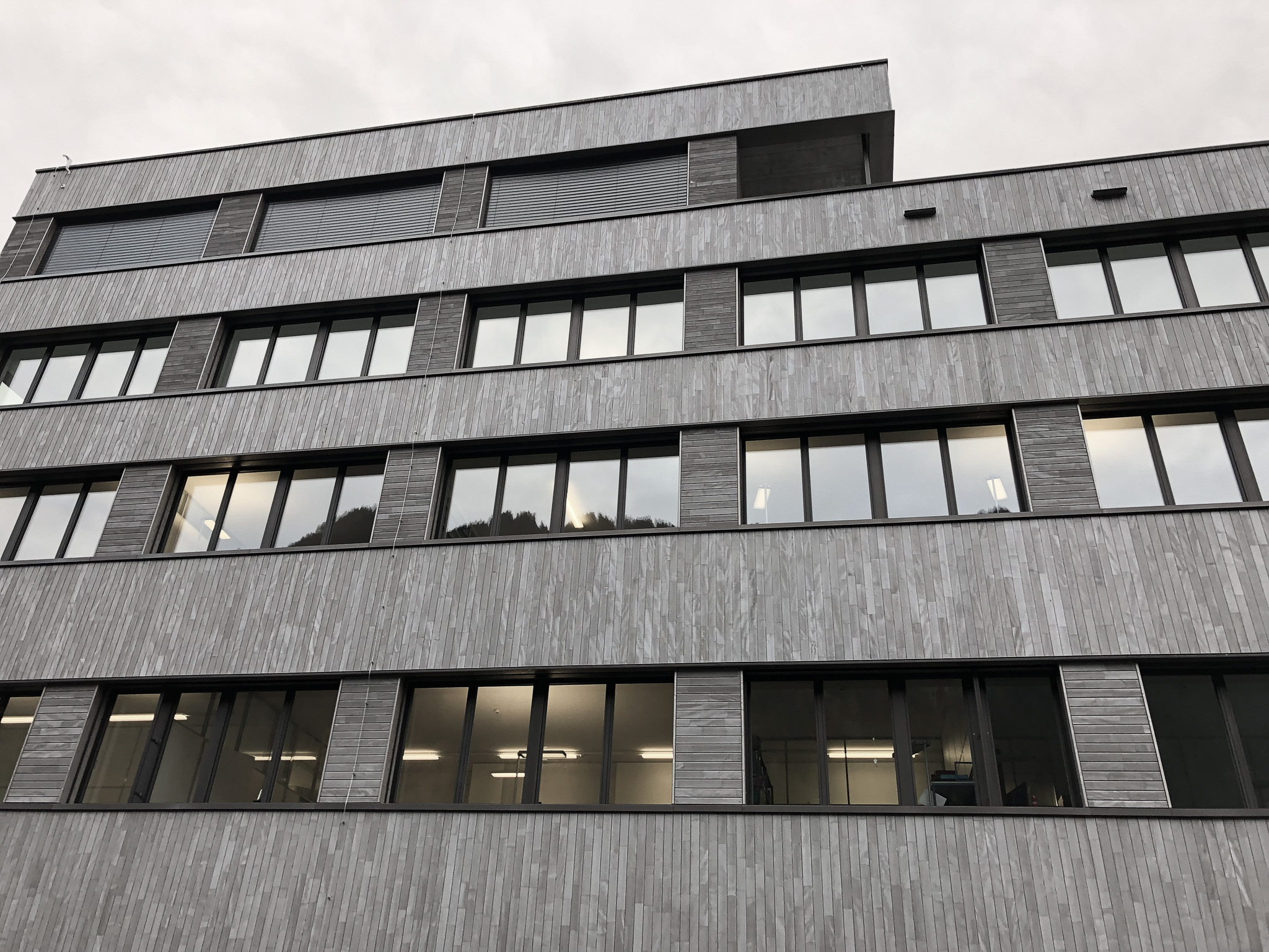 Die Konstruktion wurde als Hybridbau ausgeführt. Die Fassade besteht aus vorfabrizierten Holzelementen, verkleidet mit einer vorvergrauten Holzschalung. Das Gebäude basiert auf einem modularen Raster und wurde nutzungsneutral geplant, um auch in Zukunft flexibel auf veränderte Anforderungen reagieren zu können.