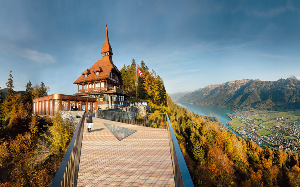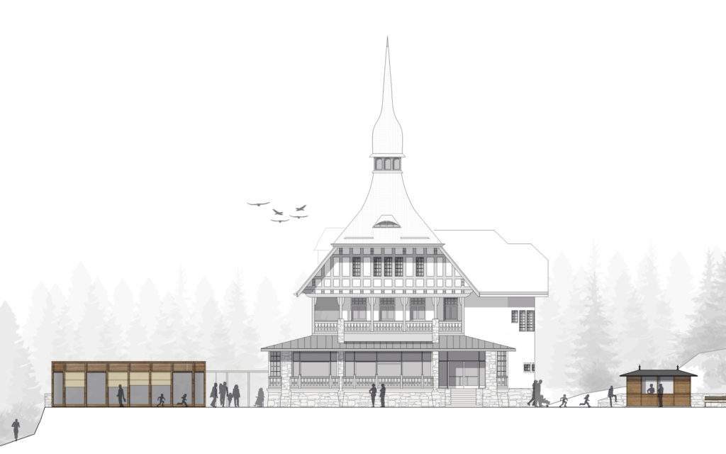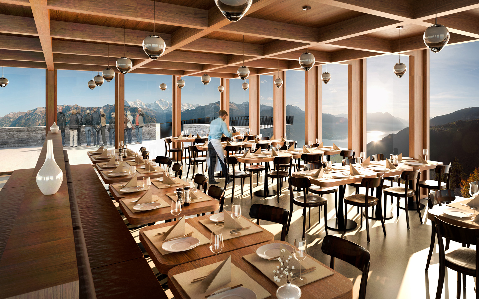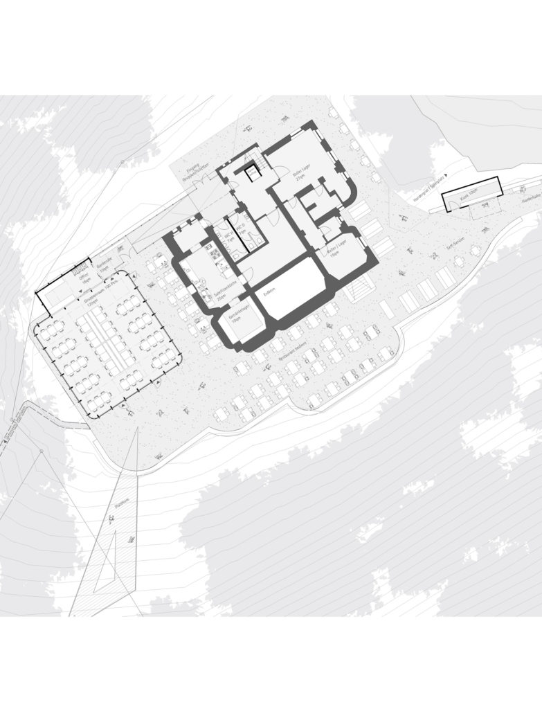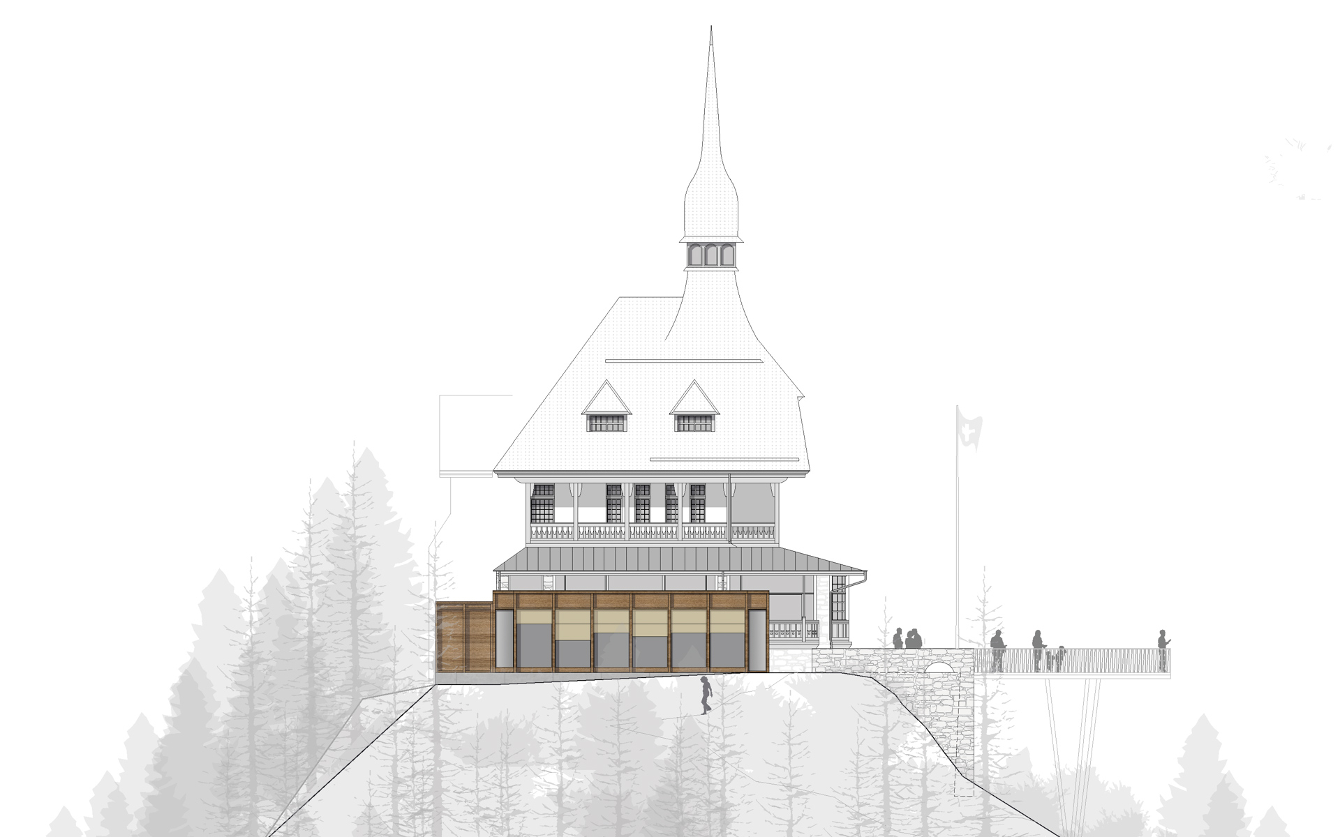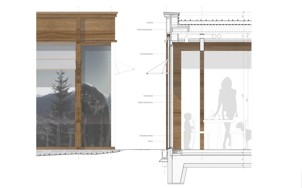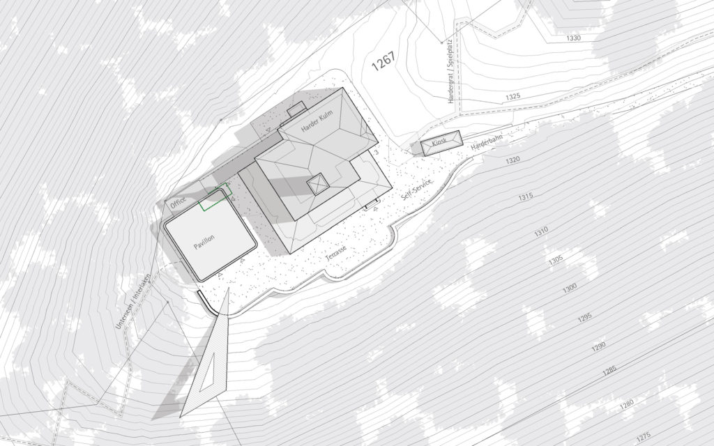 Die Setzung des Neubaus steht in Verbindung mit den vorgesehenen Wegen der Umgebung und verankert den Bau landschaftlich im Gelände. Das leichte Zurückrücken von der Hangkante, bzw. der Stützmauer unterstreicht die Positionierung auf der bekiesten Terrasse. Der Pavillon ist auf einem Sockel aus Beton und Bruchsteinmauerwerk gebaut. Ein klarer, aber strenger Fassadenraster ergibt einen eleganten und auf den Ort abgestimmten Solitär mit einer klaren Formensprache. Gleichzeitig entsteht mit der Setzung des Pavillon auf die Terrassenkante ein Zwichenraum zum Altbau. Damit wird das Bergrestaurant in seiner Dreiseitigkeit respektiert, die Solitärwirkung bleibt erhalten.