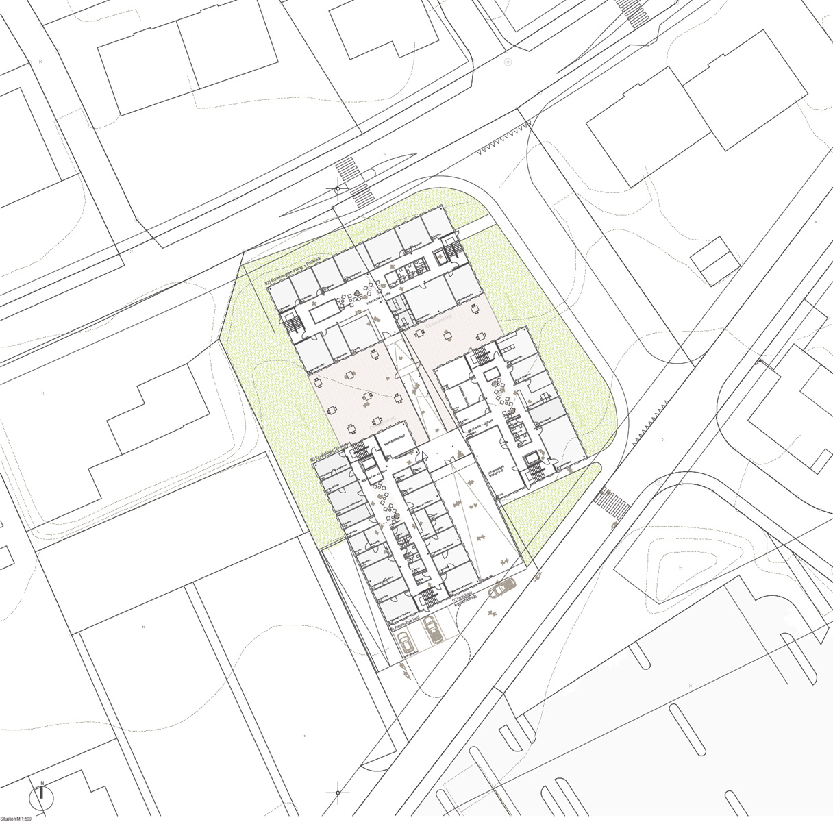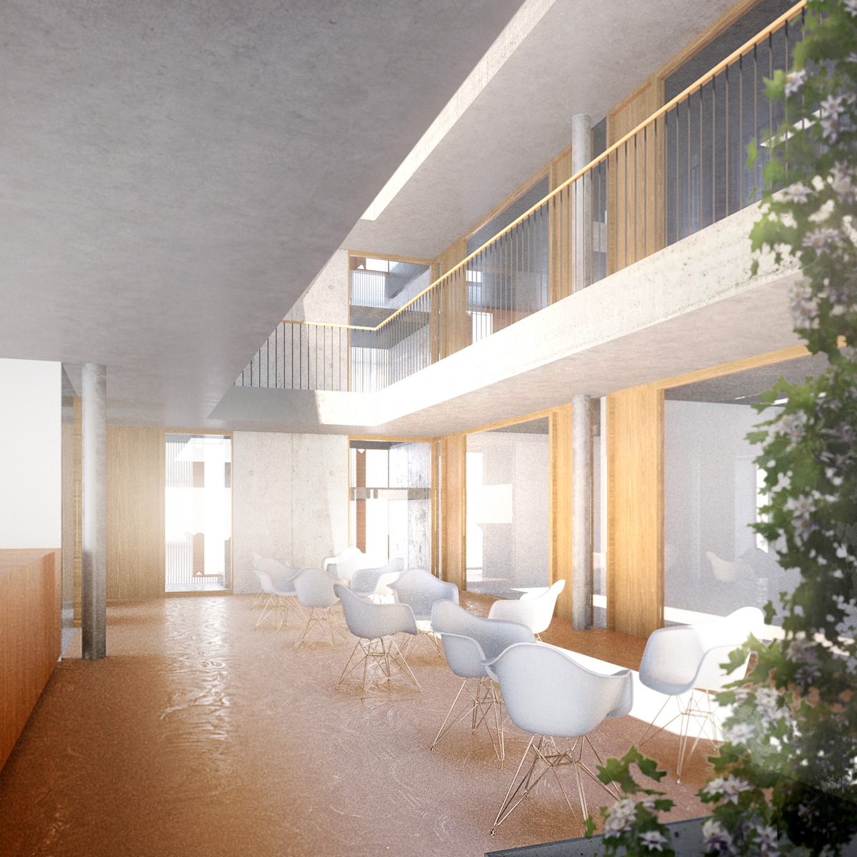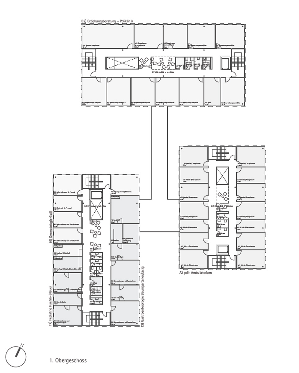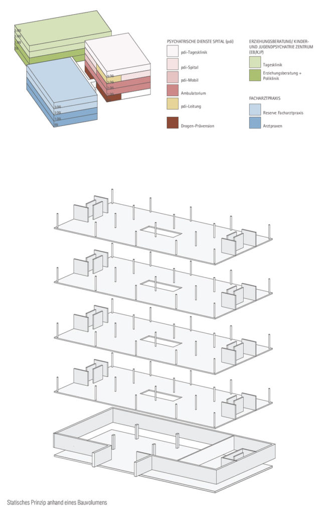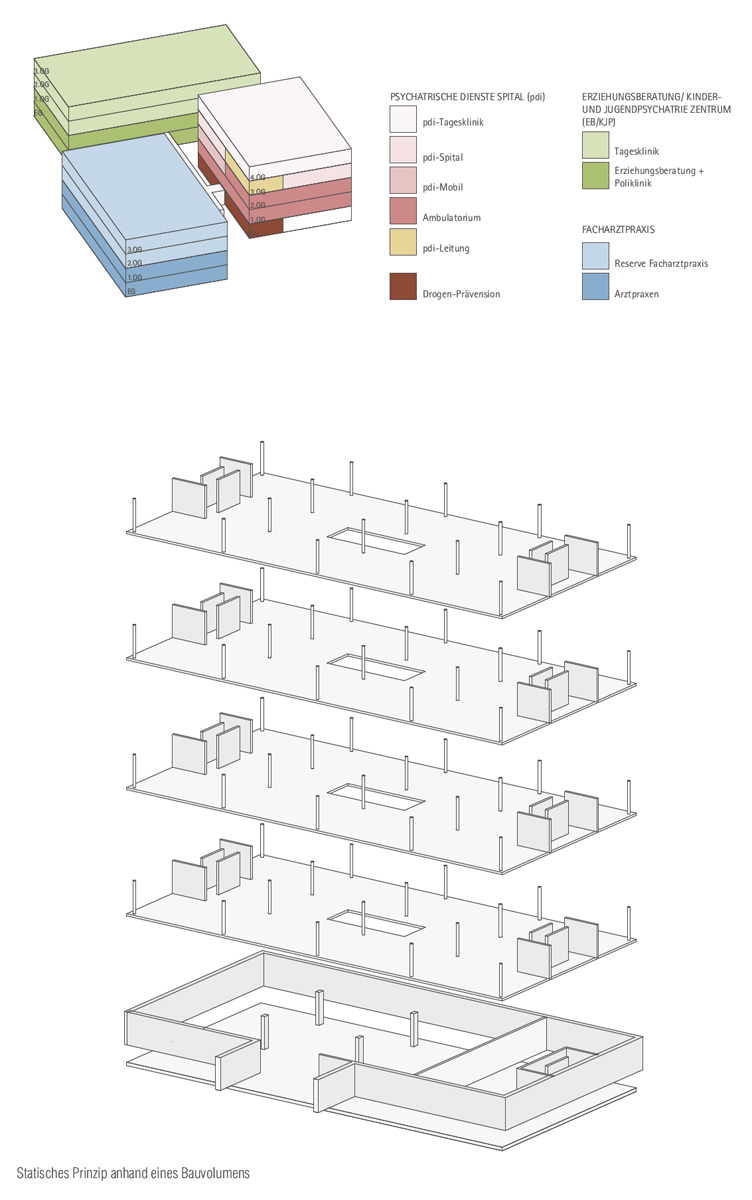 Die drei Abteilungen Erziehungsberatung / Kinder- und Jugendpsychatrie Zentrum; die psychatrischen Dienste Spital und Arztpraxen erhalten jeweils einen eigene Baukörper. Dadurch wird eine klare Differenzierung der Abteilungen bewahrt, welche die Orientierung in dem Koplex vereinfacht. Die drei Baukörper werden durch einen gläsernen Pavillon verbunden, welcher ausschliesslich der Verkehrfläche dient. Er bietet einen grosszügigen Haupteingang und verjüngt sich durch eine Rampe Richtung Erziehungsberatung. Eine Differenzierung der Höhenstaffelung erfolgt durch die Setzung in den Hang als auch durch unterschiedliche Anzahl der Geschosse.