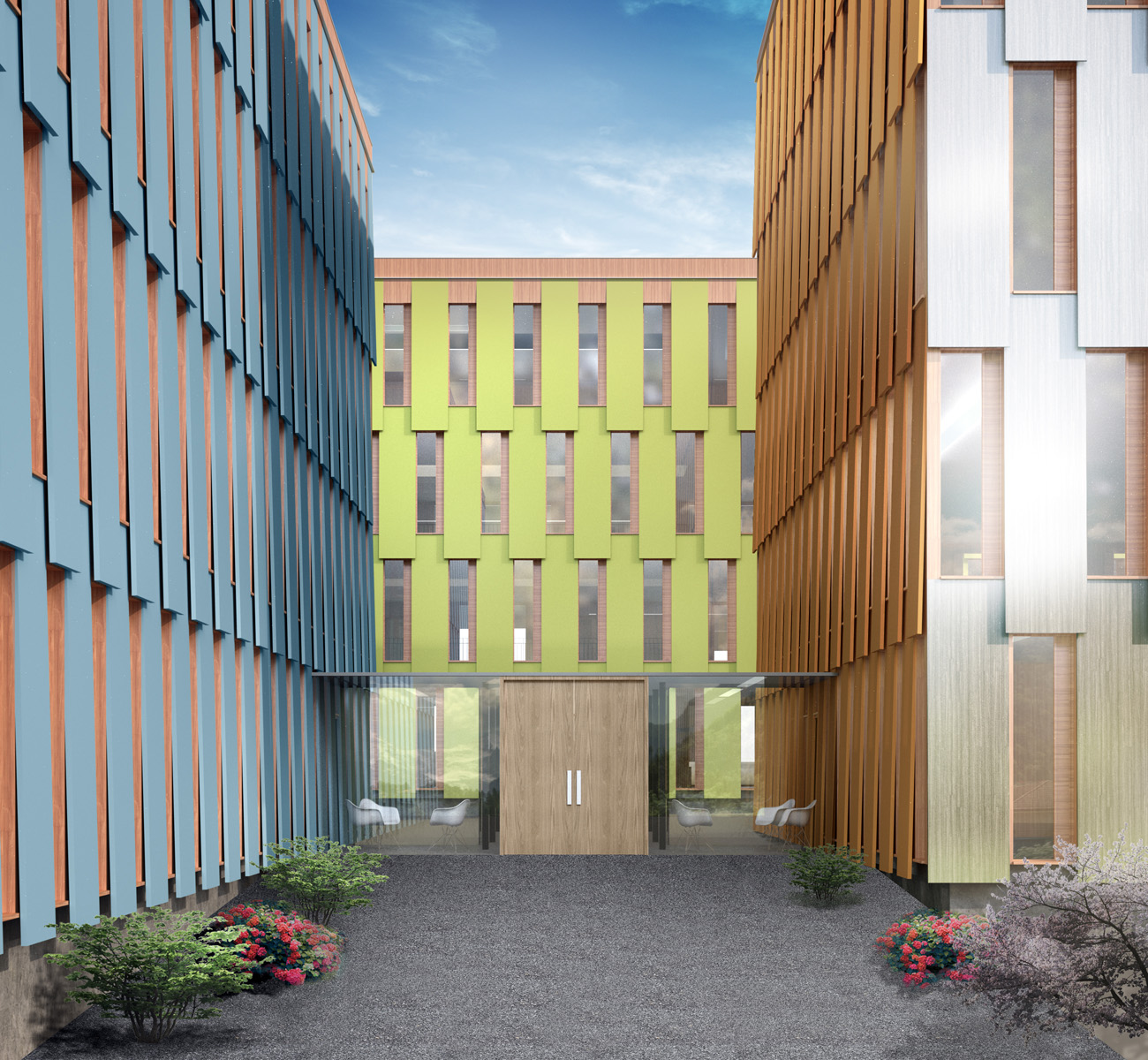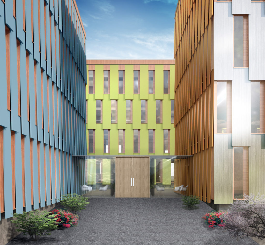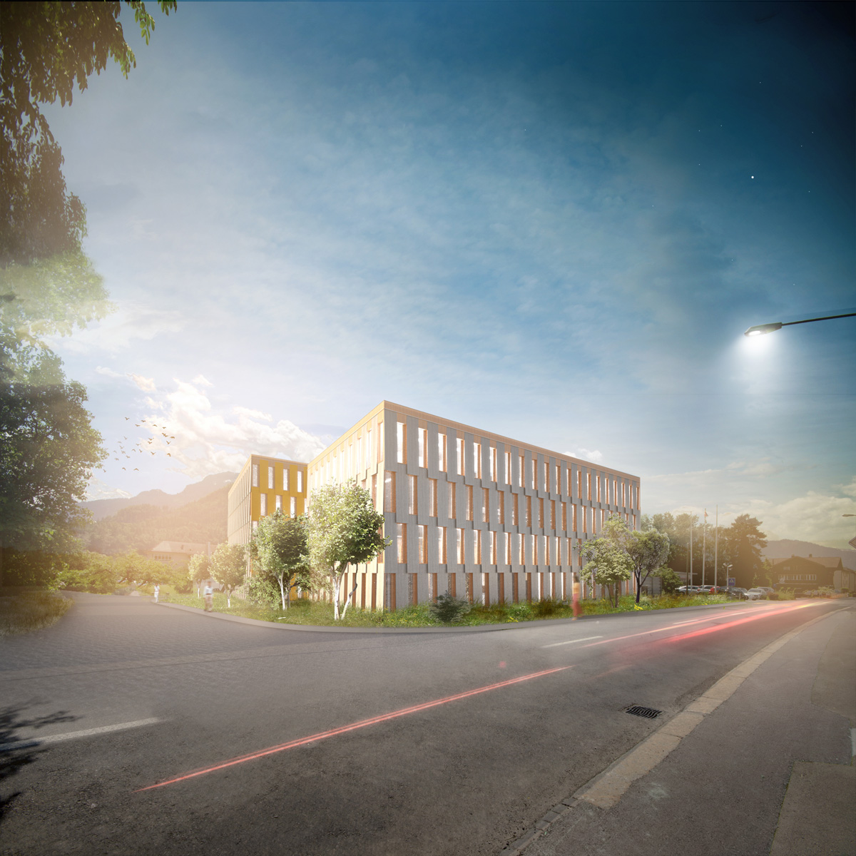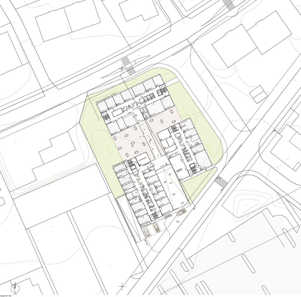 Die drei Abteilungen Erziehungsberatung / Kinder- und Jugendpsychatrie Zentrum; die psychatrischen Dienste Spital und Arztpraxen erhalten jeweils einen eigene Baukörper. Dadurch wird eine klare Differenzierung der Abteilungen bewahrt, welche die Orientierung in dem Koplex vereinfacht. Die drei Baukörper werden durch einen gläsernen Pavillon verbunden, welcher ausschliesslich der Verkehrfläche dient. Er bietet einen grosszügigen Haupteingang und verjüngt sich durch eine Rampe Richtung Erziehungsberatung. Eine Differenzierung der Höhenstaffelung erfolgt durch die Setzung in den Hang als auch durch unterschiedliche Anzahl der Geschosse.