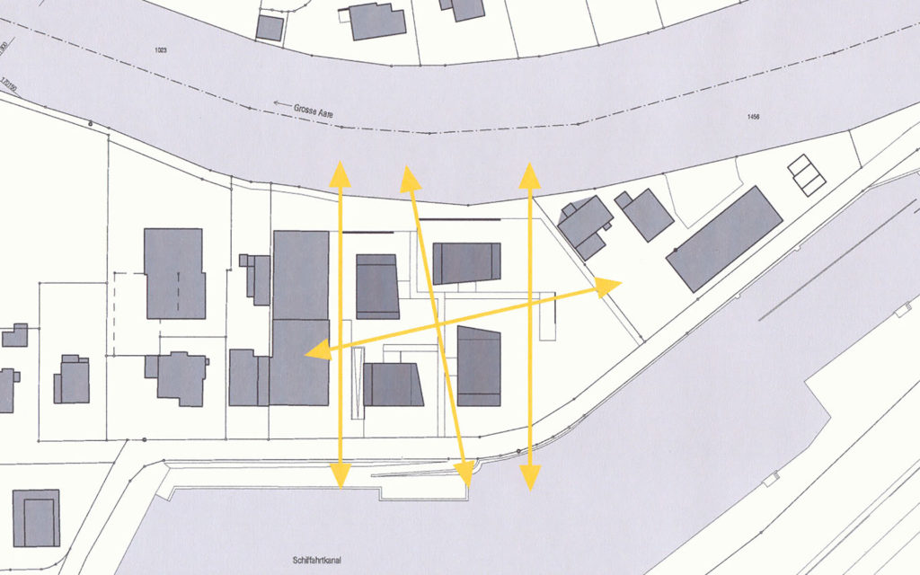 Das rhythmisch ausgewogene Verhältnis zwischen monolythischen Körpern und offenem Raum schafft einen engen Bezug zu Aare und Schifffahrtskanal, sowie der übergeordneten Landschaft (Ausblicke). Der Park mit Anschluss ans Wasser ist ein unverwechselbarer Ort mit hohem Stimmungsgehalt, lädt zum Verweilen ein. Die Wohnhäuser säumen einen zentralen Aussenraum und wenden ihm ihre jeweilige Eingangsfront zu. Im Spannungsfeld der vier Kuben sind den Besuchern genaue Wege zugewiesen.