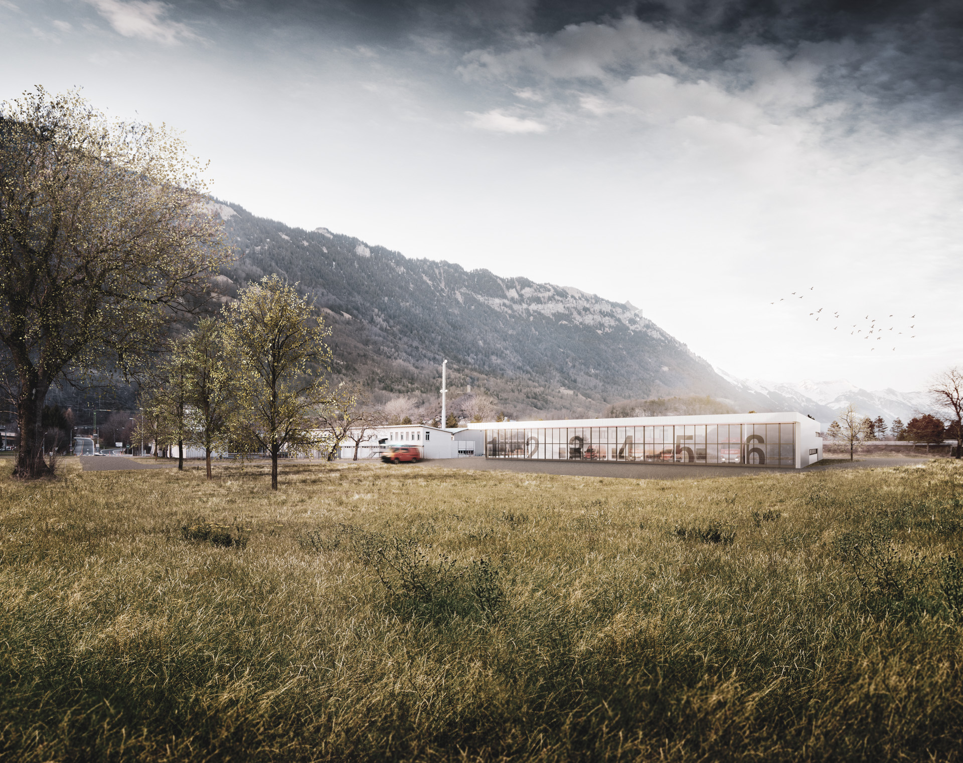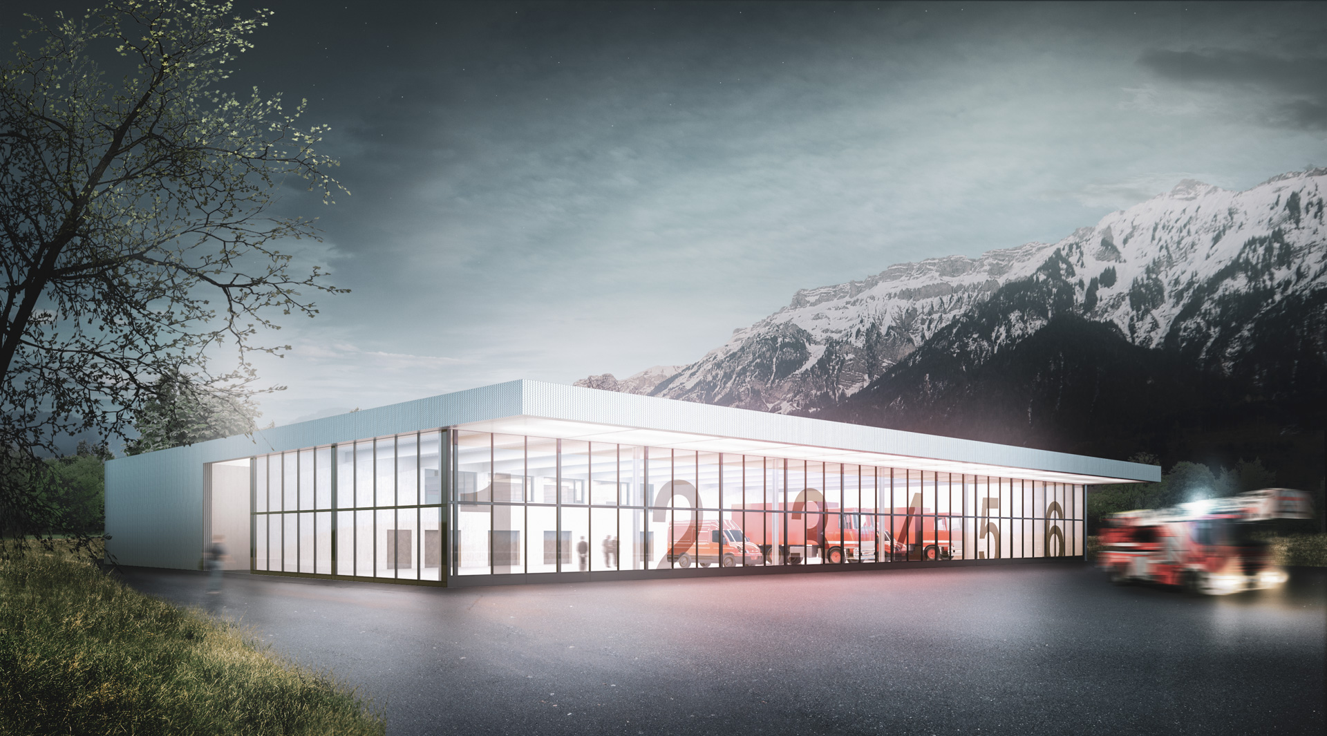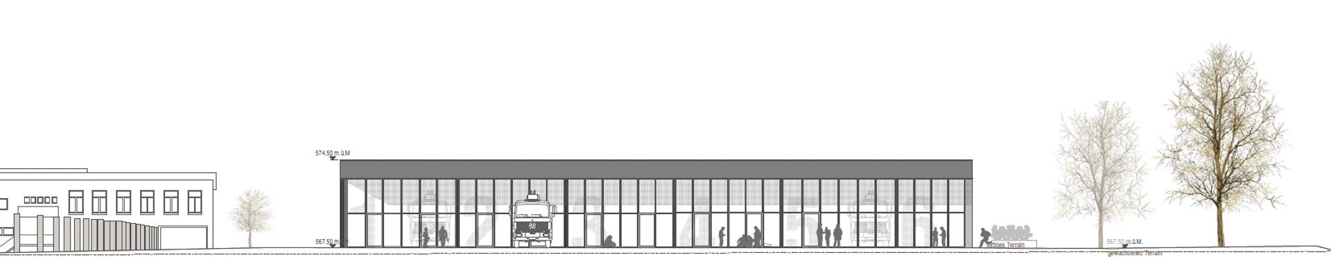 Die markante Form der Werkhalle drängt sich in den Vordergrund und Bedarf einer klaren Weiterführung. Im Zentrum des Gedankens liegt nicht einen neuen Einzelbau zu setzen, sondern den Neubau als Erweiterung des bestehenden Werkhofs weiter zu denken. So wird die Form des Neubaus durch strahlenförmige Setzung der bestehenden Gebäude bestimmt und bildet so einen neuen markanten und ergänzenden Punkt des Überbauungsesembles. Durch diese städtebauliche wichtige Setzung wird das Feuerwehrgebäude ins rechte Licht gerückt und erhält die Präsenz, die es benötigt.