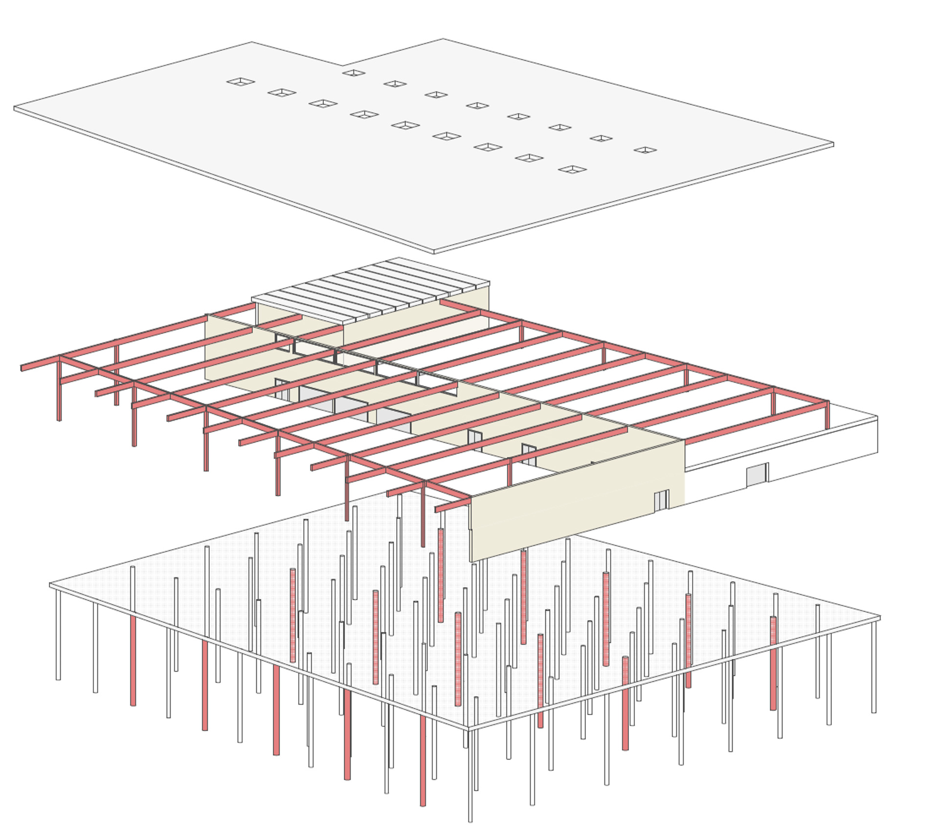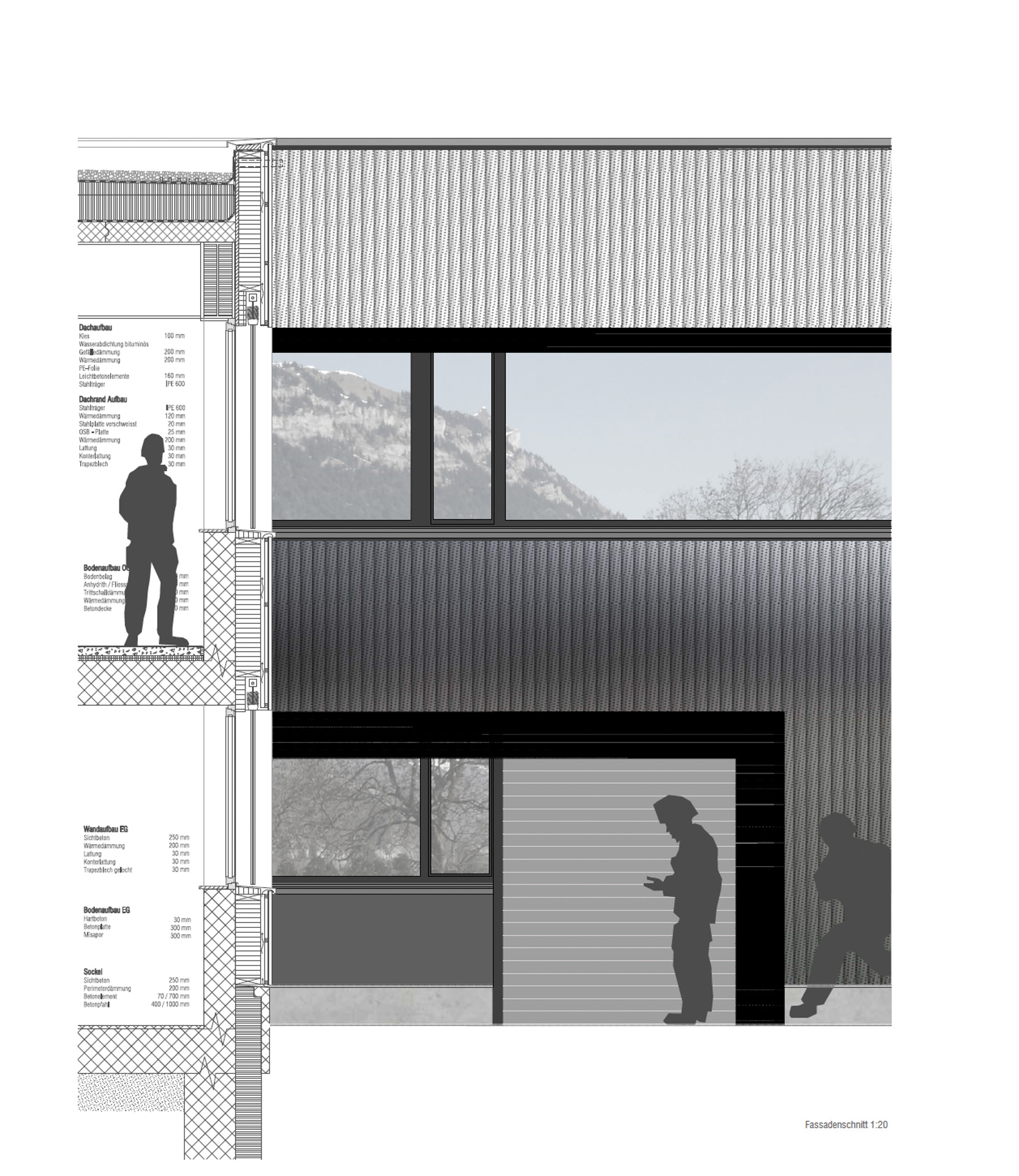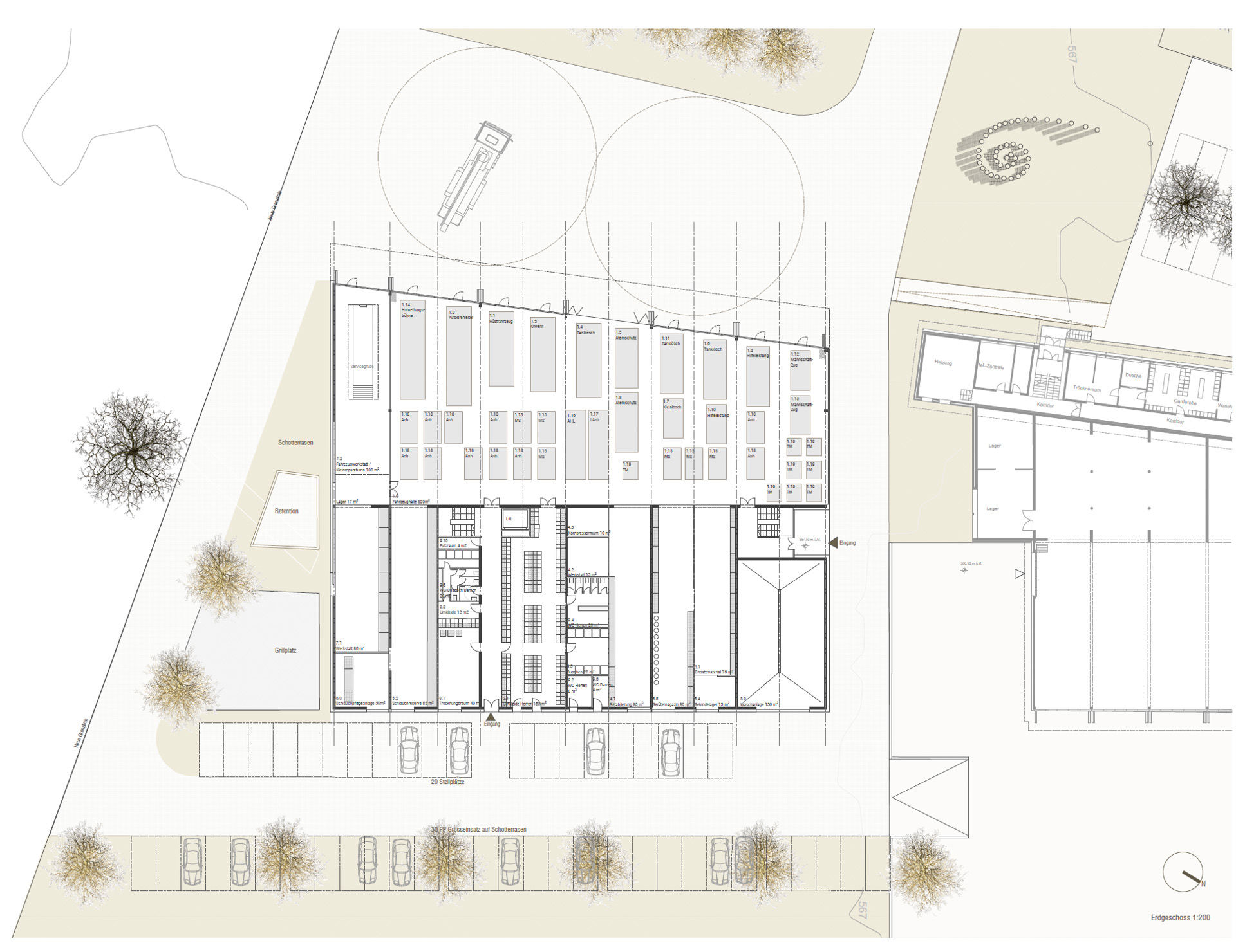 Die markante Form der Werkhalle drängt sich in den Vordergrund und Bedarf einer klaren Weiterführung. Im Zentrum des Gedankens liegt nicht einen neuen Einzelbau zu setzen, sondern den Neubau als Erweiterung des bestehenden Werkhofs weiter zu denken. So wird die Form des Neubaus durch strahlenförmige Setzung der bestehenden Gebäude bestimmt und bildet so einen neuen markanten und ergänzenden Punkt des Überbauungsesembles. Durch diese städtebauliche wichtige Setzung wird das Feuerwehrgebäude ins rechte Licht gerückt und erhält die Präsenz, die es benötigt.