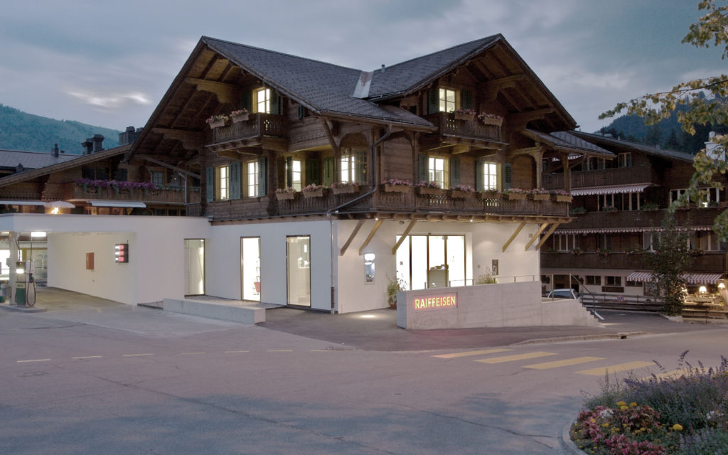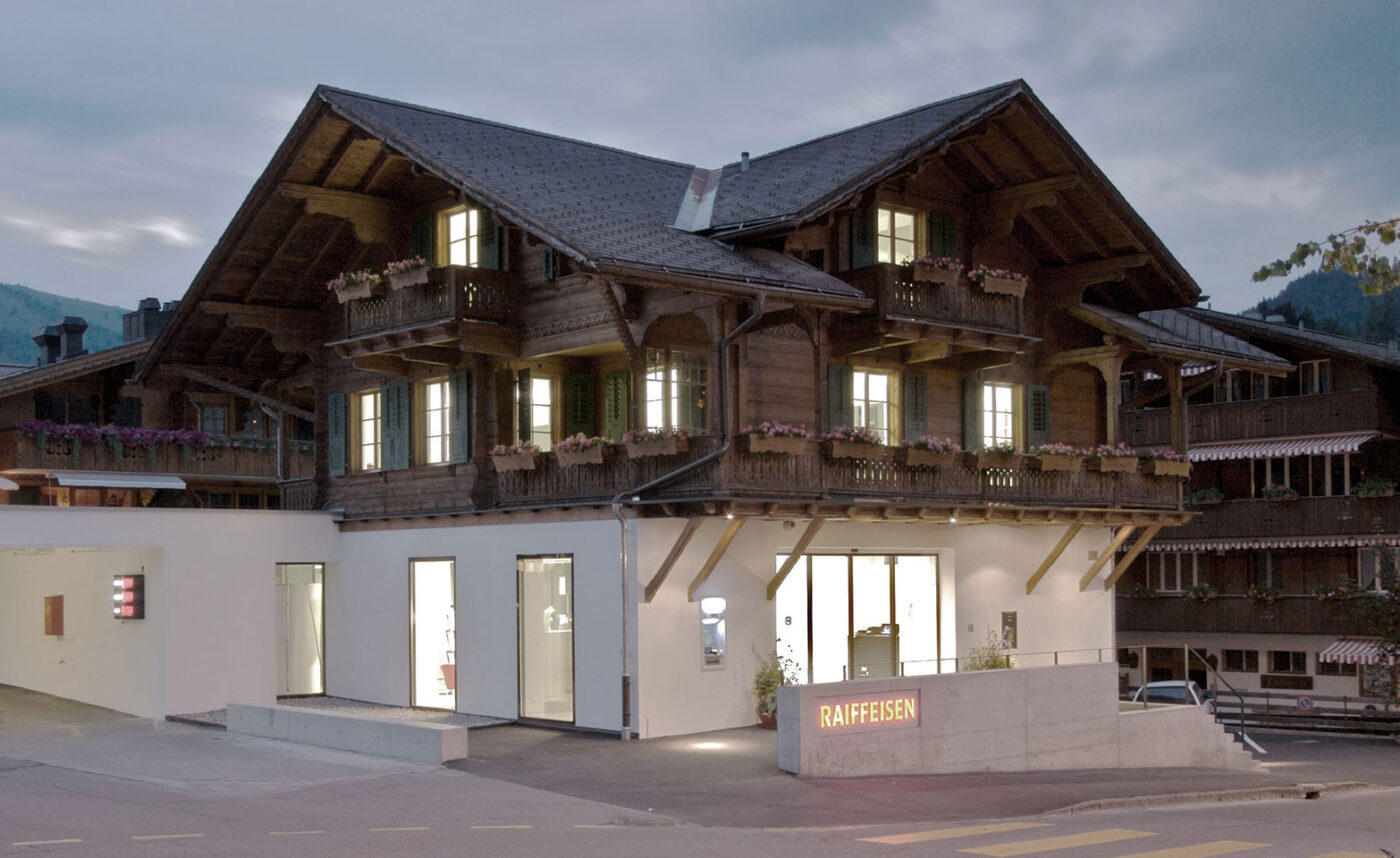 Bauherr: Raiffeisenbank Saanenland / Status: Realisiert / Jahr: 2006 / Art: Dienstleistungsbauten / Standort: Gstaad BE / Planung und Bau: 2005-06