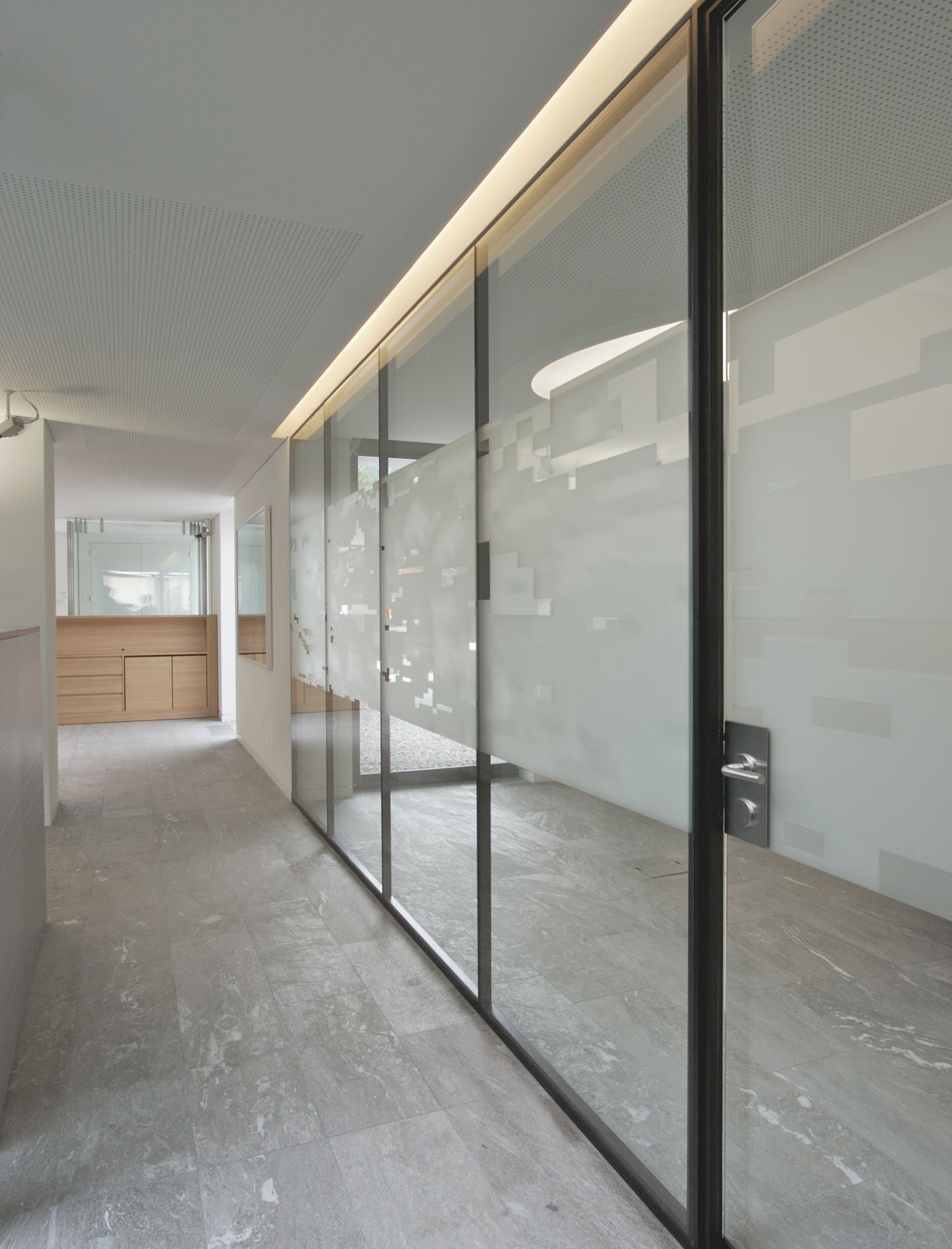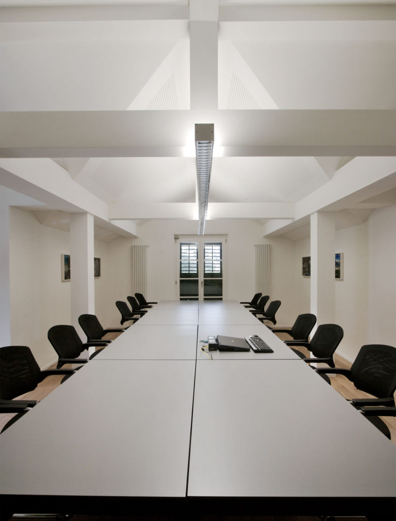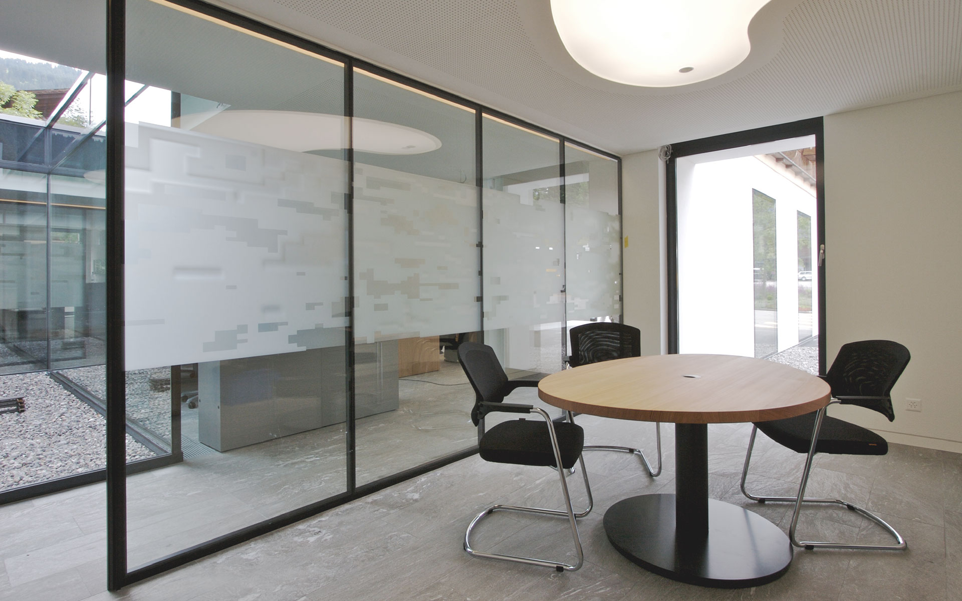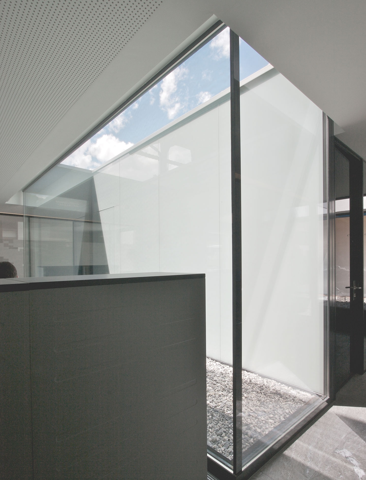 Zentrales Element ist das Glasatrium in der Mitte des Raums, das eine räumliche Gliederung macht und Licht in den Raum bringt. Daneben gibt es drei Fassadeneinschnitte, ebenfalls mit der Aufgabe, die Räume zu erhellen.