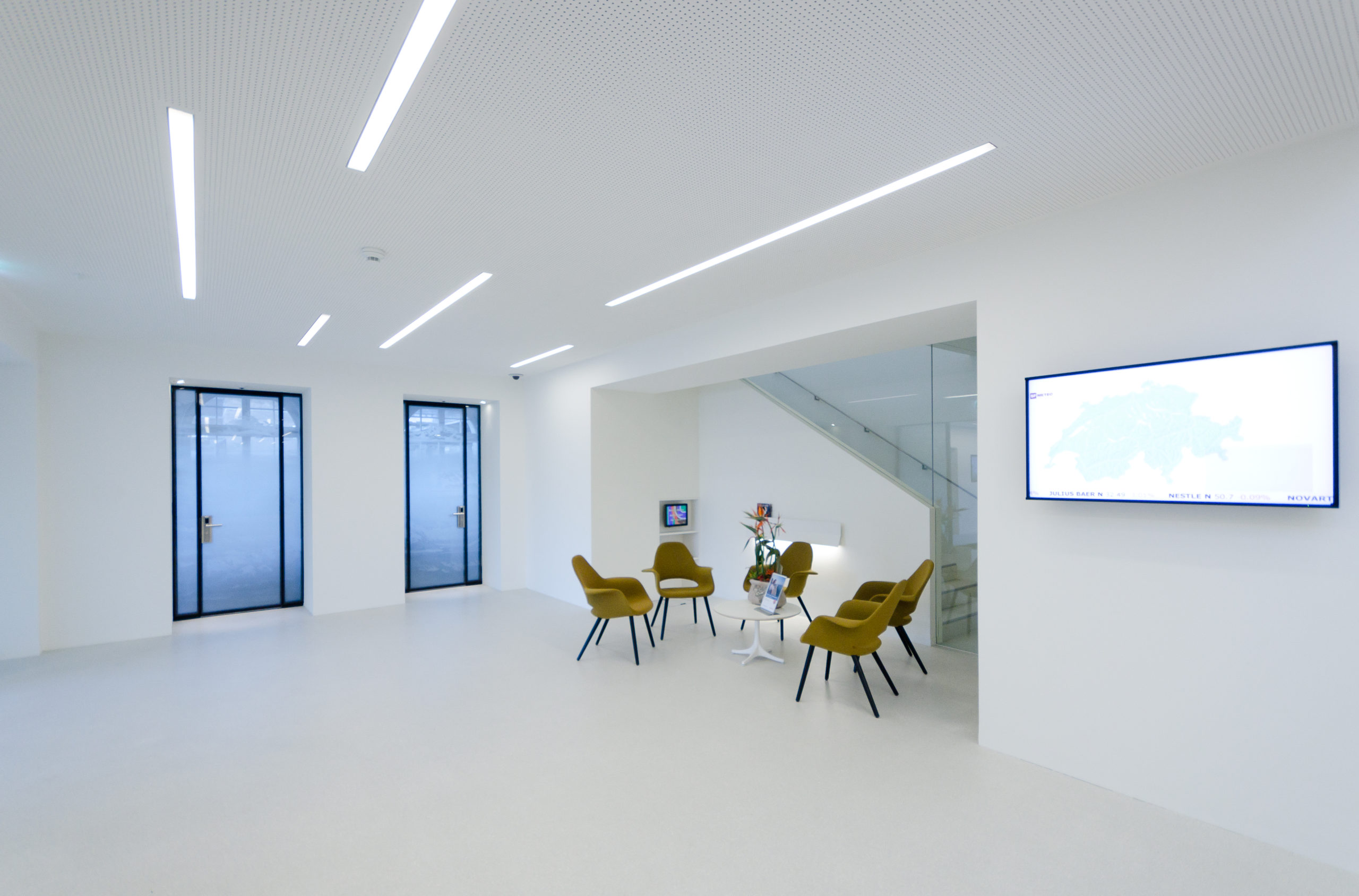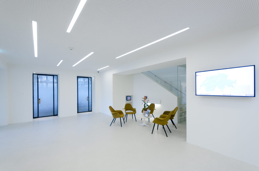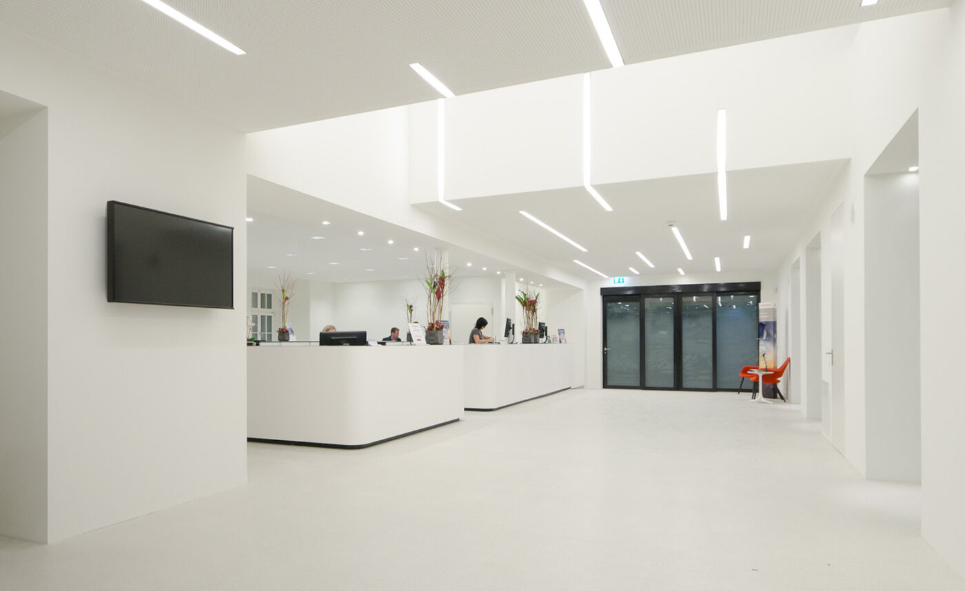 Der Grundriss im Erdgeschoss zeichnet sich durch seine grosse fensterlose Gebäudetiefe aus und entfacht damit eine problematische Belichtungssituation. Mit dem Ausbilden des zenitalen Lichtraums und dem Vergrössern der Bogenfenster entstehen freundliche lichtdurchflutete Räume. Die bündig in die Decke eingelassenen Balkenleuchten vermögen diese, neu geschaffene, Situation in subtiler Art und Weise zu ergänzen.