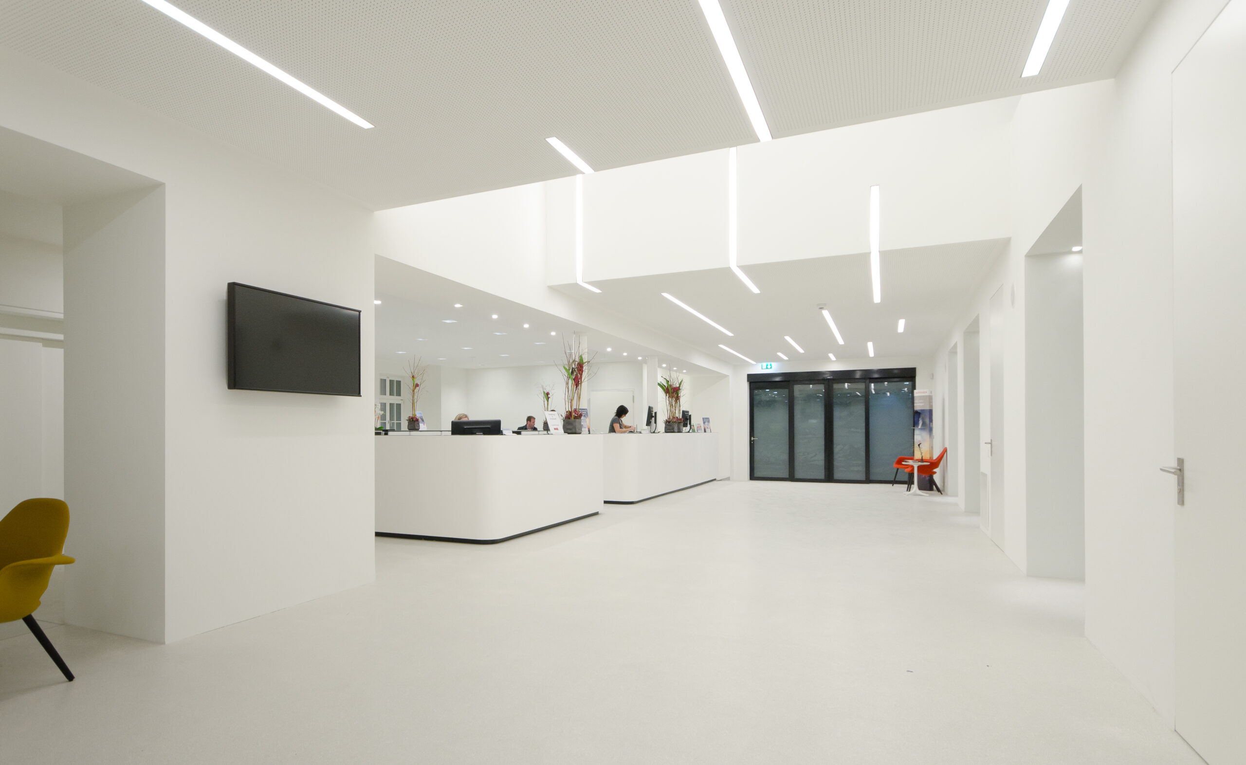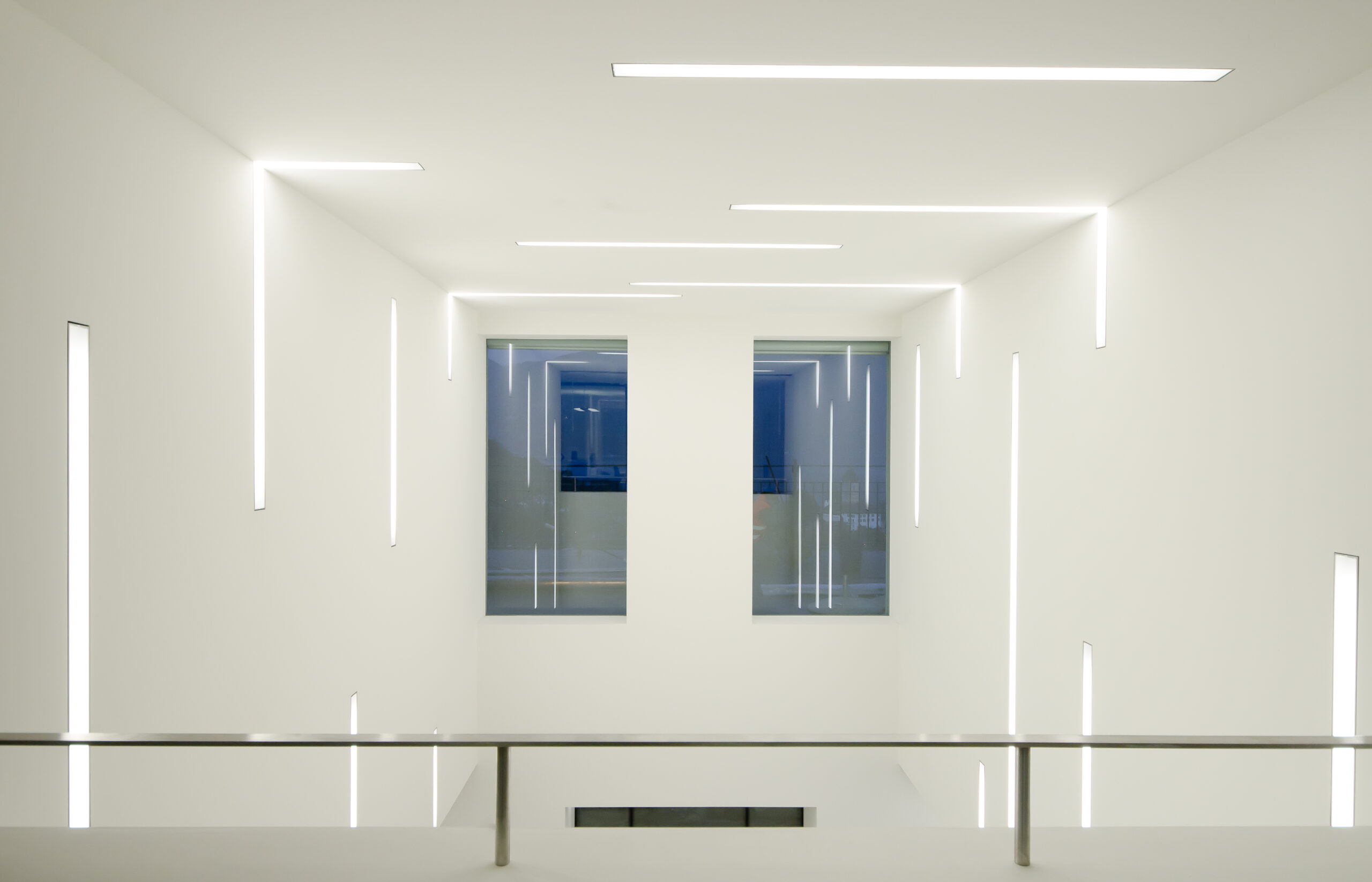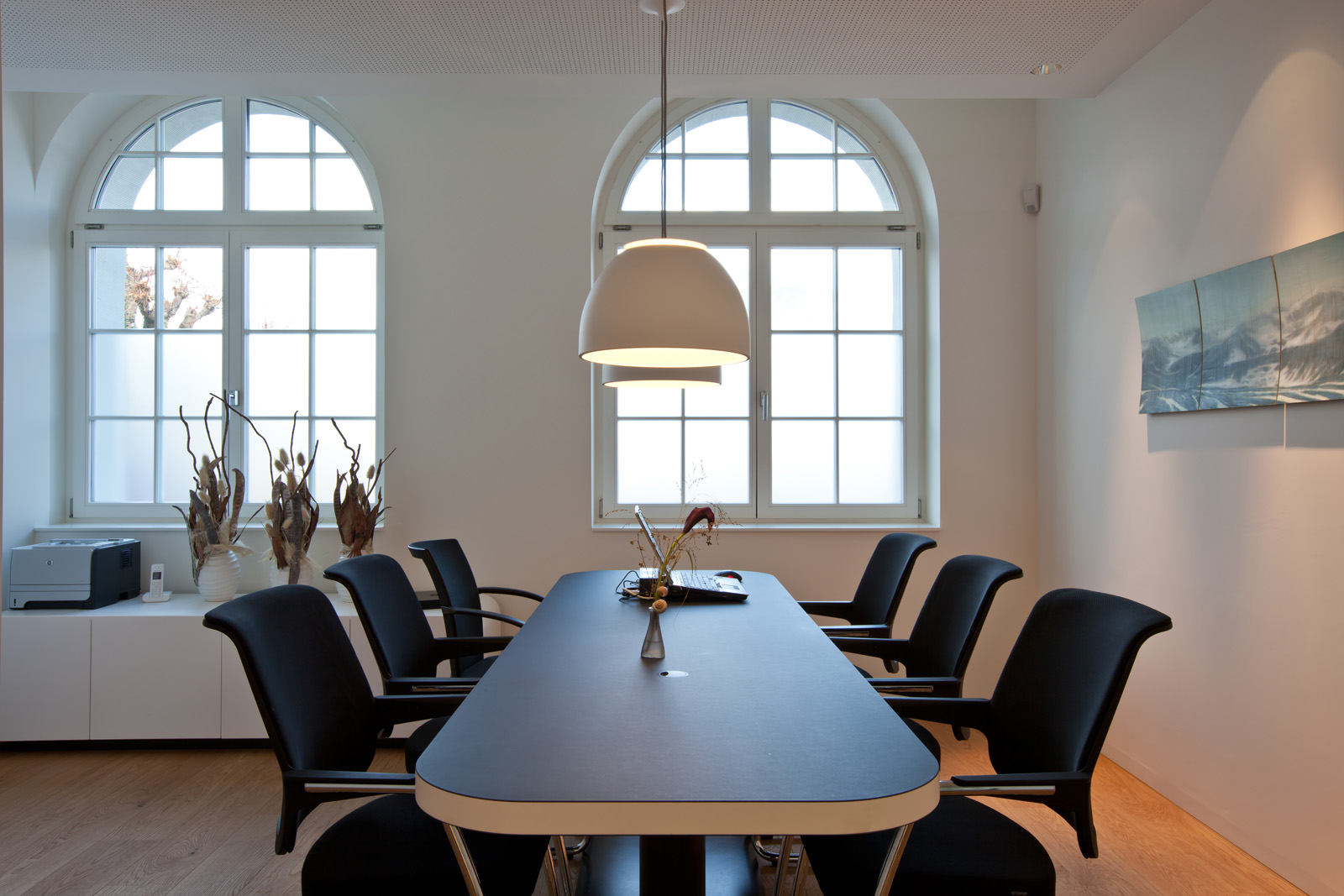 Der Grundriss im Erdgeschoss zeichnet sich durch seine grosse fensterlose Gebäudetiefe aus und entfacht damit eine problematische Belichtungssituation. Mit dem Ausbilden des zenitalen Lichtraums und dem Vergrössern der Bogenfenster entstehen freundliche lichtdurchflutete Räume. Die bündig in die Decke eingelassenen Balkenleuchten vermögen diese, neu geschaffene, Situation in subtiler Art und Weise zu ergänzen.