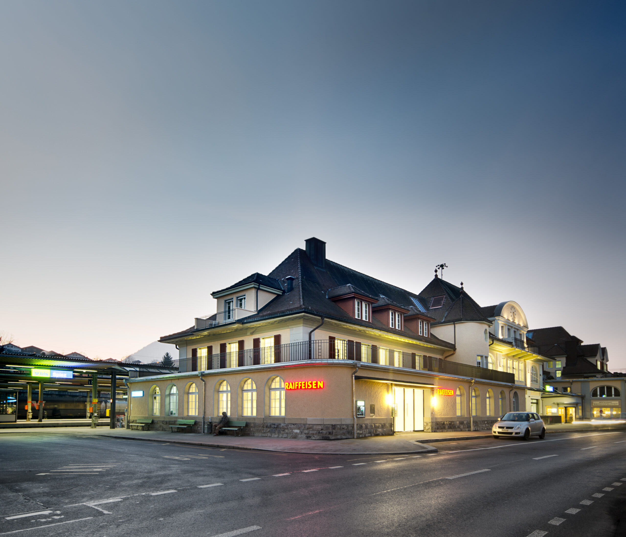 Viel Licht, viel Raum, eine optimale Organisation, dies waren die Anforderungen an die Renovation, damit sich in der Raiffeisenbank Spiez sowohl Kunden als auch die Bankmitarbeiter wohl fühlen können. Dafür benötigte das historische Bahnhofsgebäude eine räumliche Klärung des Grundrisses sowie eine Aufwertung des Erscheinungsbilds der Fassaden. Durch den Einbau eines zweigeschossigen Lichthofes, unter Anwendung einer markanten Belichtung und heller Materialien erhielt die Bank eine klare Ausstrahlung. Dies wurde erreicht, indem die publikumsnahen Räume im Erdgeschoss und die bankinternen Räume im Obergeschoss angeordnet wurden. Über zwei Eingänge gelangt man in die Kundenhalle, dem Herzstück der umgebauten Bank, mit Frontoffice und Besprechungszimmern.