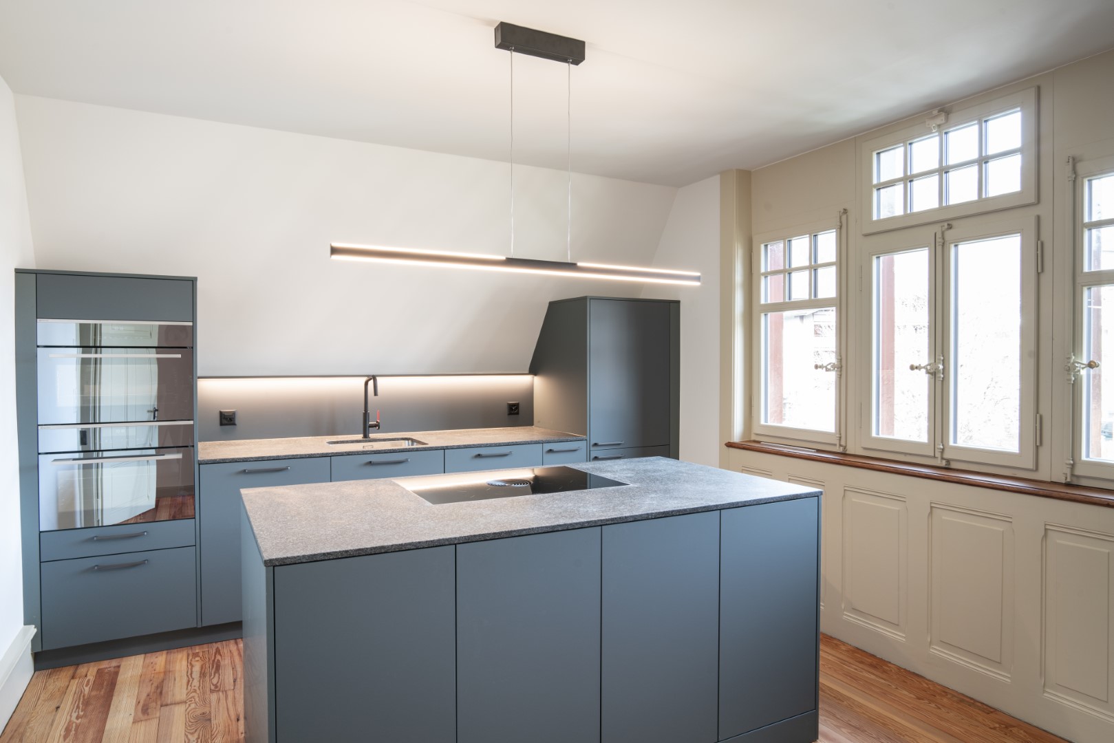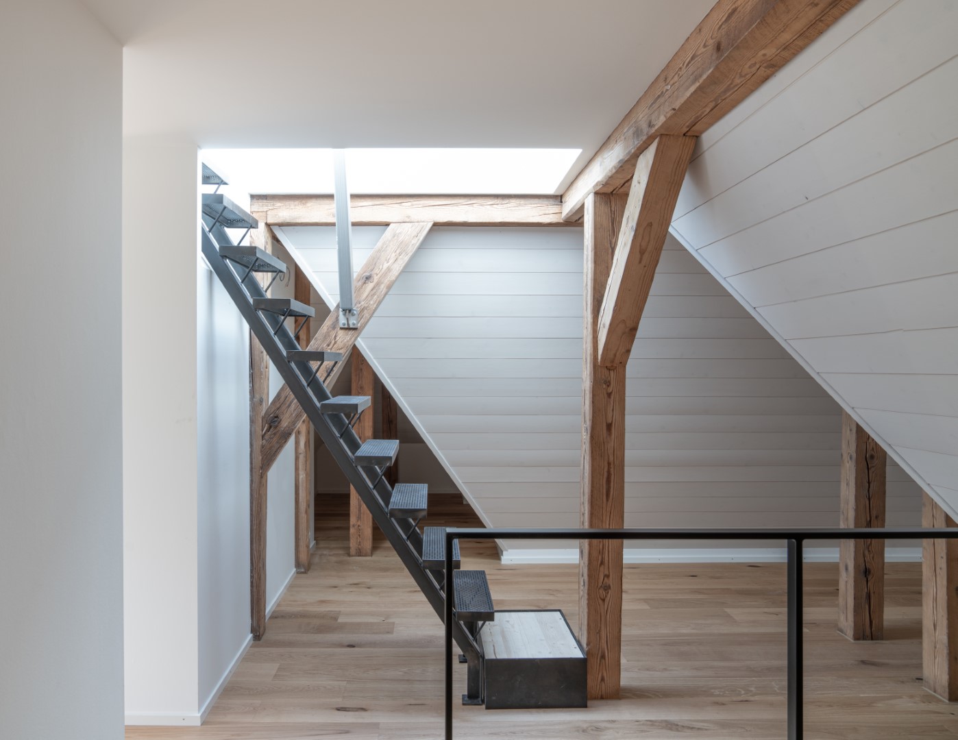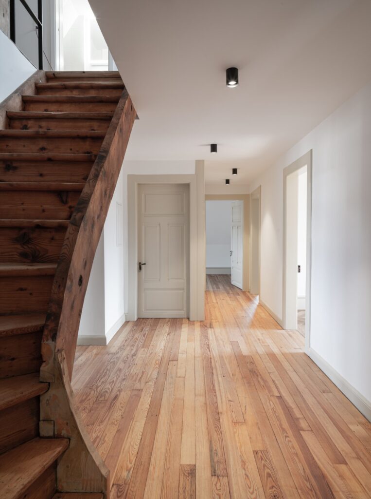 Im Inneren wurden drei zeitgemässe Wohnungen geschaffen. Die Aus- und Umbauten orientieren sich einerseits am historischen Bestand, berücksichtigen andererseits aber auch die Wünsche und Anforderungen der Bauherrschaft. So entstand ein harmonisches Zusammenspiel von Alt und Neu, das die Geschichte des Hauses weiterträgt, ohne in ihr zu verharren.
