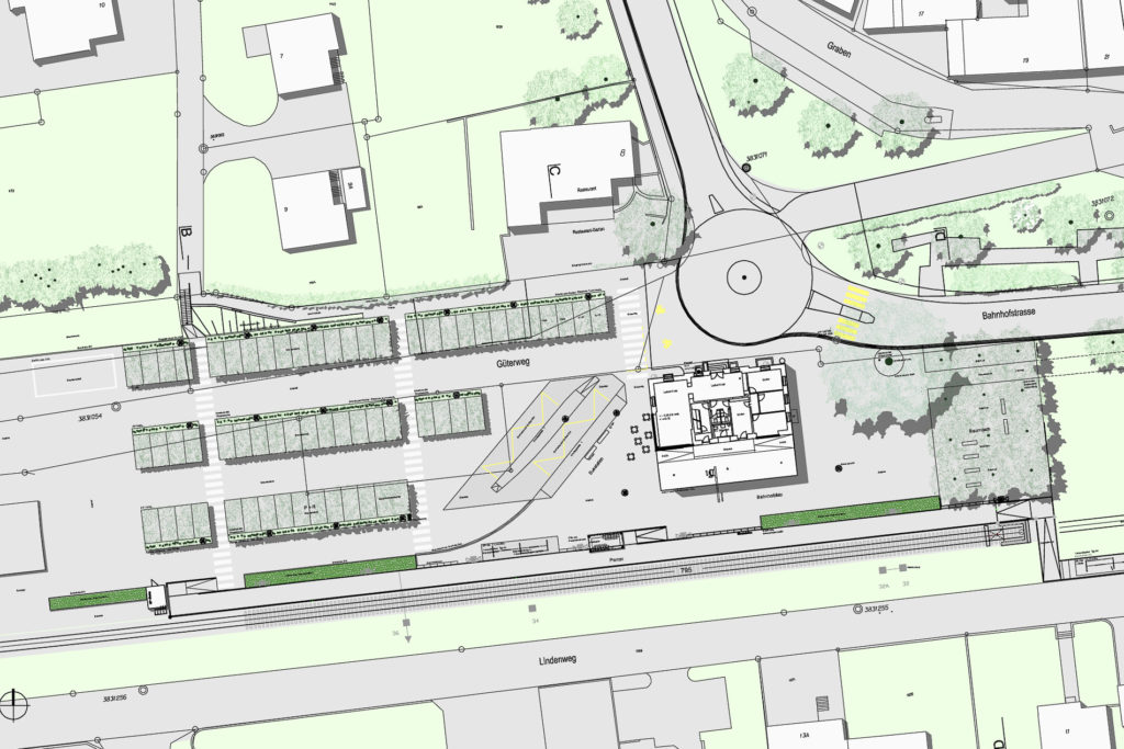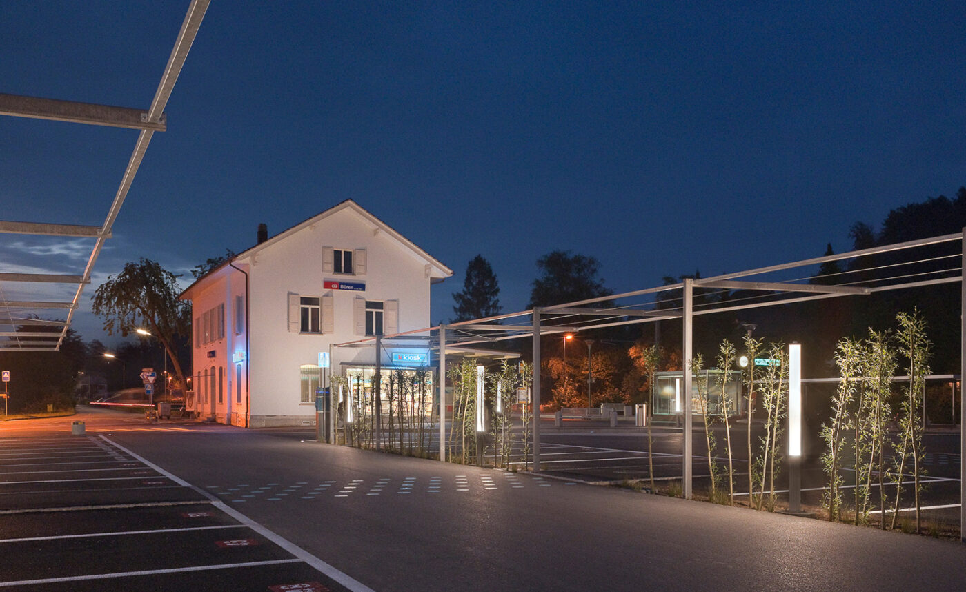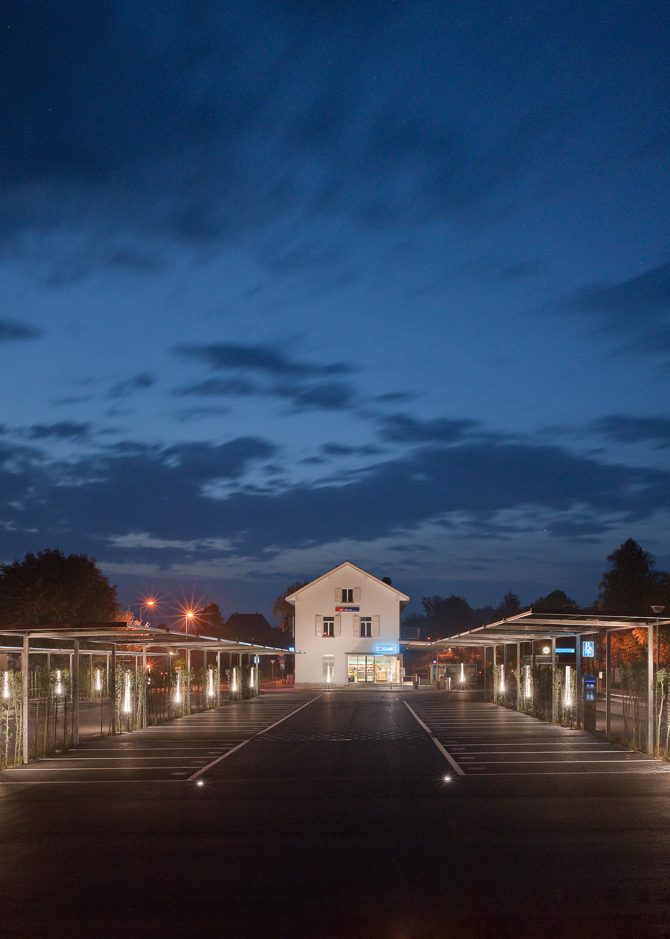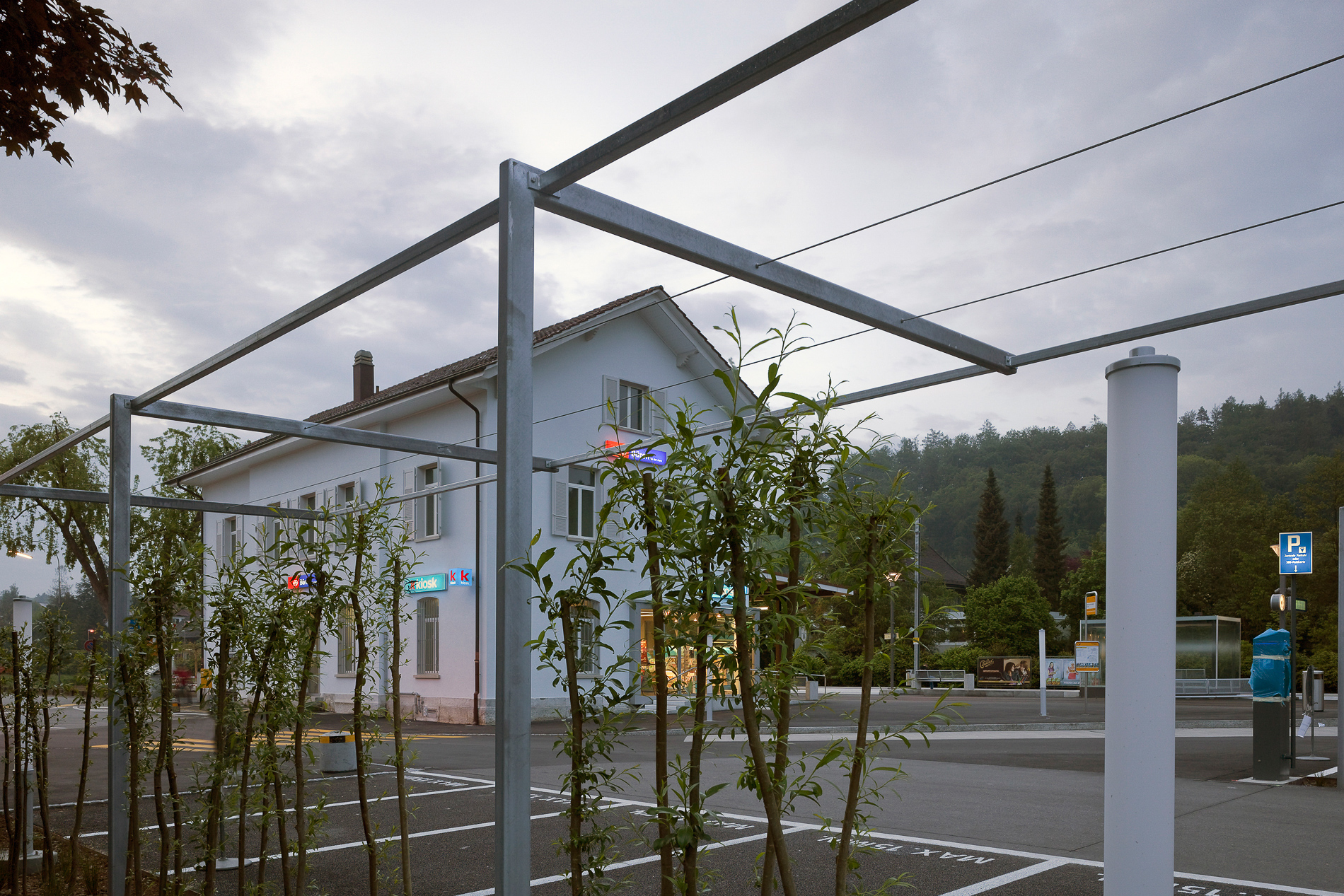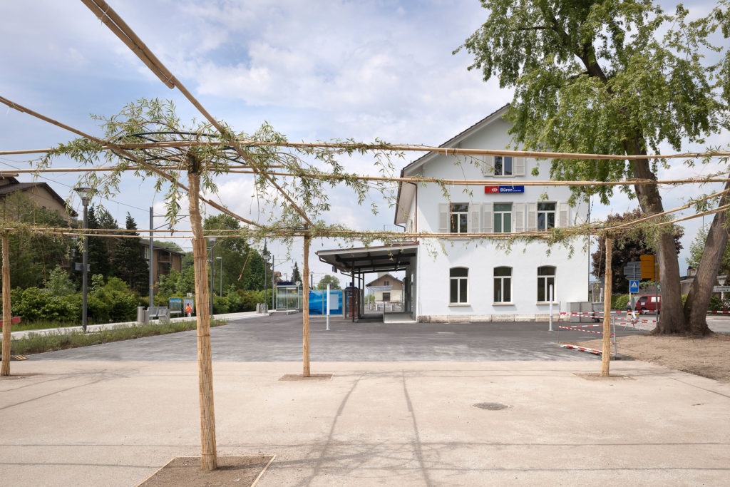Für die Umgebungsarbeiten war der Ausgangspunkt für die Projektidee die Optimierung der Umsteigebeziehungen sowie die Schaffung eines möglichst grossen Angebotes an Parkplätzen für die Pendler. Räumlich wird das ehemalige Bahnhofsgebäude mit den grünen Lauben und dem Baumdach am östlichen Arealabschluss klar gefasst und wieder verortet. Die Wirklichkeit der Aufgabe ist das Konkrete, das Form-, Masse- und Raumgewordene – in dem Sinne eine nicht-referentielle Lösung.
