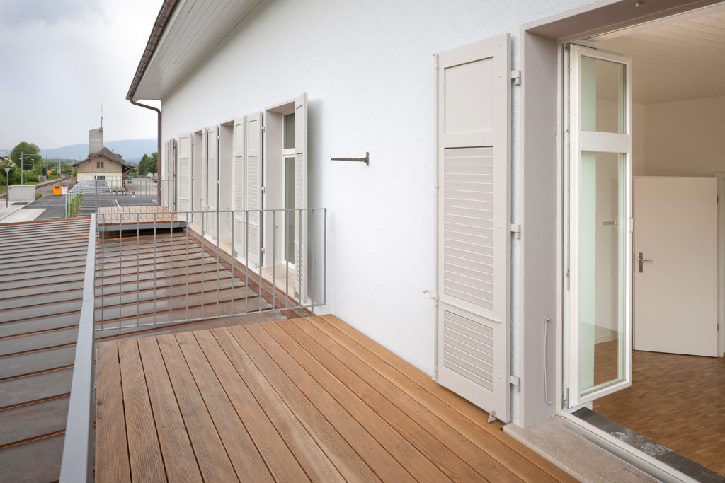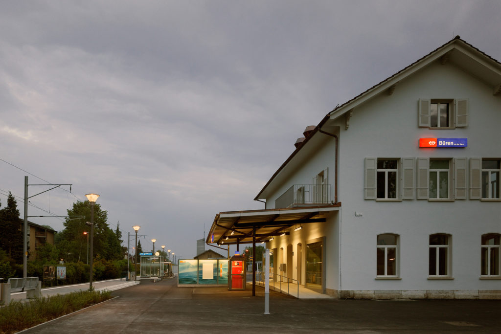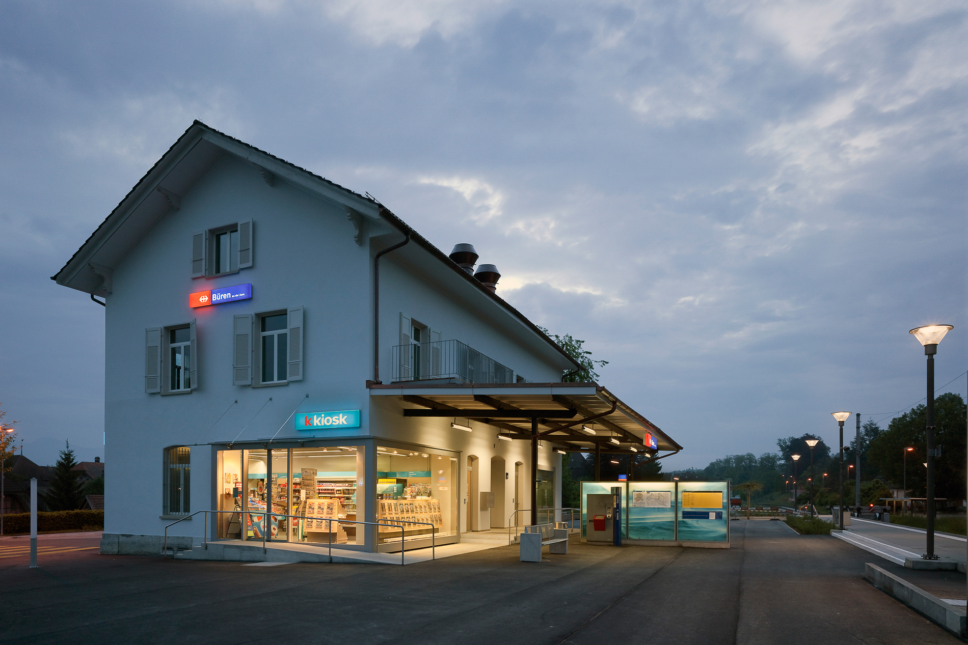 Ursprünglich war vorgesehen, das alte Bahnhofgebäude aus den 1870er Jahren abzubrechen und durch ein Kundencenterdach mit Kioskneubau und Veloabstellplätzen zu ersetzen. Dem Abbruch des Bahnhofgebäudes wurde aus denkmalpflegerischen Gründen nicht zugestimmt. Beim Bahnhofsgebäude es handelt sich um einen fünfachsigen „Maring“ – Bau (Rudolf Ludwig Maring war von 1854-1861 Direktionsarchitekt der Schweizer Zentralbahn). Das Gebäude wurde in Massivbauweise mit zwei Vollgeschossen und Satteldach erstellt. Zwar wurde es durch frühere Eingriffe stark purifiziert (die Zierelemente wurden entfernt), seine denkmalpflegerische Bedeutung aber aufgrund seiner Lage als Einzelobjekt immer noch hoch. Im Erdgeschoss wurde das alte Stellwerk zurückgebaut, der nachträglich angebaute Kiosk wurde ins Gebäudeinnere verlegt und die Fensterflächen wurden für die Verkaufs- und Büroflächen vergrössert. Dabei wurde darauf geachtet, dass die dreiteilige Grundstruktur weitmöglichst erhalten bleibt. Im Obergeschoss wurden die zwei bestehenden Wohnungen erneuert und die Mansarden im Dachgeschoss aufgewertet. Die Farb- und Materialgestaltung erfolgt in enger Zusammenarbeit mit der Denkmalpflege SBB und dem Bundesamt für Kultur.