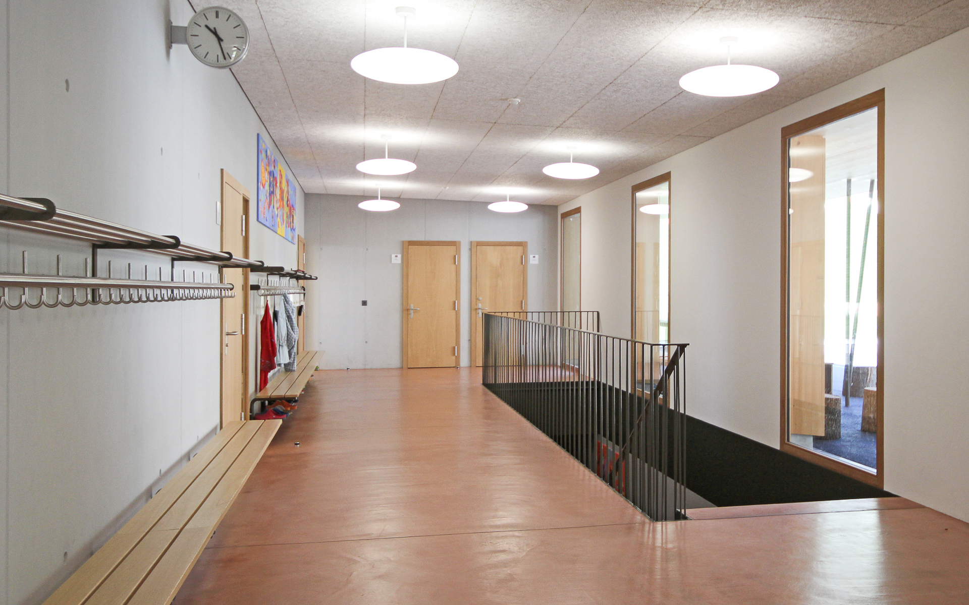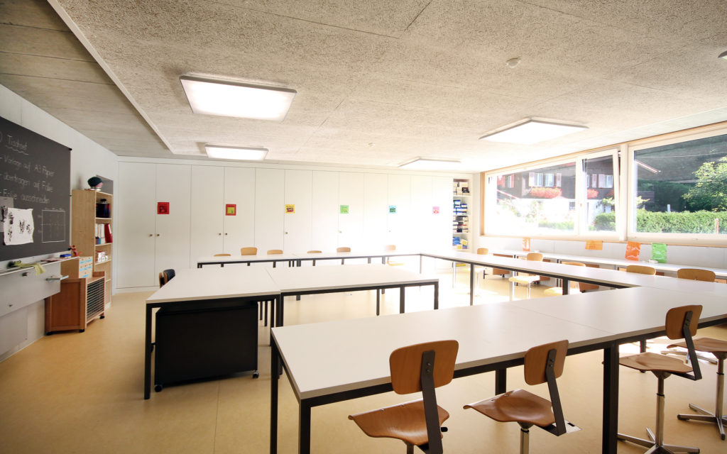 Im Erweiterungsbau sind je drei Schulzimmer/Gruppenräume, die Gestalten techn./text. Räume sowie die Bibliothek, Musikraum und Spezialunterricht untergebracht. Durch die Aufschüttung des Sportplatzes gelangt man auf Erdgeschossniveau vom Neubau in den Basisstufentrakt.