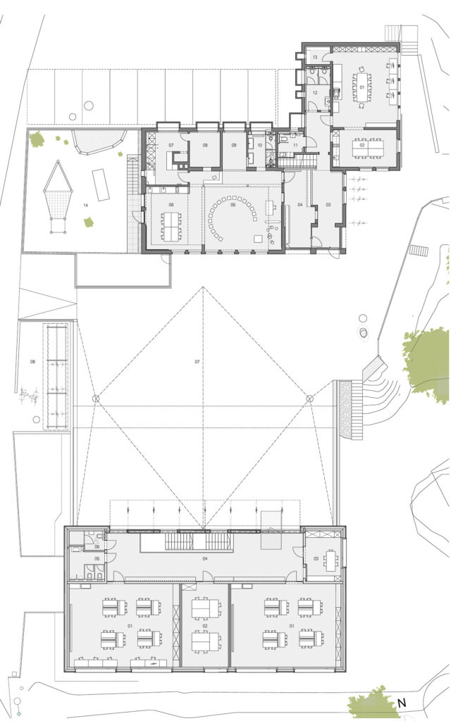 Die Umgebung ist stark geprägt durch das Spannungsfeld zwischen dem fliessenden Hang, dem Wald, der lockeren Bebauung und den angrenzenden Bergwiesen. Die Positionierung des Baukörpers am Standort vom Altbau schafft grosse Freiräume mit einem engen Bezug zur Umgebung, sowie zur übergeordneten Landschaft (Ausblicke). Der ruhige, gefasste Innenhof zwischen den Bauten dient als Hartplatz, und Pausenplatz. Es entsteht ein unverwechselbarer Ort mit hohem Stimmungsgehalt, welcher zum Verweilen einlädt.