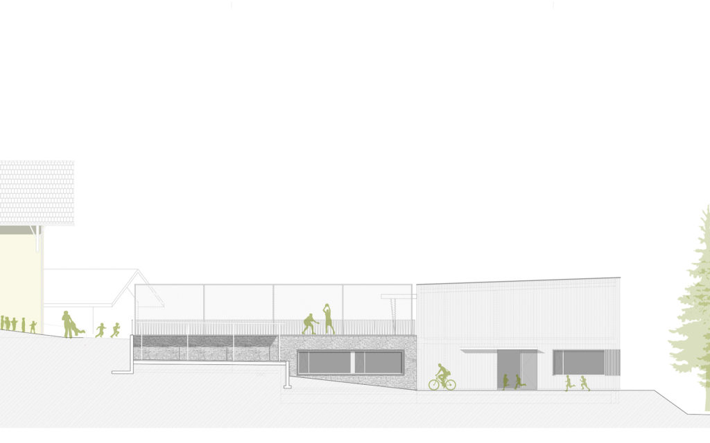Die Umbauvariante sieht einen freistehenden Erweiterungsbau vor, welcher in Form eines Riegels die südliche Abgrenzung des Schulareals vornimmt. Die genaue Platzierung lässt dem bestehenden Schulgebäude genügend Freiraum und fasst den Schulhof. Der zweigeschossige Annexbau fügt sich sanft in die abgestufte Topographie.