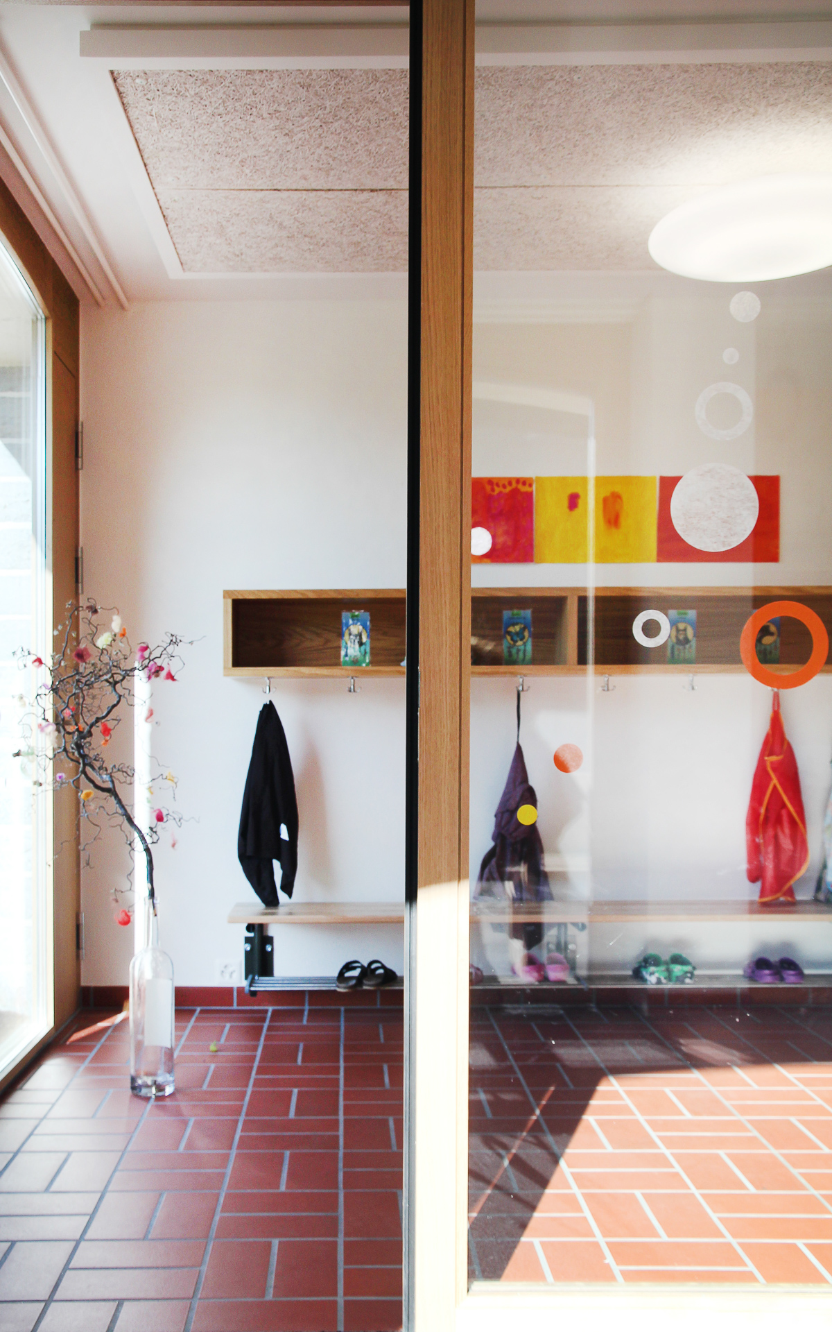 Die räumliche Situation ermöglicht eine klare Trennung von Basisstufe und Primarstufe. Der Altbau beherbergt im Erdgeschoss den Kindergarten während im Obergeschoss je zwei Klassenzimmer und Gruppenräume untergebracht sind. Die vorhandene Raumstruktur wird weiter genutzt, was eine kleine Einschränkung in der Grösse der Basisstufenzimmer bedeutet. Mit der Platzierung des Lehrer/Schulleiterbereich und des Mittagstisch im Obergeschoss wird die Aussicht/Aufsicht über den ganzen Pausenplatz gewährleistet.