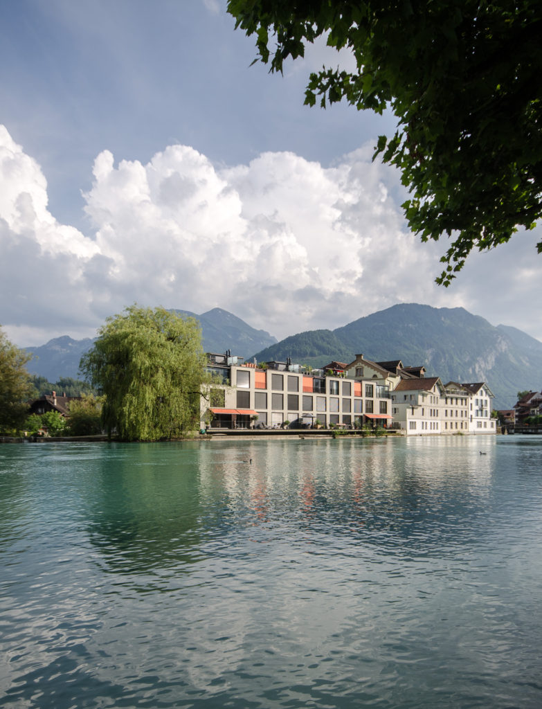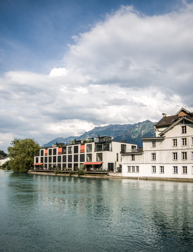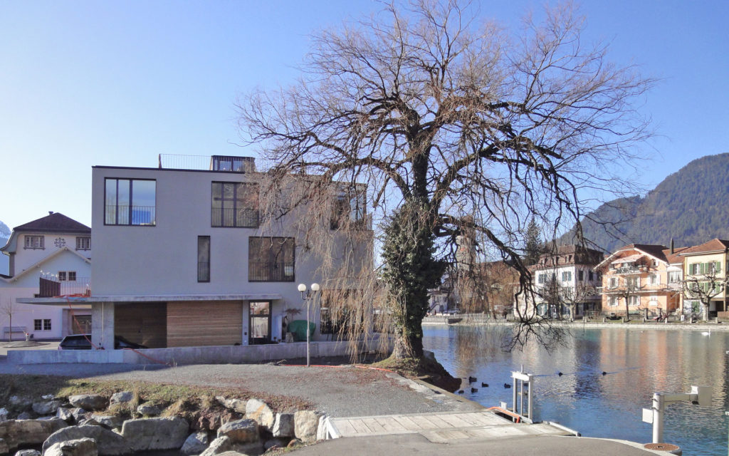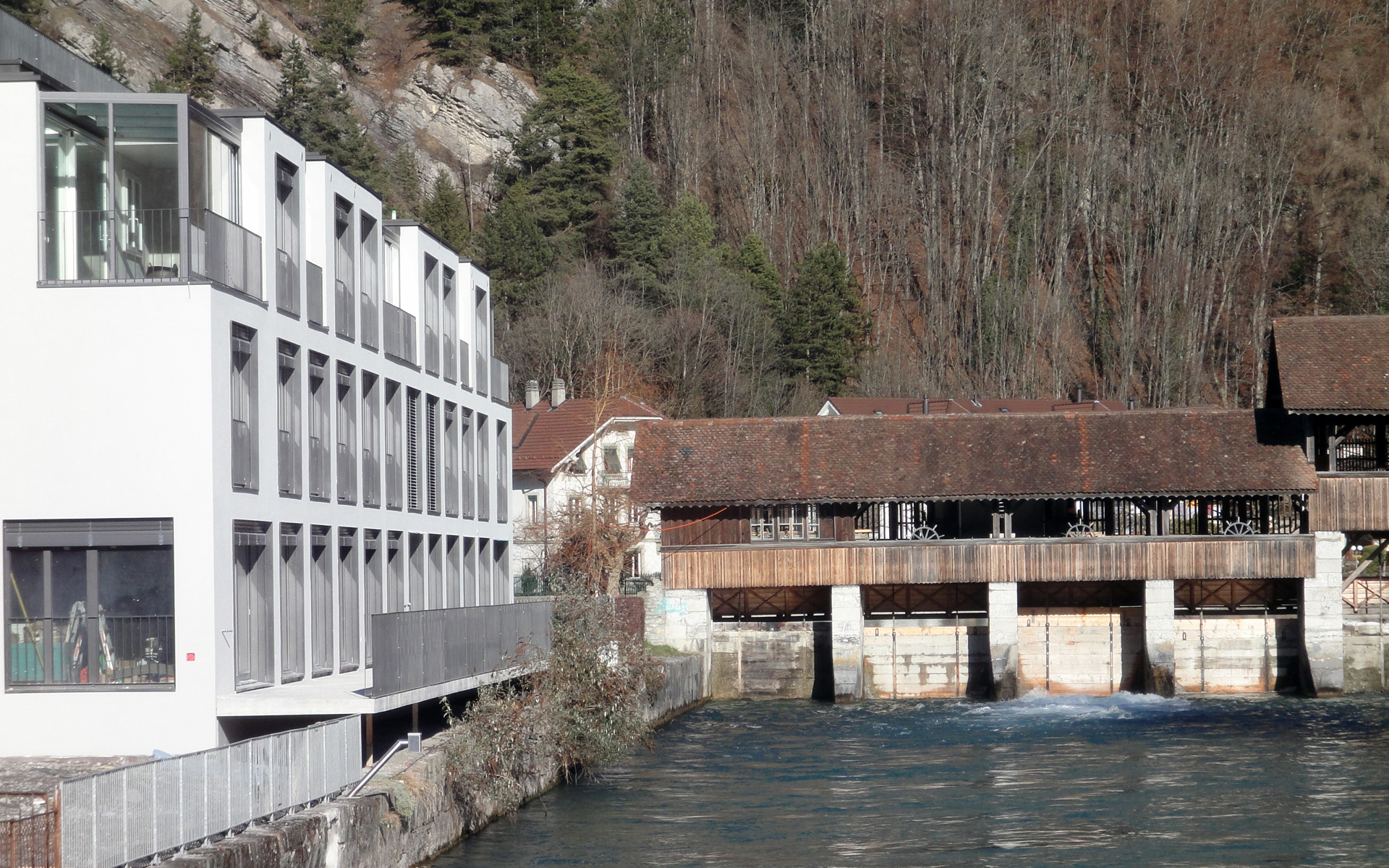 Das geräuschvolle Wehr auf der Nordostseite, die Rückseite der bestehenden Gebäudezeile entlang der Spielmattestrasse auf der Südwestseite, die ruhige, seeartige Aare auf der Nordwestseite und die bewegte Grosse Aare auf der Südostseite bilden den Rahmen des Grundstücks. Einzigartig für Unterseen ist, dass die Gebäude direkt an der Uferlinie stehen. Aus der Absicht alle Wohnungen auf das Wasser auszurichten, folgt die geschlossene Bebauung dem Ufer. Erstellt wurden 16 Eigentumswohnungen, welche jede einen Bezug zur attraktiven Wasserseite hat. Dadurch entsteht ein Innenhof, der einerseits als Erschliessungszone für die neuen Wohnungen und für die bestehenden Mühle Gebäude und andererseits als Verbindung zwischen Spielmattestrasse und Uferweg dient.