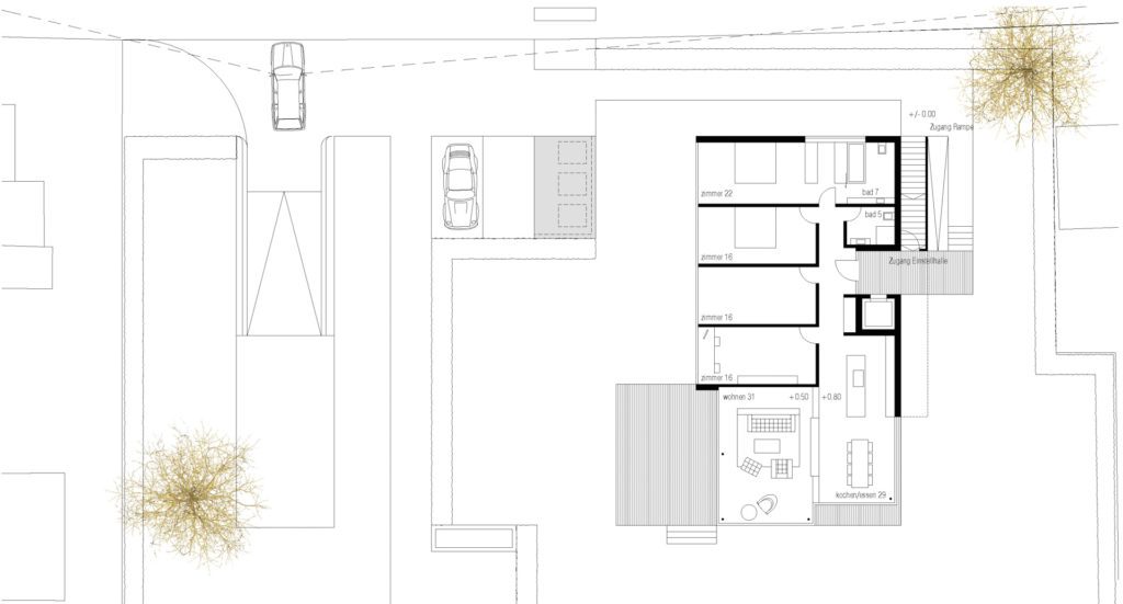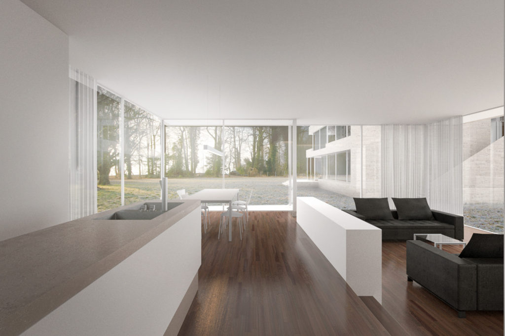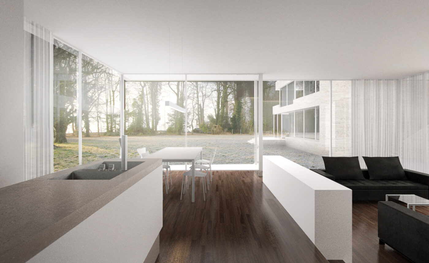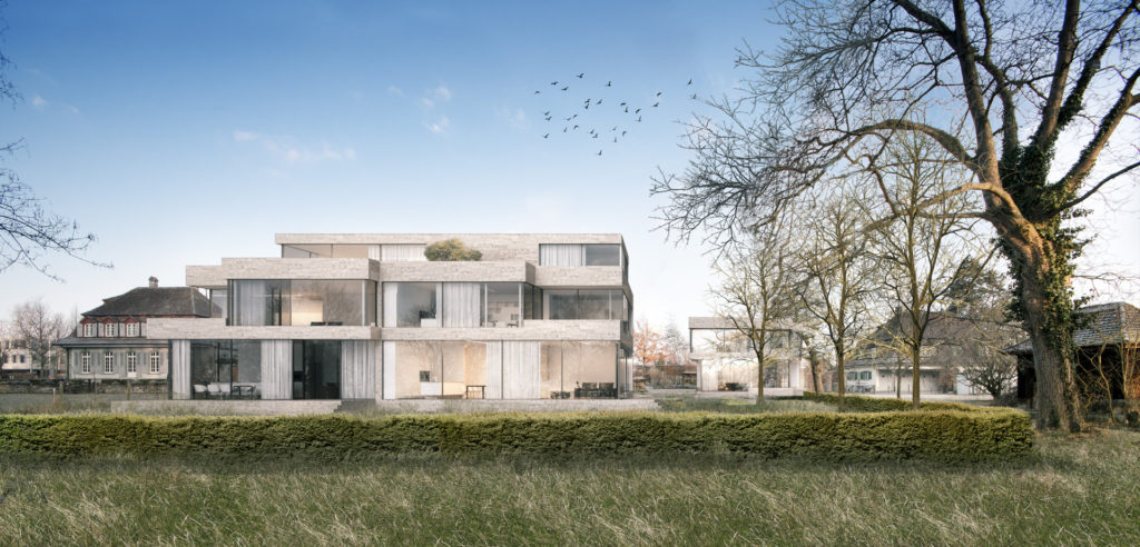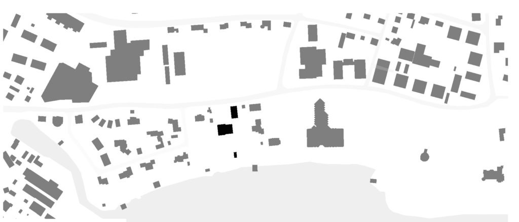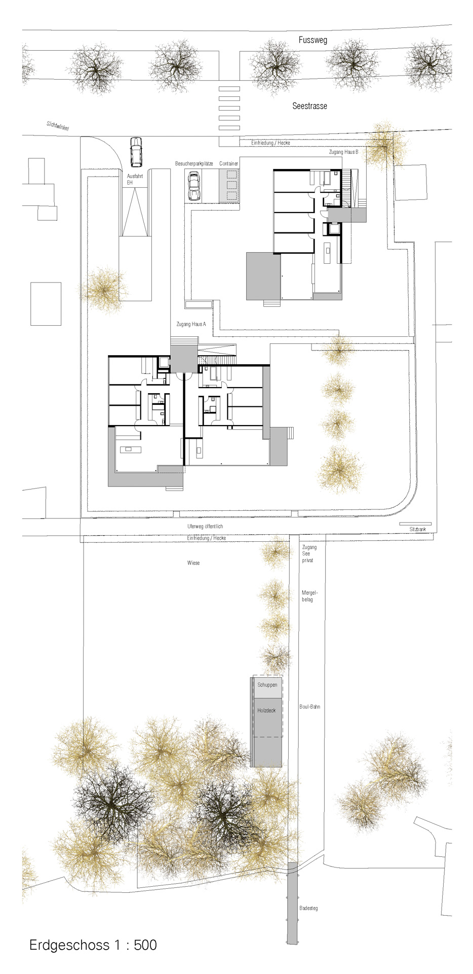 Der Uferstreifen zwischen See und Seestrasse ist gekennzeichnet durch seine lockere Bebauungsstruktur zum Einen und dem Baumbestand in unmittelbarer Ufernähe. Zum villenartigen Haupthaus gesellen sich jeweils verschiedene Nebengebäude wie Garagen oder Bootshäuser. Über die strassenseitige Parzelle spannt sich eine schachbrettartige Struktur auf aus Baukörpern und Raumkörpern (Freiräumen). Die Bauvolumen sind so gesetzt, dass jedes Gebäude möglichst grosse Freiflächen vorgelagert erhält. Auf der Hauptparzelle werden so ein Doppelhaus und ein Einzelhaus mit halber Grundfläche positioniert. Ein drittes Bauvolumen flankiert auf dem Seeseitigen Baufeld den privaten Gehweg zum Seeufer. Damit wird die Analogie zur Angrenzenden Bebauungstypologie (Haupthaus, Gärtnerhaus und Bootshaus) interpretiert.