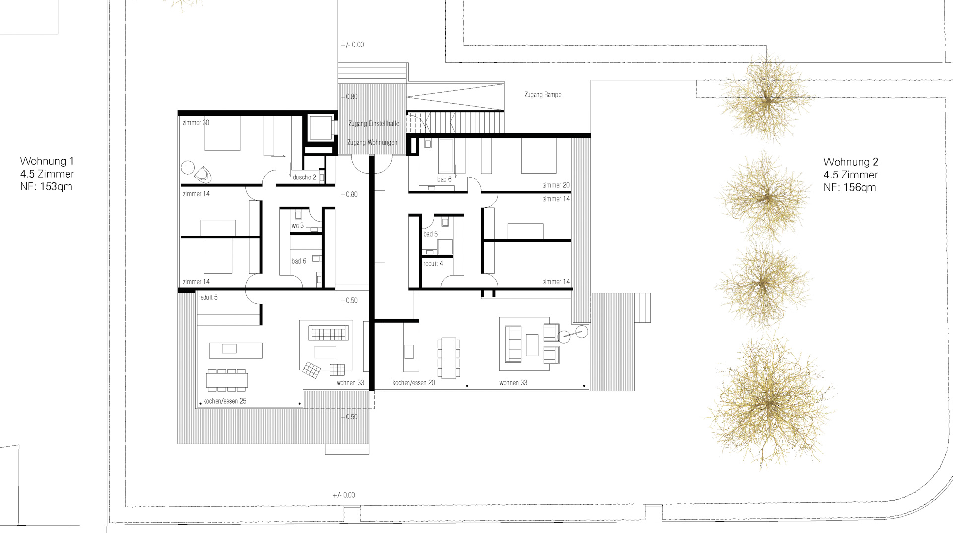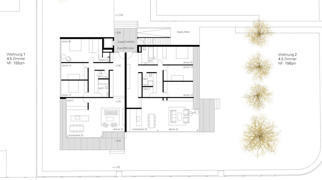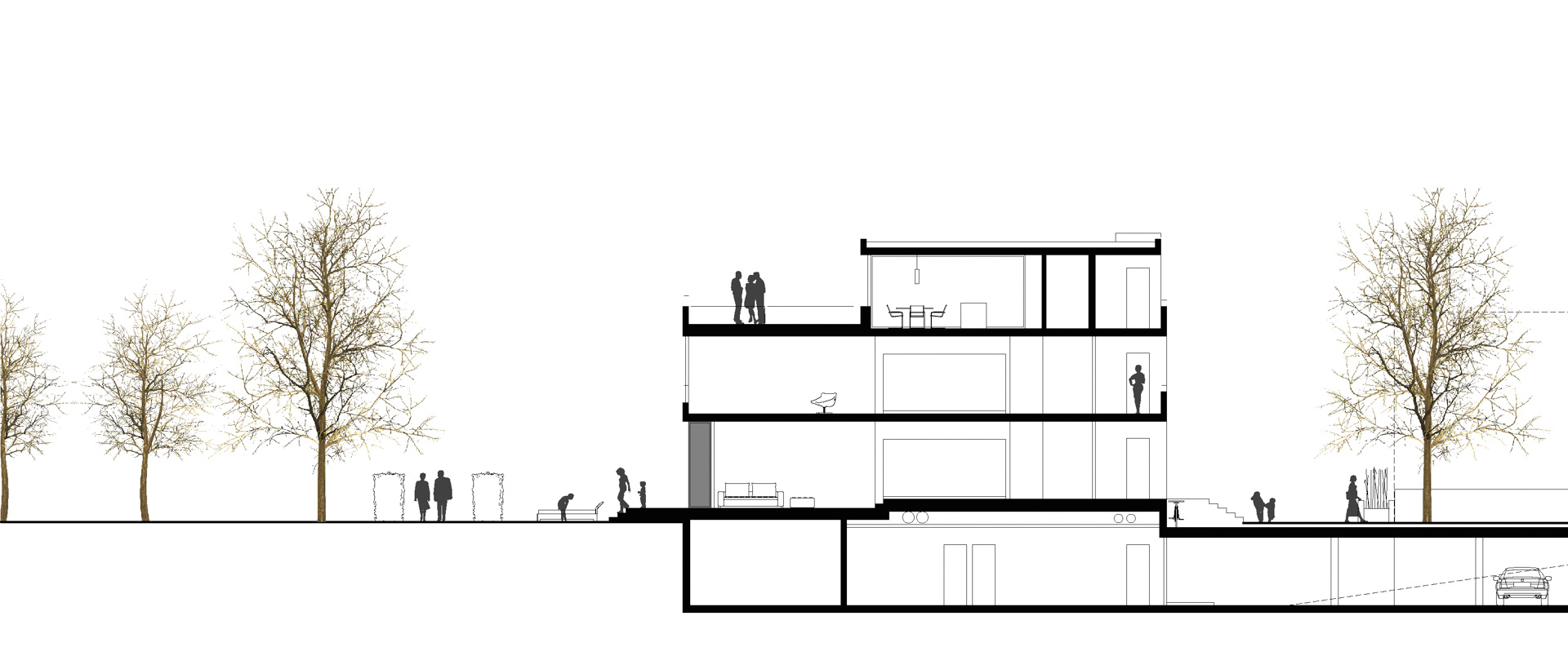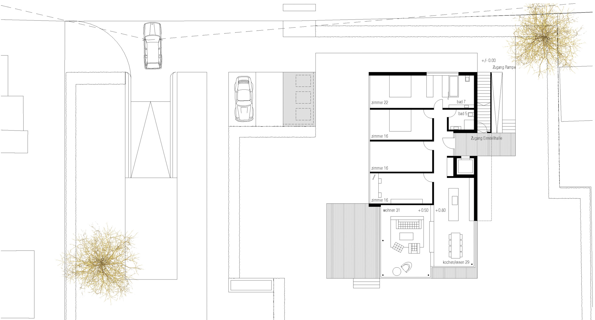 Der Uferstreifen zwischen See und Seestrasse ist gekennzeichnet durch seine lockere Bebauungsstruktur zum Einen und dem Baumbestand in unmittelbarer Ufernähe. Zum villenartigen Haupthaus gesellen sich jeweils verschiedene Nebengebäude wie Garagen oder Bootshäuser. Über die strassenseitige Parzelle spannt sich eine schachbrettartige Struktur auf aus Baukörpern und Raumkörpern (Freiräumen). Die Bauvolumen sind so gesetzt, dass jedes Gebäude möglichst grosse Freiflächen vorgelagert erhält. Auf der Hauptparzelle werden so ein Doppelhaus und ein Einzelhaus mit halber Grundfläche positioniert. Ein drittes Bauvolumen flankiert auf dem Seeseitigen Baufeld den privaten Gehweg zum Seeufer. Damit wird die Analogie zur Angrenzenden Bebauungstypologie (Haupthaus, Gärtnerhaus und Bootshaus) interpretiert.