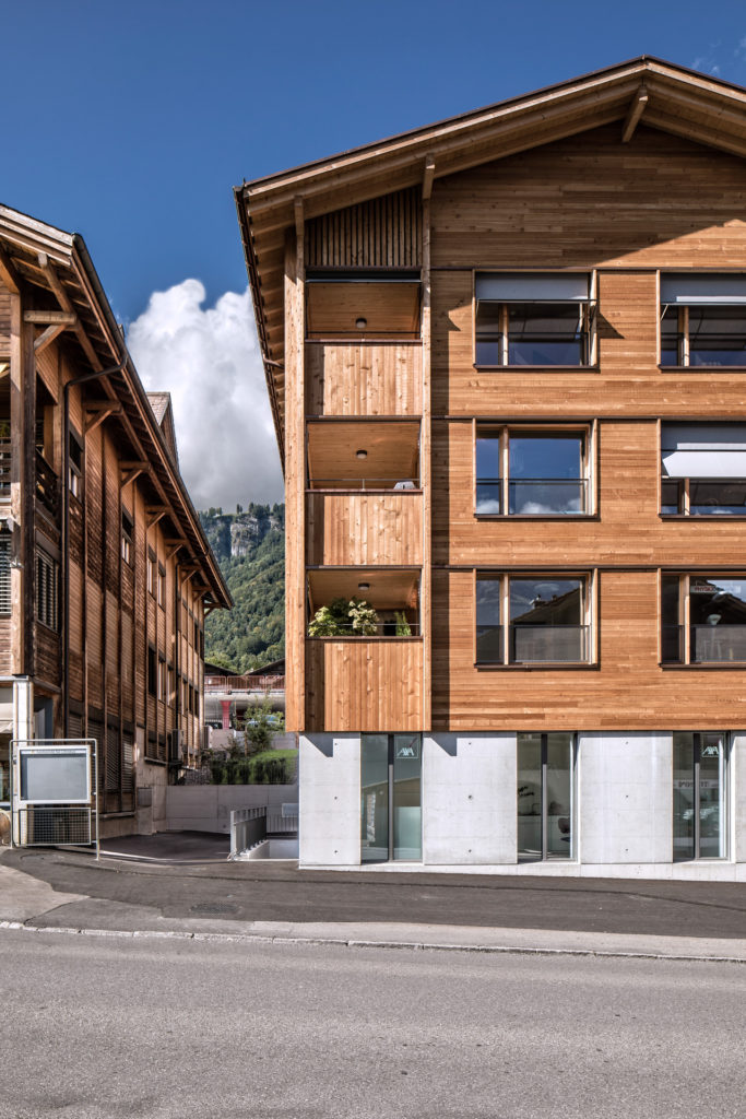 Durch die Verschiebung der beiden Baukörper entsteht ein städtischer Platz, welcher typisch ist für das Strassendorf Brienz. Die Häuser nehmen typologische Motive aus der Bebauung von Brienz auf: Sockel, Laubenausbildung, Dachform und Dachneigung