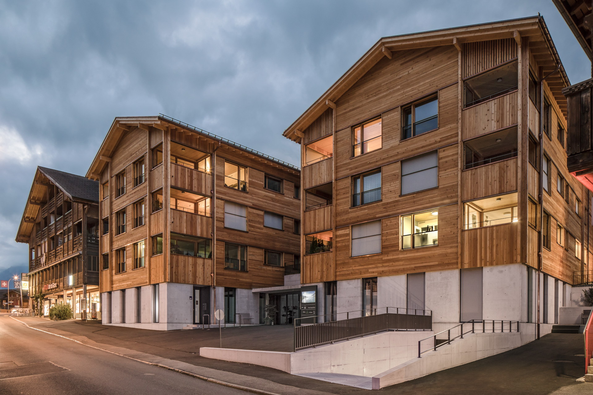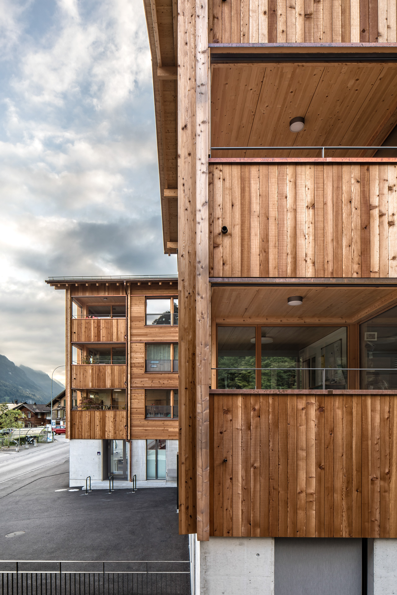 Das Sockelgeschoss und die Treppenhauskerne sind in Sichtbeton ausgeführt, während die Obergeschosse in einer Holzrahmenkonstruktion mit hohem Vorfertigungsgrad gebaut sind. Der Charakter der Holzbauten zeigt sich an den Fassaden in Form einer Lärchen-Schalung aus Schweizer Holz und geölten Lärchenfenstern.