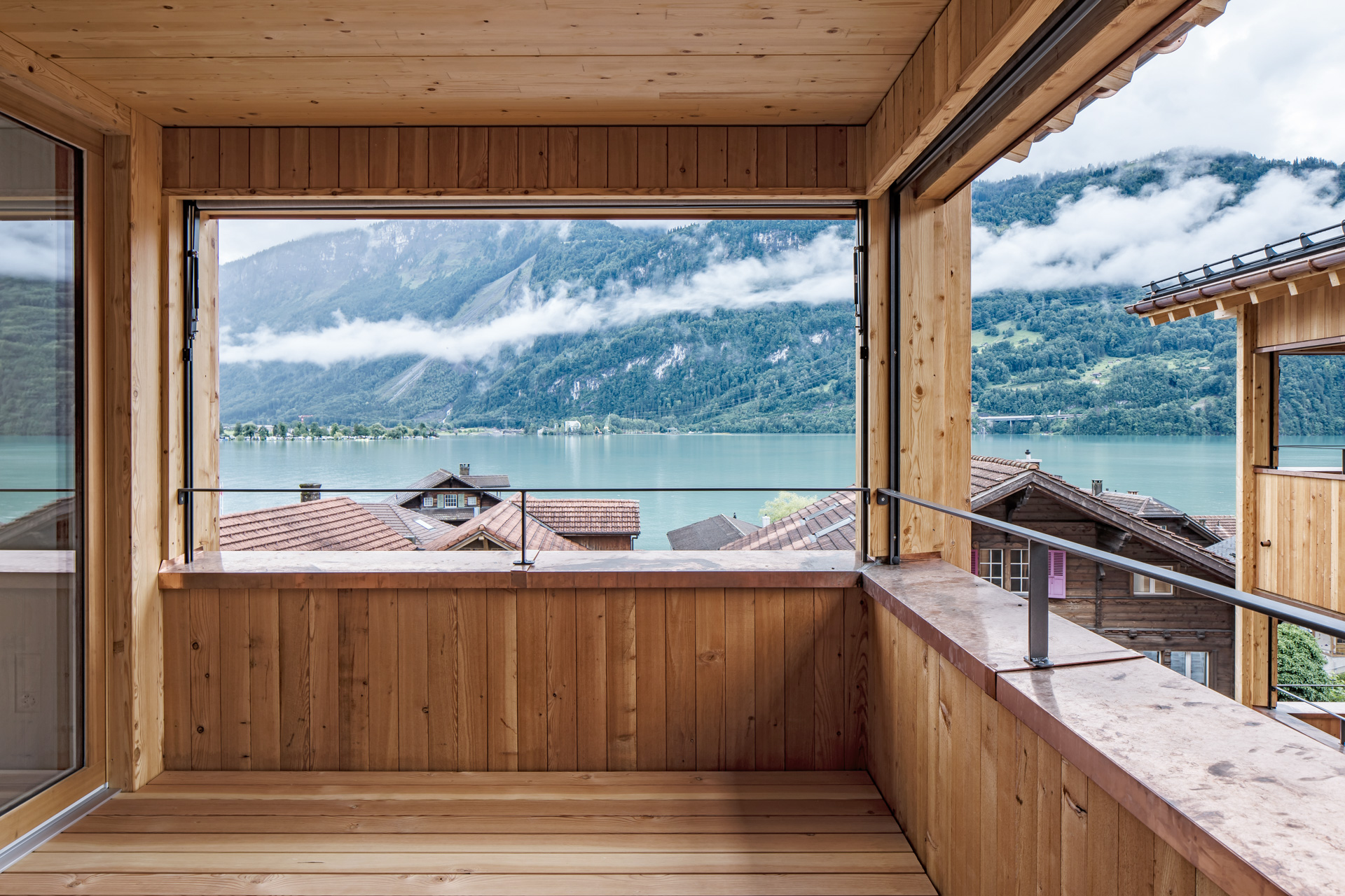 Das Gebäudeensemble lebt durch die Gegensätze Enge und Weite, Stein und Holz, Introvertiertheit und Ausblick. Die Häuser sind eng gesetzt, erzeugen dadurch ein Gefühl von Urbanität. In der Wohnung ist dann mit Blick auf den See die Weite erlebbar.