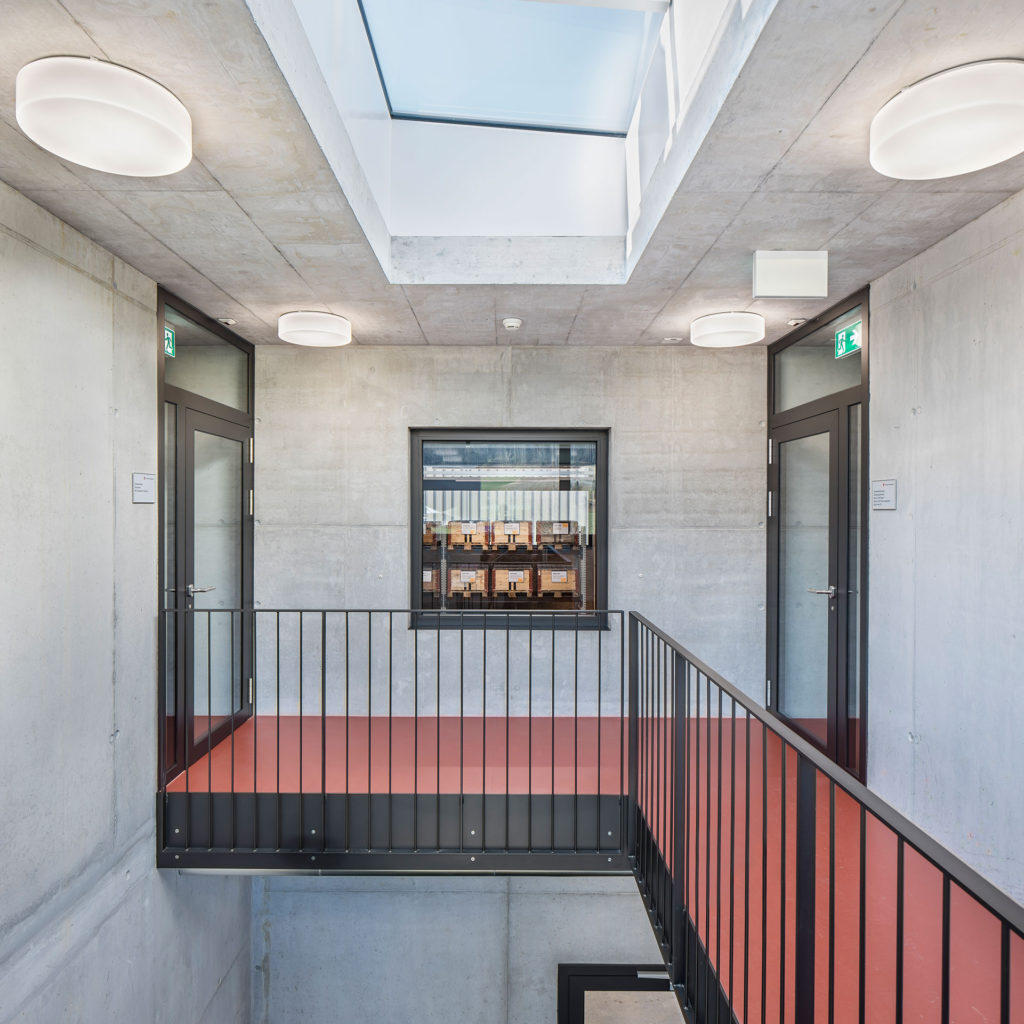 Die Materialisierung ist industriell, einfach und zweckmässig. Wo möglich wird mit den rohen Oberflächen der Konstruktion gearbeitet. Arbeitsräume, insbesondere die Büros werden mit hellen Farben und Lasuren aufgehellt.