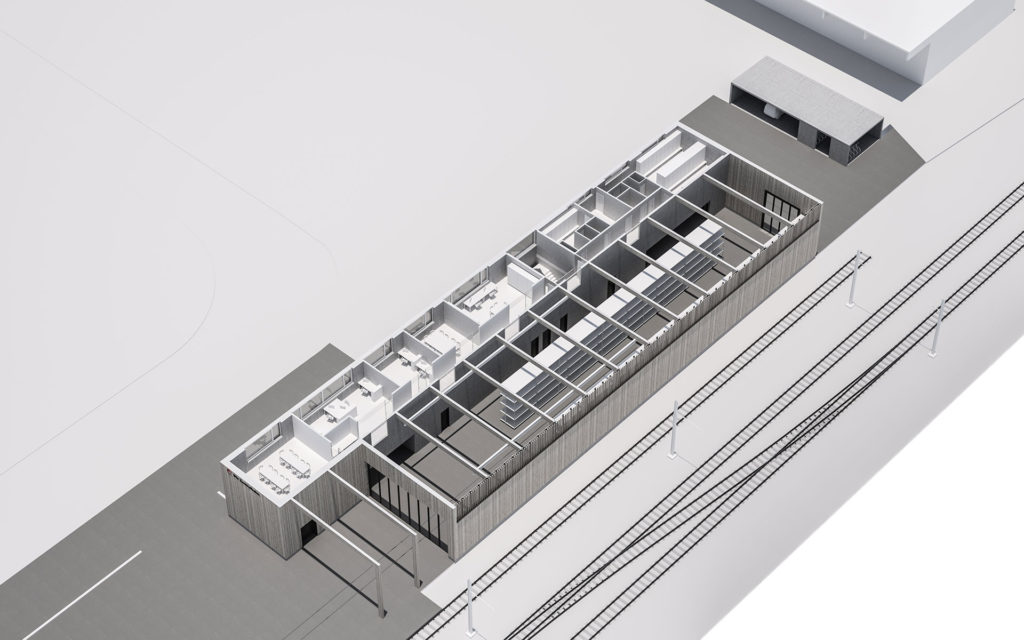 Heute befindet sich der Stützpunkt Unterhalt Nord in Stansstad und verteilt sich in verschiedene Räumlichkeiten auf dem ganzen Areal auf. Aus logistischen- und Platzgründen ist ein Neubau in Kerns-Kägiswil angedacht. Mit diesem Projekt werden die Anforderungen an den neuen Unterhaltsstützpunkt NORD, Kerns-Kägiswil erarbeitet und in Form eines Pflichtenhefts zusammengefasst. Die längliche Grundform der Parzelle suggeriert einen ebenfalls länglichen Bau parallel zu Strasse und Bahn. Während der westliche Teil des Grundstücks mit dem Gebäude belegt wird, dient der östliche Teil als Umschlag- und Lagerplatz mit Anschluss an die Gleisanlage. Das Gebäude wird so organisiert, dass sich gleisseitig die ‘Lager- und Einstellhalle für Schienenfahrzeug’ befindet. Diese hat über ein Falttor direkten Zugang zum Umschlag- und Lagerplatz. Im Erdgeschoss werden Nebenräume wie Kleinteil- und Flüssigkeitslager, Werkstatt, Garage und Technikräume an die Halle angegliedert. Über ein Treppenhaus beim Haupteingang sind Garderoben, Aufenthalts- und Büroräume im Obergeschoss zugänglich. Durch die südseitige Platzierung der Büroarbeitsplätze befinden sich diese fernab der Fahrleitungen und werden optimal beleuchtet.