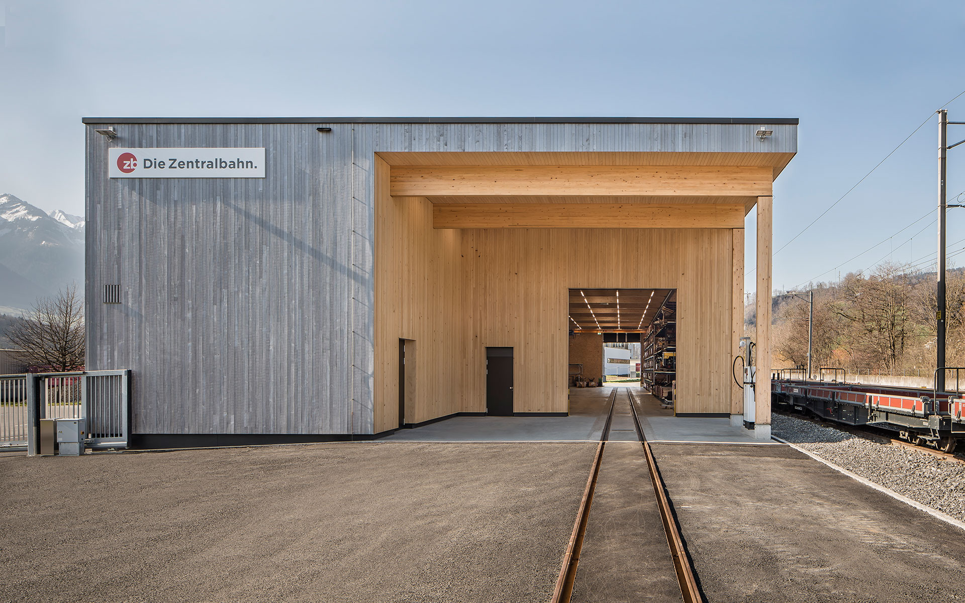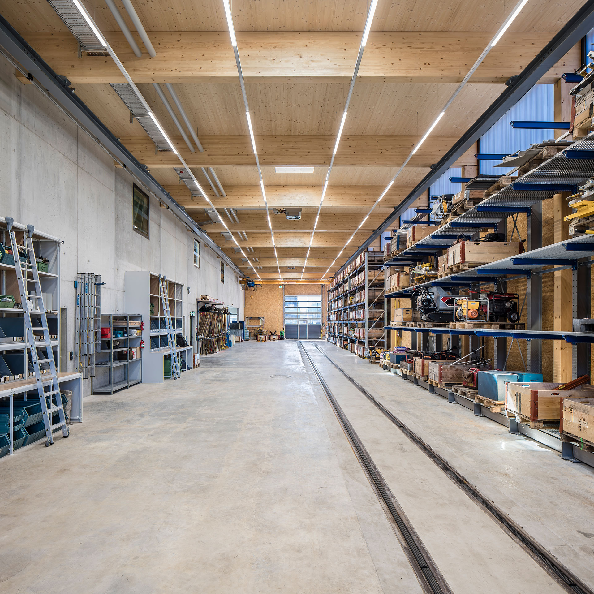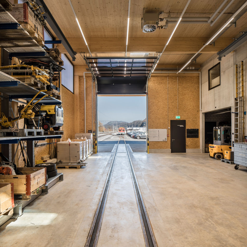 Organisation, Zweck und Funktion definieren die Architektursprache. Die Lager- und Einstellhalle ist geprägt von einer regelmässigen und reduzierten Holzkonstruktion. Die leichte Konstruktion erlaubt es unter dem Dach, über den Regalen ein Oblichtband anzuordnen, welches die Halle natürlich beleuchtet. Neben-, Technik-, Garderobe und Büroräume werden in einer Betonhülle gefasst. Diese verkürzt die Trägerspannweiten in der Halle und begünstig den Brandschutz. Gefasst werden die Gebäudeteile in einer gemeinsamen Holzhülle.