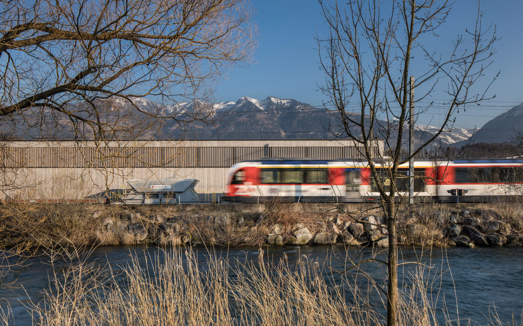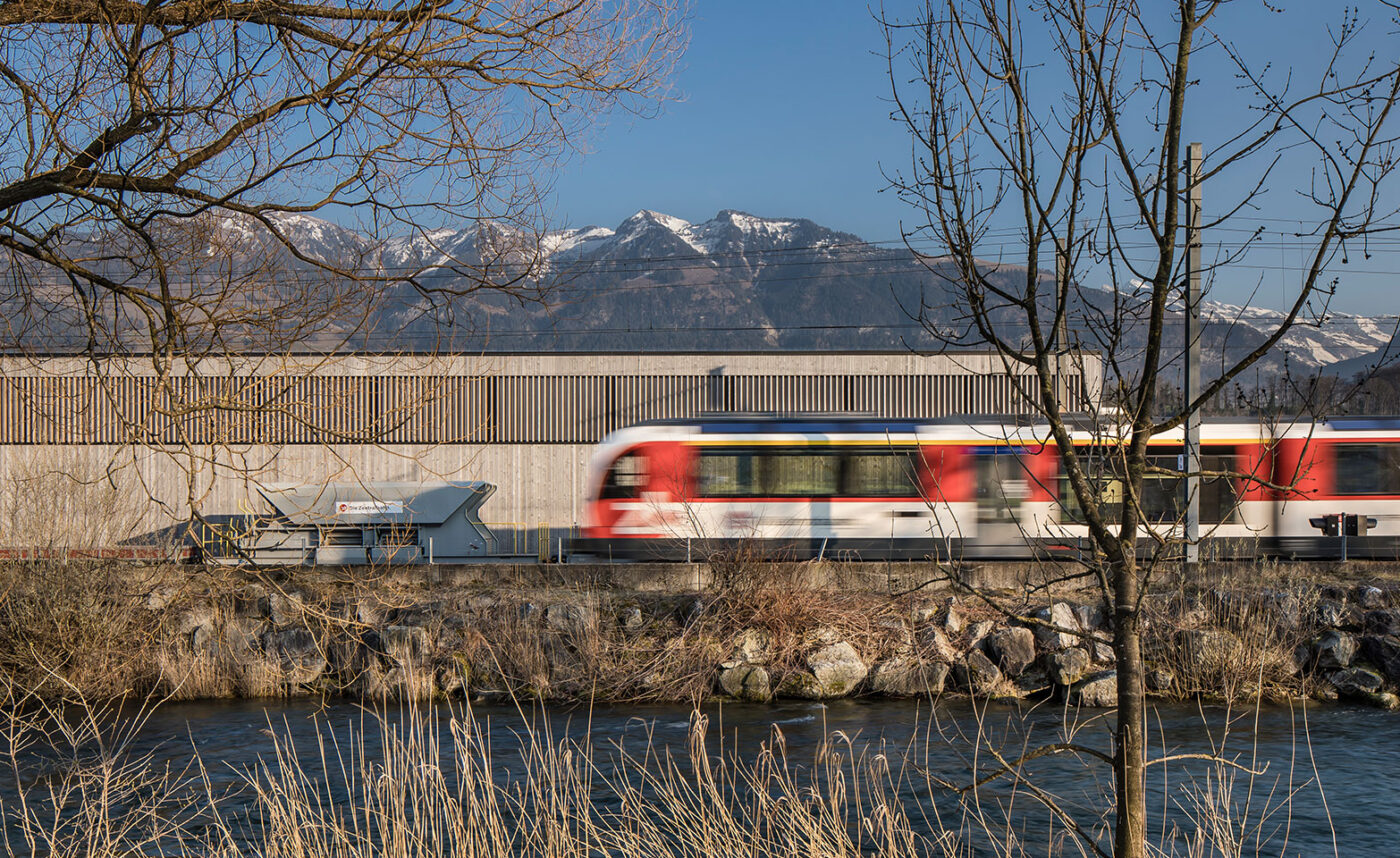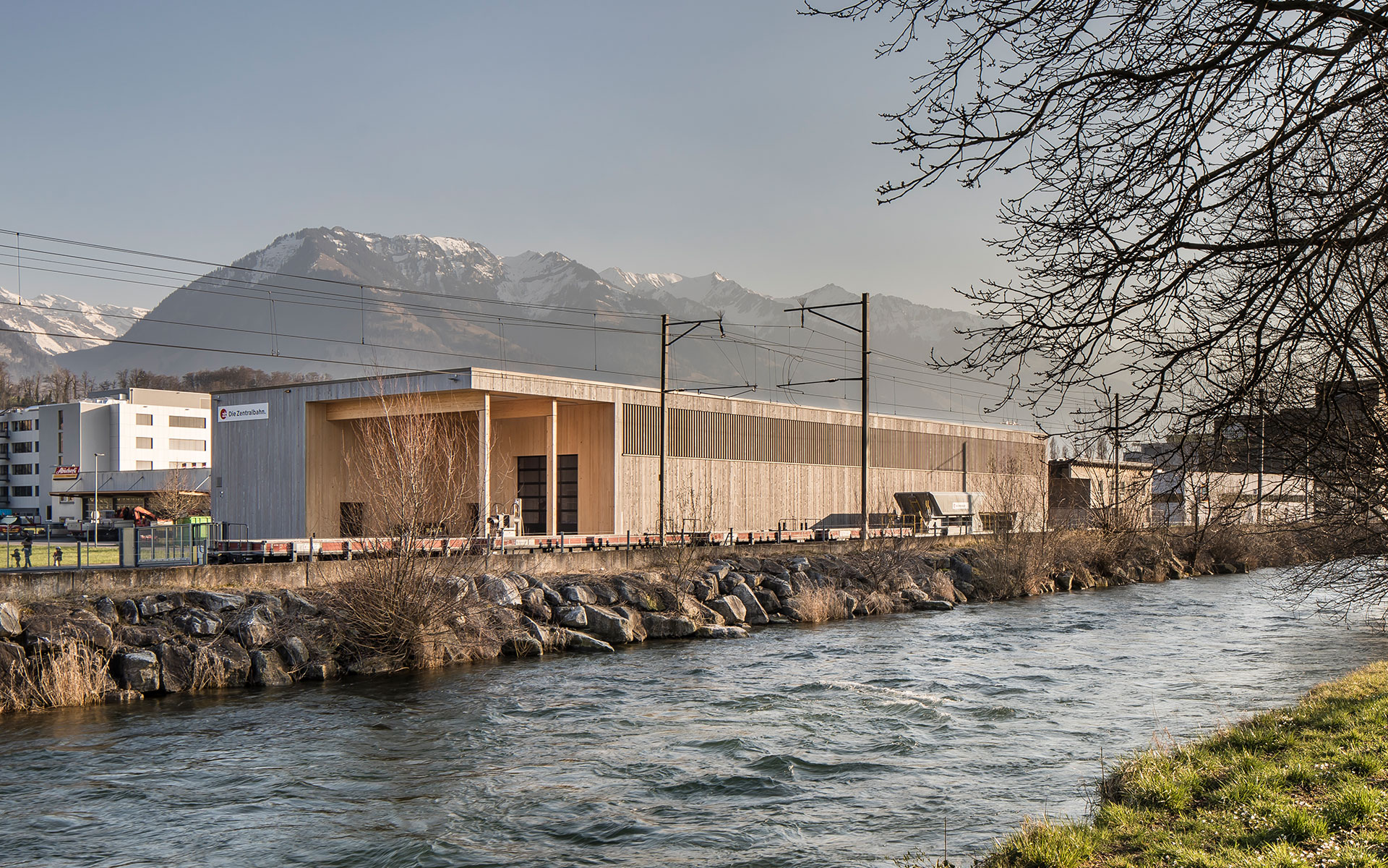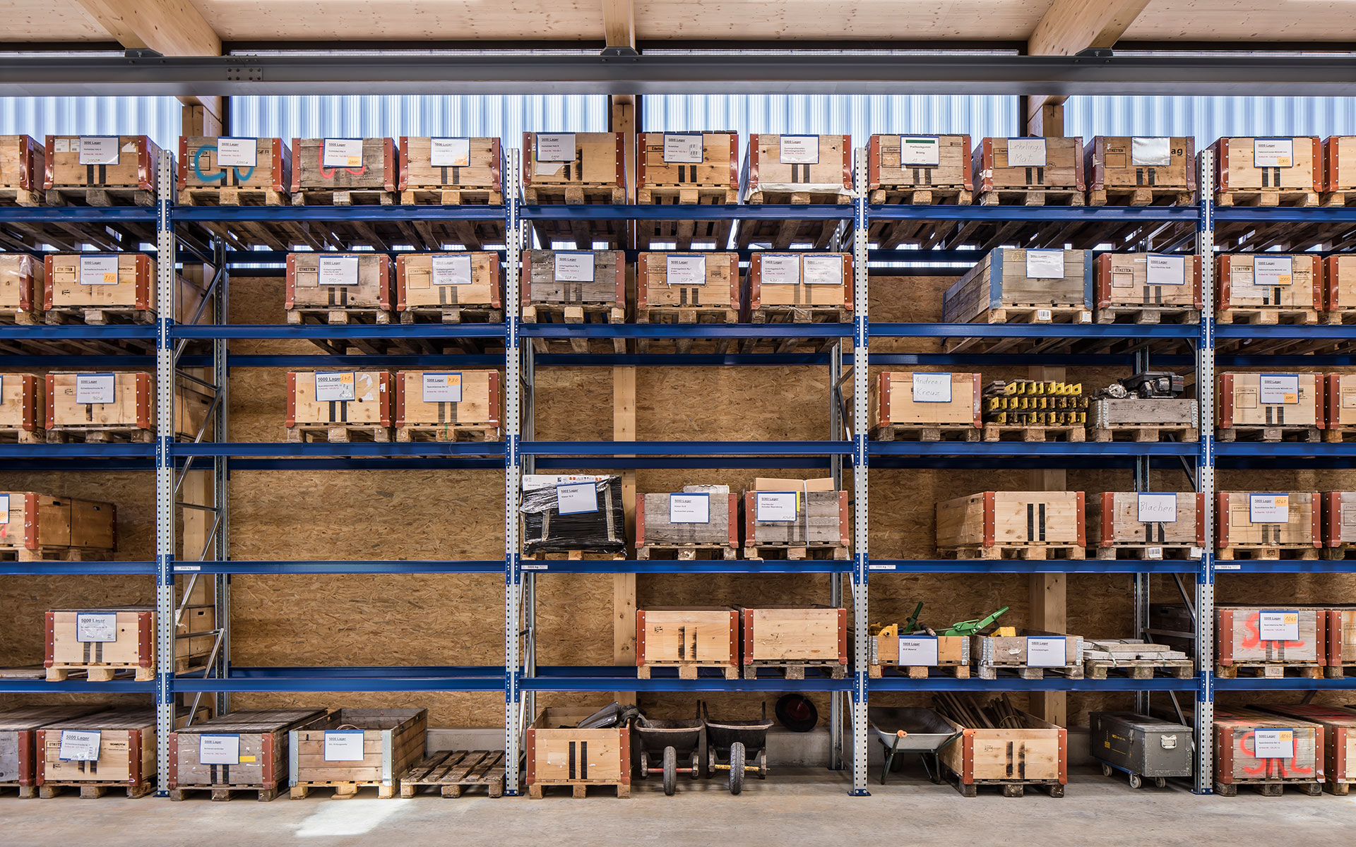 Organisation, Zweck und Funktion definieren die Architektursprache. Die Lager- und Einstellhalle ist geprägt von einer regelmässigen und reduzierten Holzkonstruktion. Die leichte Konstruktion erlaubt es unter dem Dach, über den Regalen ein Oblichtband anzuordnen, welches die Halle natürlich beleuchtet. Neben-, Technik-, Garderobe und Büroräume werden in einer Betonhülle gefasst. Diese verkürzt die Trägerspannweiten in der Halle und begünstig den Brandschutz. Gefasst werden die Gebäudeteile in einer gemeinsamen Holzhülle.